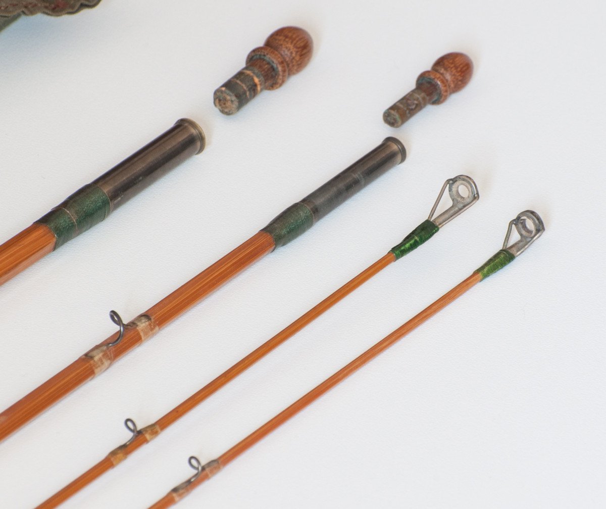 For sale here is a scarce Hardy Palakona "The Marvel" bamboo rod. 7 1/2 feet, three sections with two tips, for a four or five weight line. The rod is in excellent condition. All sections are full-length and straight. Transparent silks. Aluminum cap and ring over all-cork reel seat. Serial number H2822 made in 1955. Complete with wooden ferrule plugs as well as aluminum male ferrule protectors. Comes with its original Hardy bag and tube.
