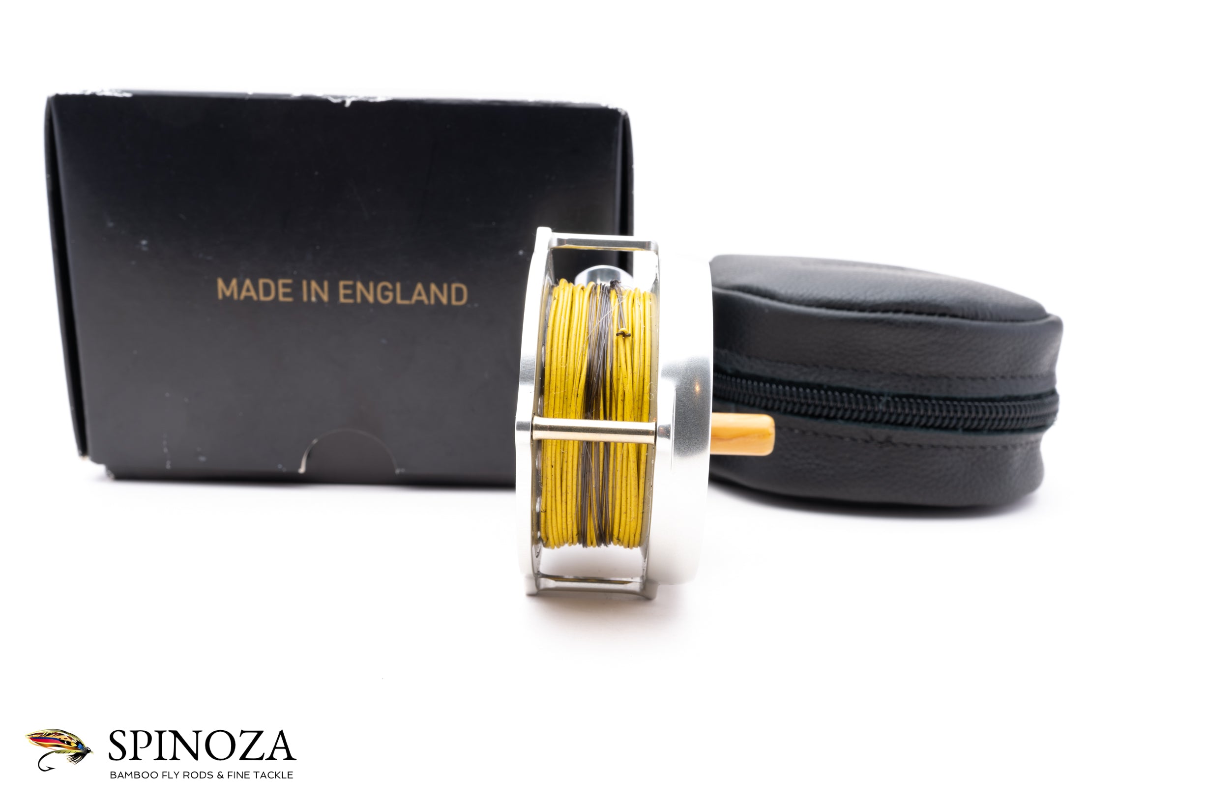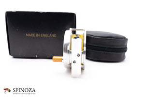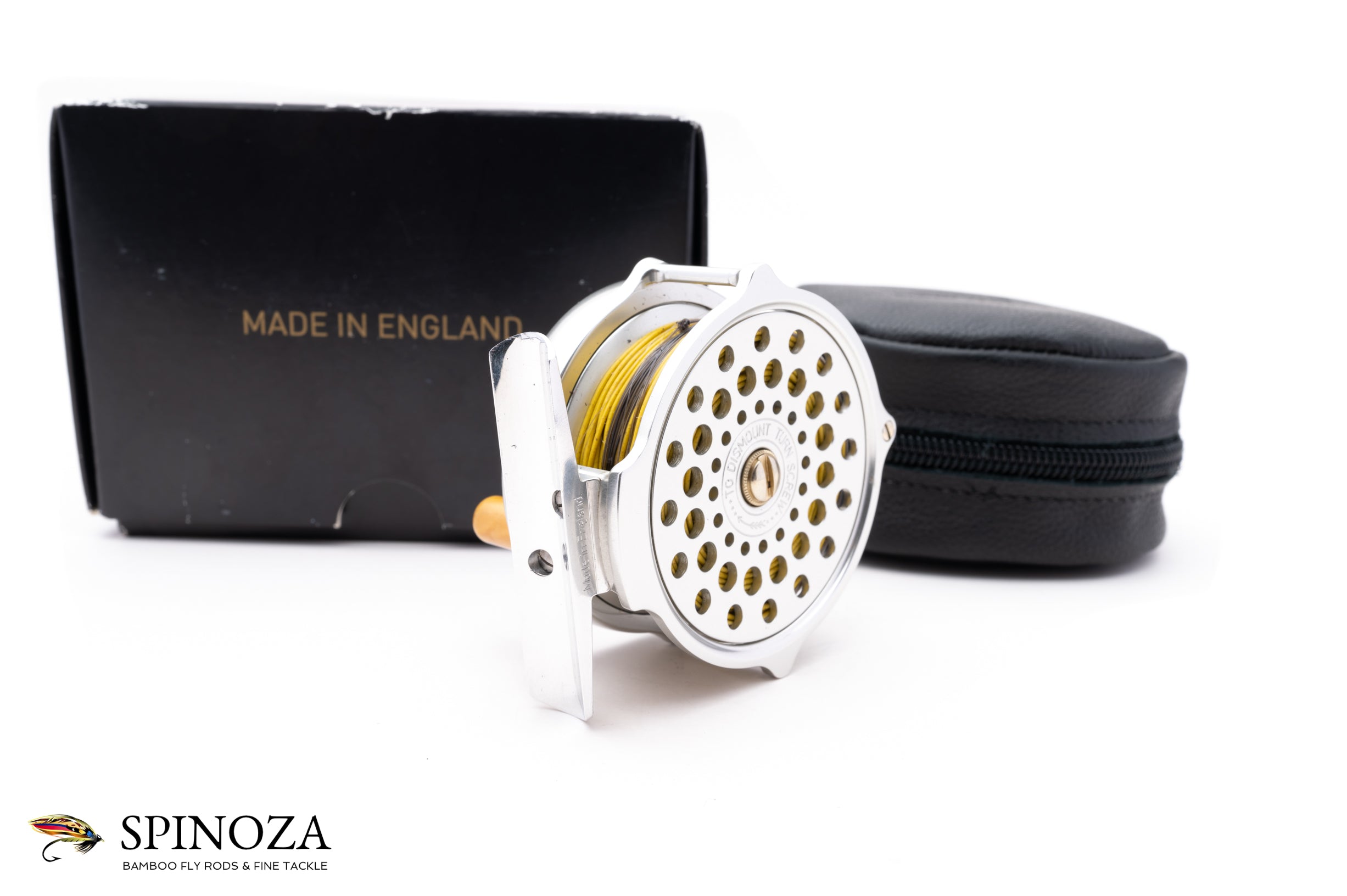 A Hardy Baby Bougle reel, measuring 2 13/16" diameter and 1 9/32" wide. Set up for LHW. Serial #A53933. The reel is in near mint condition with just a few tiny mounting marks on the foot but very clean otherwise. It has a line currently loaded on it. Classic raised pillar design with all silver anodized construction. Ivorine handle. The reel comes with the original black leather fleece-lined pouch with the original box and paperwork.