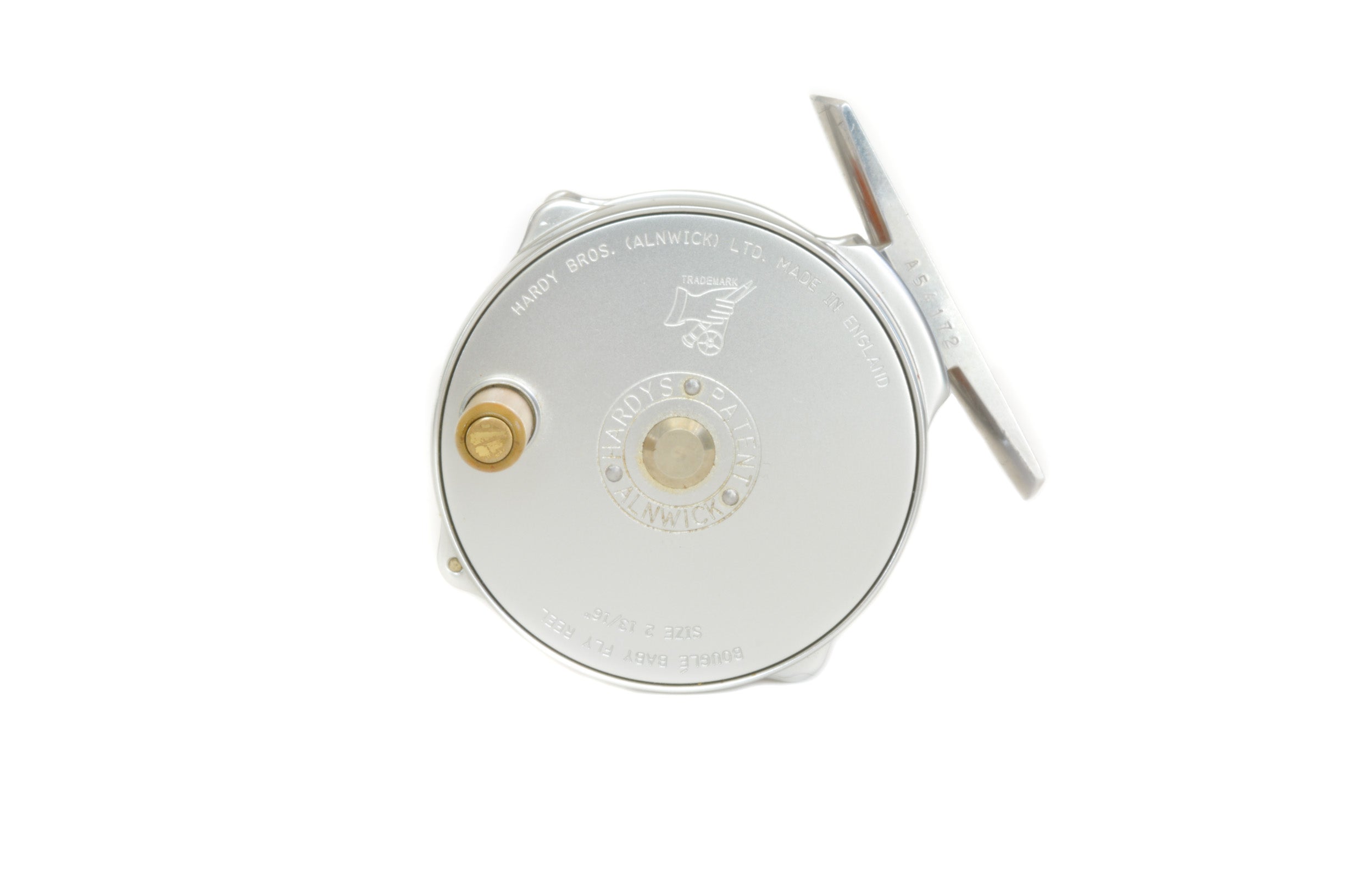 A Hardy Baby Bougle reel, measuring 2 13/16" diameter and 1 9/32" wide. Serial #A54172. Weighs 4.8oz on my scale, though this includes a 2 wt Terenzio silk line (in like new condition) and a furled leader which are currently wound on it. This reel is in near mint condition with a minute bit of scuffing where the cap and ring contacted the foot. No other major signs of use. All silver anodized construction. Also included is a hardy logo fleece-lined pouch.