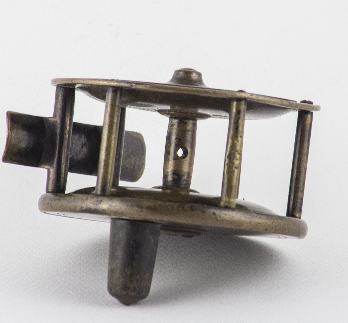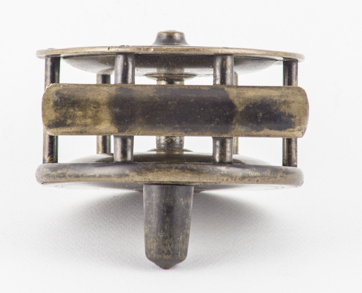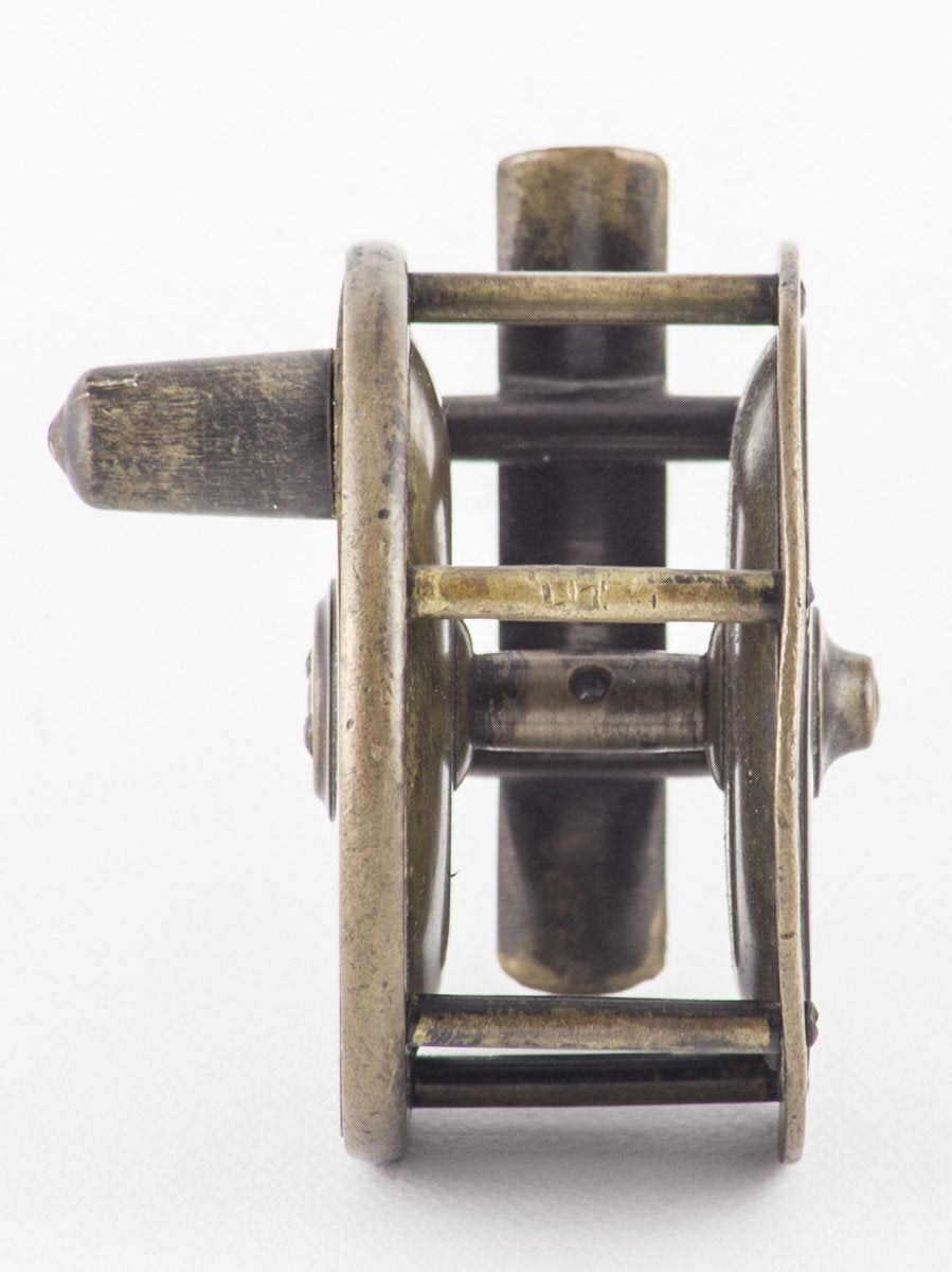 For sale here is a Hardy Birmingham fly reel. A brass plate wind reel with a 3 1/4" diameter with oval Hardy logo. With constant check and bone handle grasp, in fair condition. There's a bend to one end of the reel foot and the clicker doesn't work : (