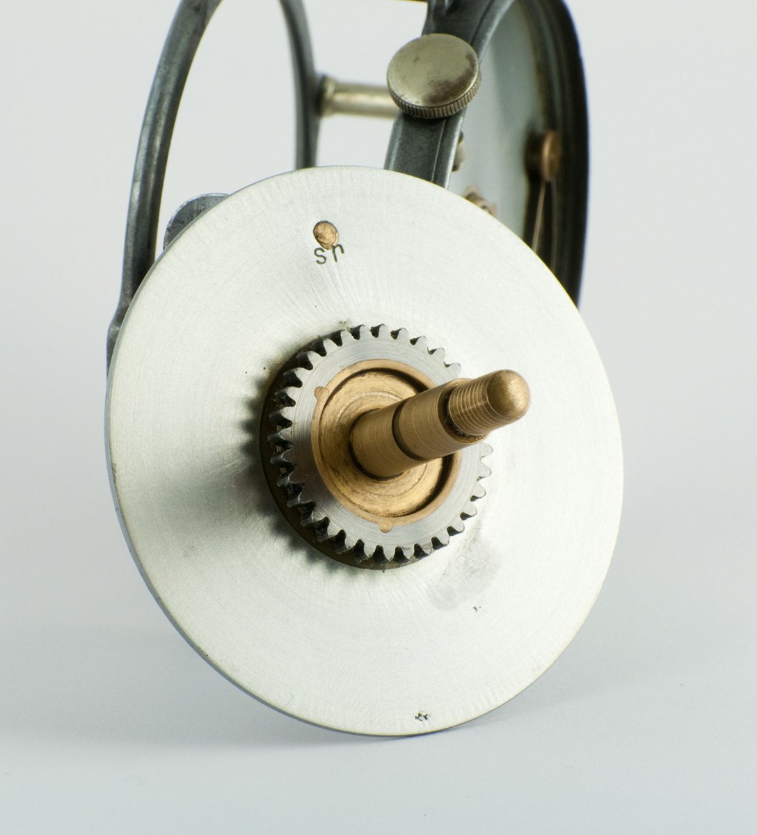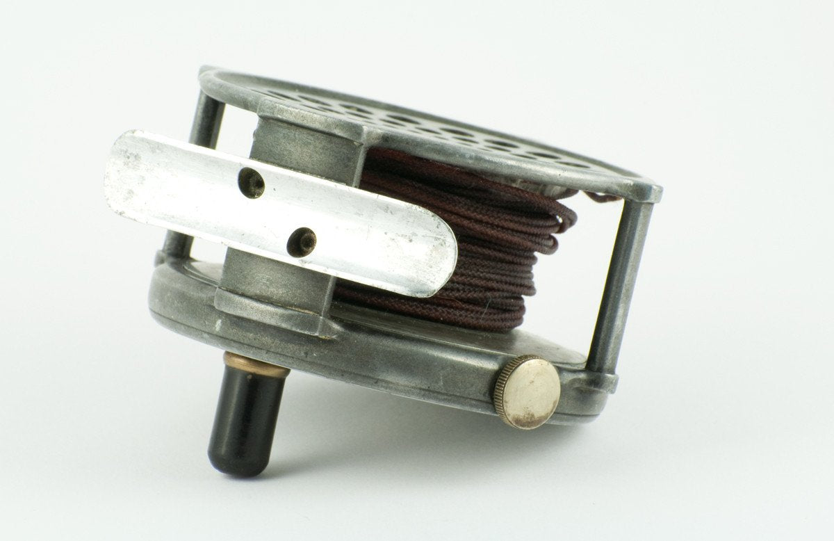 For sale here is an extremely scarce, original Hardy Bougle fly reel in excellent condition. 3 1/4" diameter. Duplicated MKII check. Full-length and unaltered ribbed alloy foot, slightly and neatly filed on one side. The original ebonite handle remains in sound and free-spinning condition. The nickel silver rim tension regulator screw works perfectly. Mechanically the reel remains in excellent condition with minor end play. No cracks/dings/chips anywhere on the reel. Stamped "JS" for maker Jimmy Smith. Don't miss out on this one!