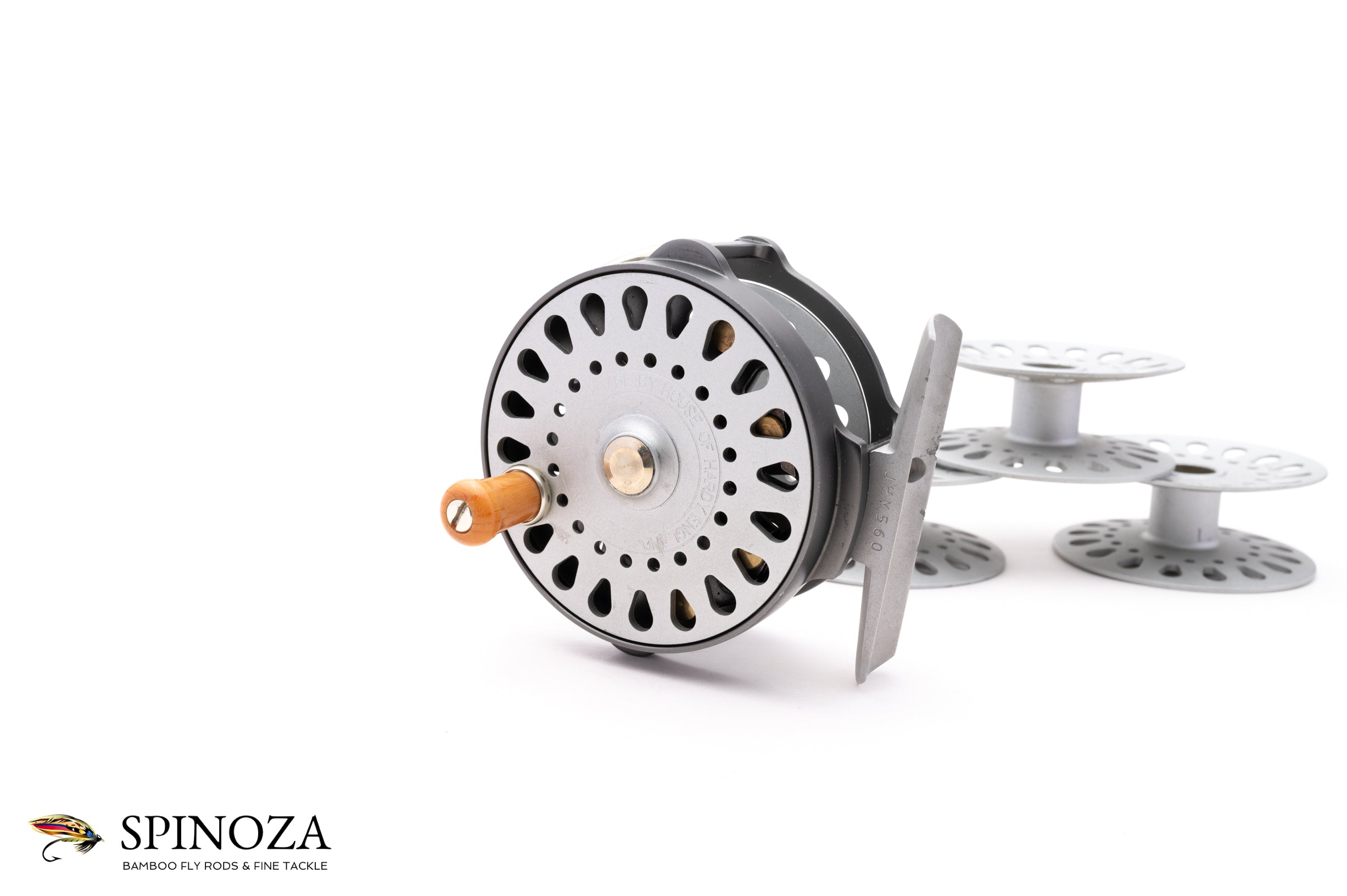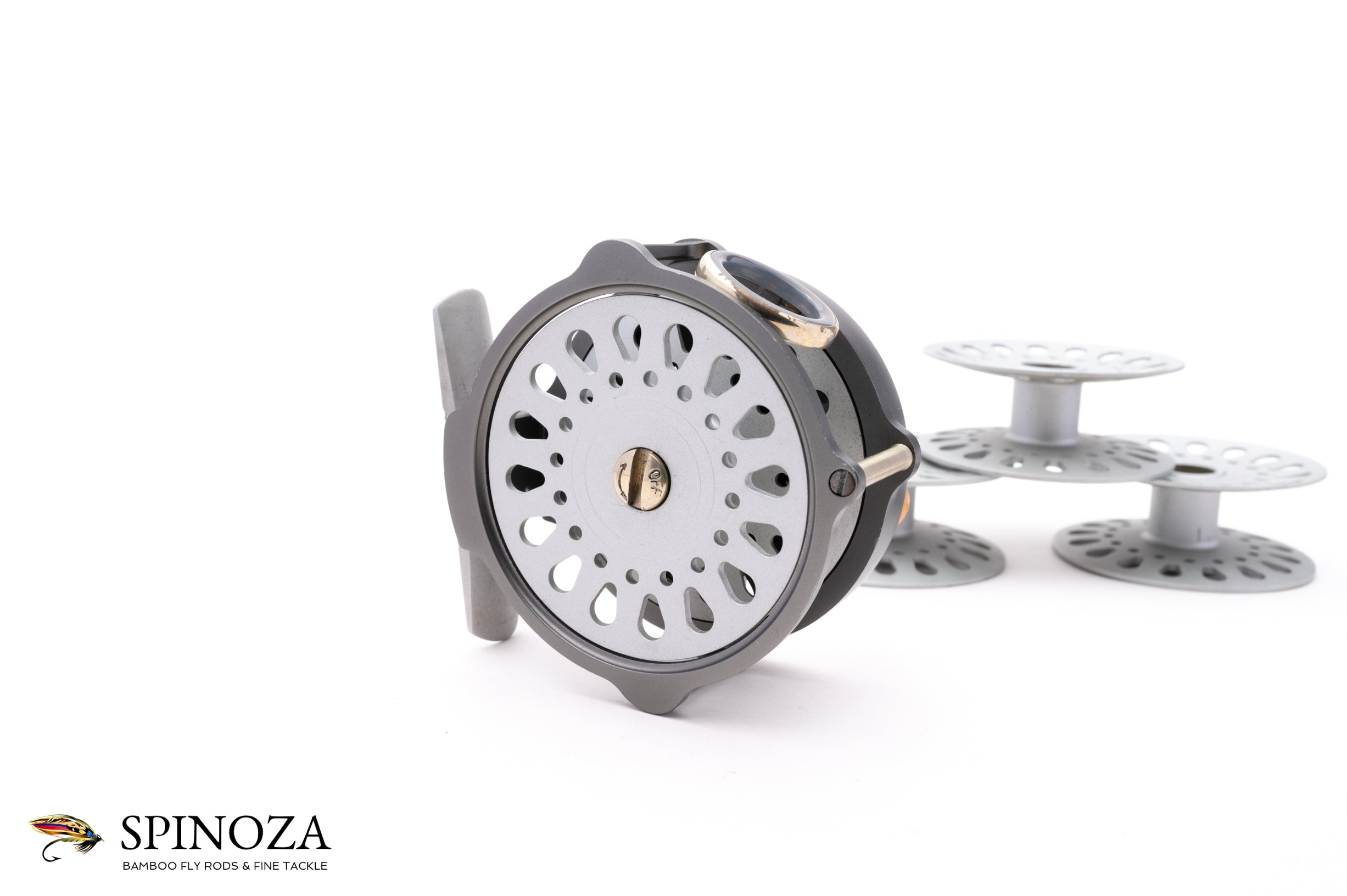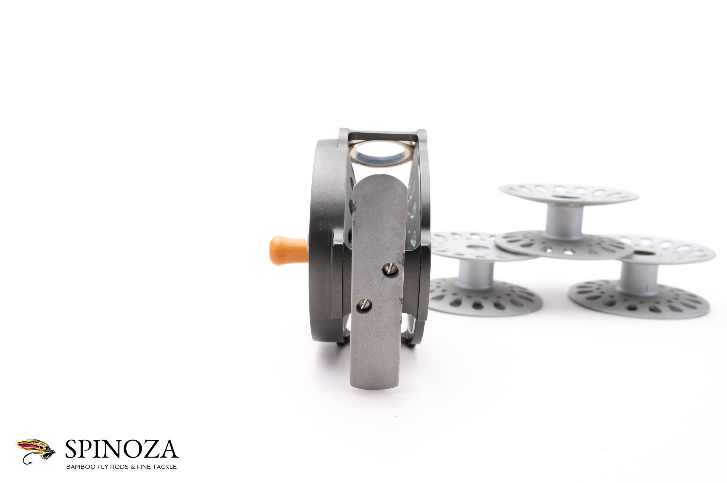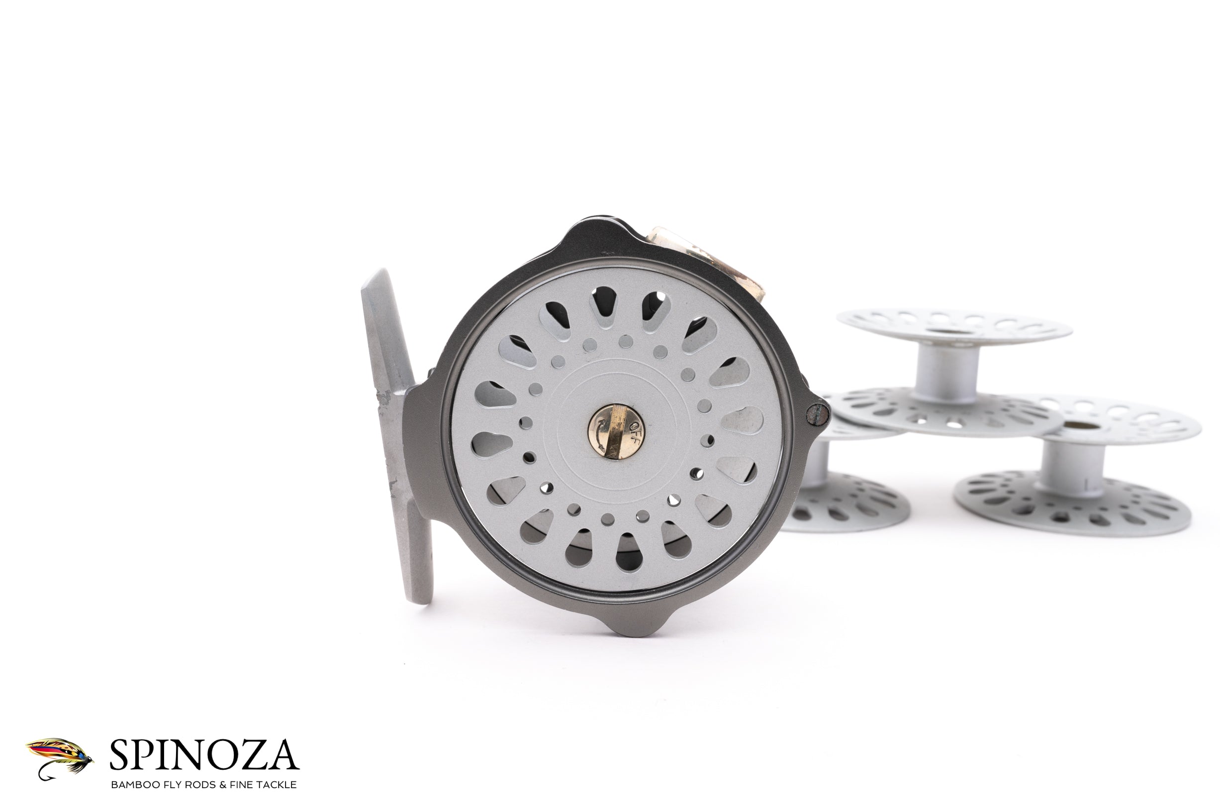 An excellent Hardy Bougle Agate I fly reel with three spare spools, set up for LHW. 2 1/2" diameter with a 3/4" approximate spool width. 3.8 oz on my scale with capacity for a DT3 + 40 yards of backing. A fun light line reel, this one is in good lightly used condition with some minor cosmetic wear throughout (there is a nick on the edge of the reel foot in one area but it shouldn't affect the way it seats). Dark gray anodized frame, silver frost for the spools. The reel foot is polished aluminum. Pristine purple/grey agate. I believe these were originally made for the Japanese market and are very difficult to come by, especially this small model. To my knowledge this is the only Bougle that hardy has ever made with an agate lineguard. Nice little reel.