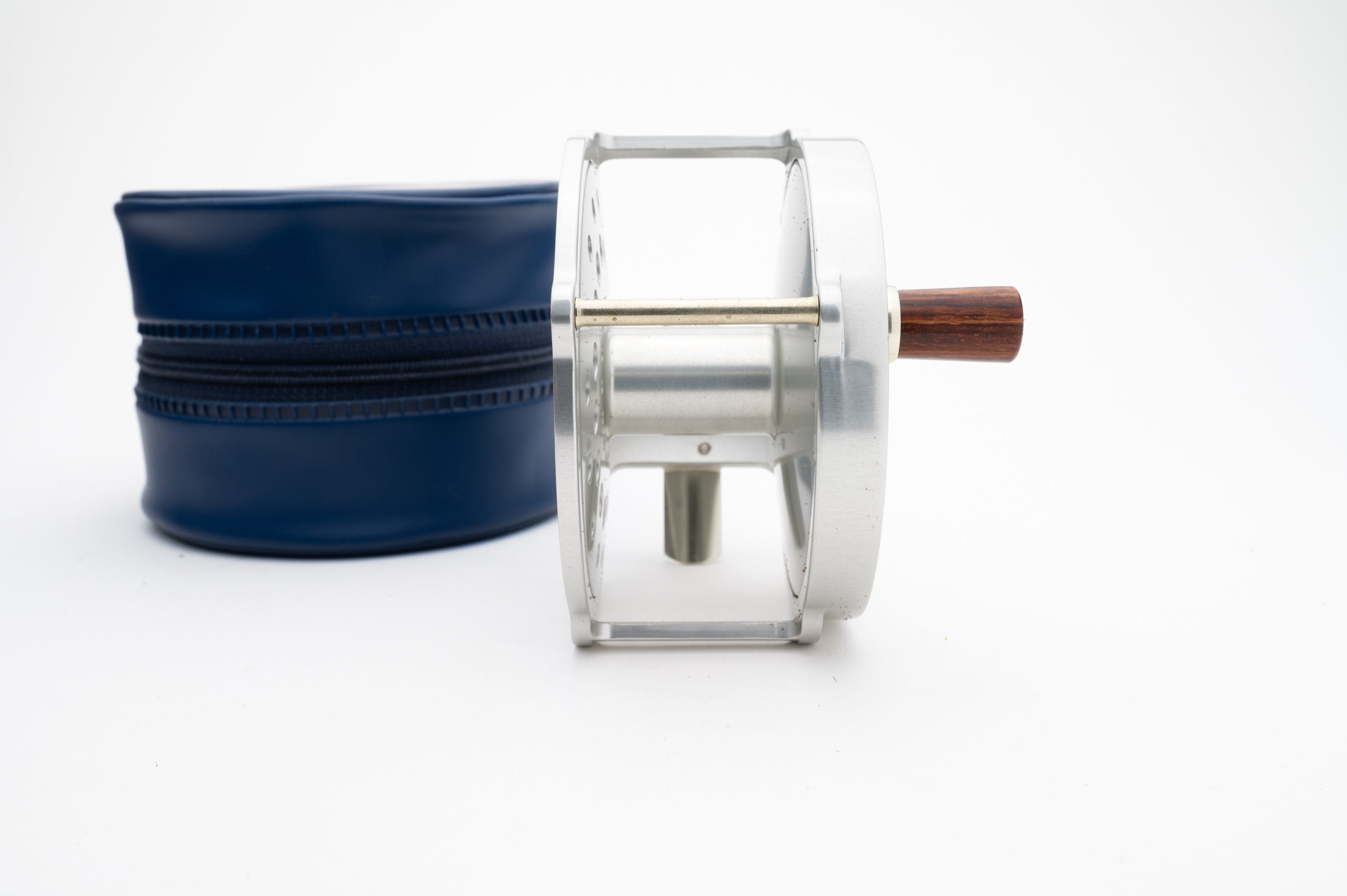 A nice Hardy Salmon Bougle 4" MKIV fly reel. Made in England. Mint condition. Currently set up for LHW but easily convertible. Comes in blue vinyl Hardy case.