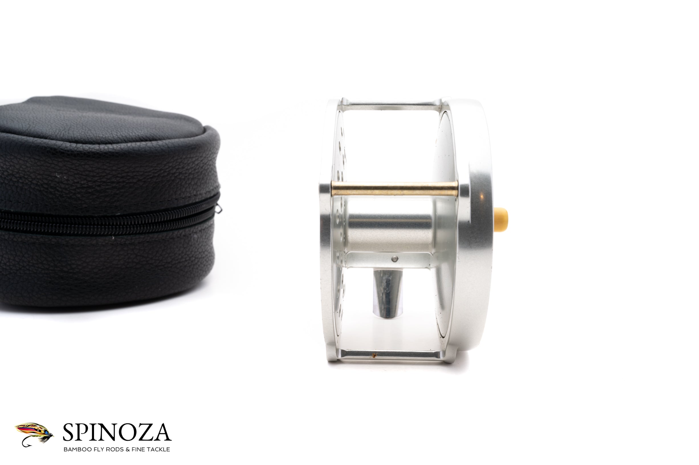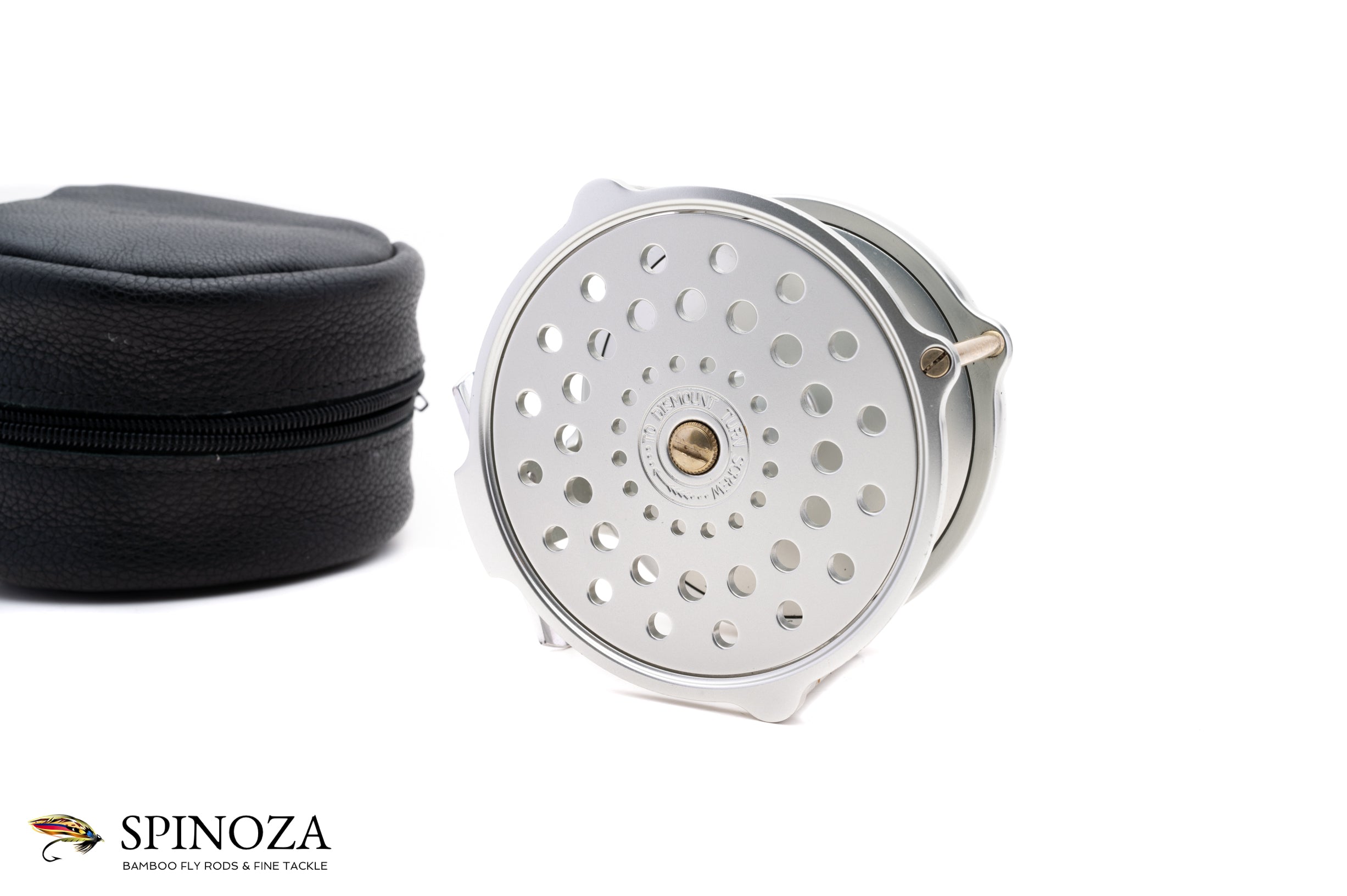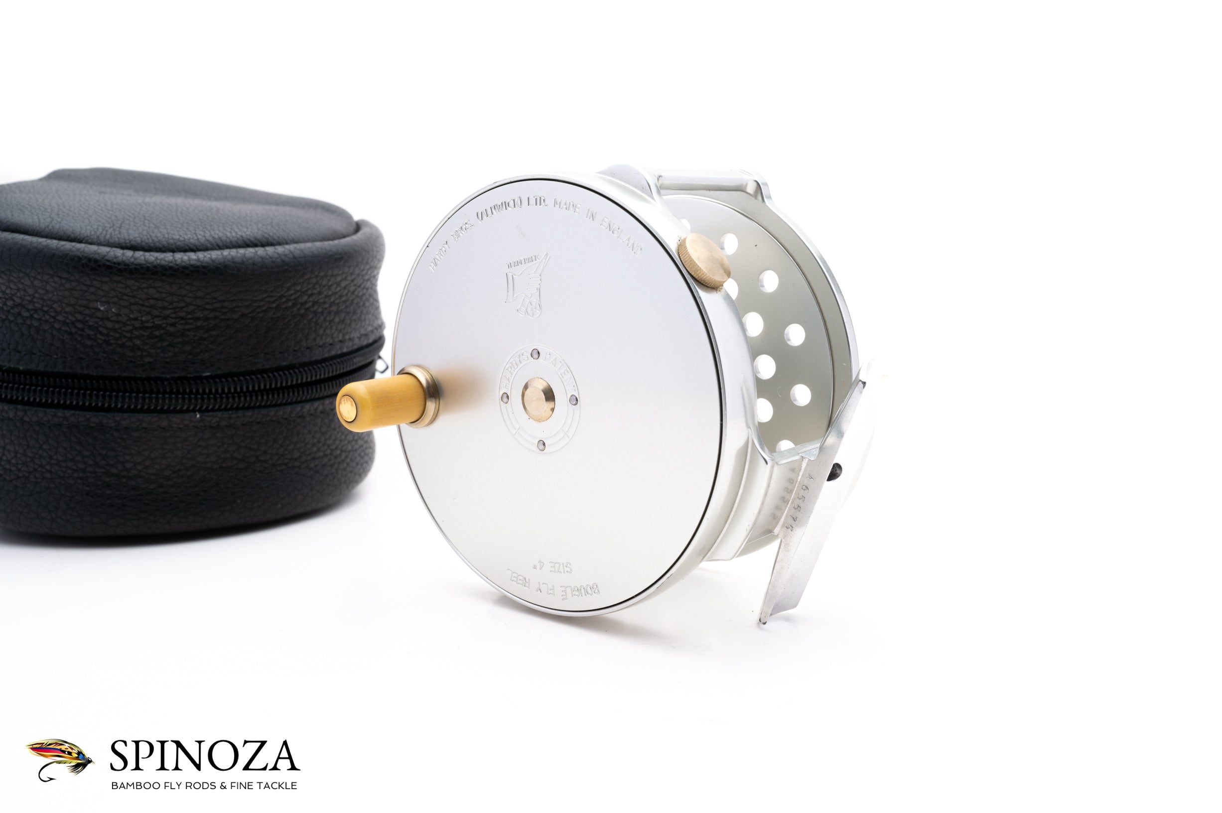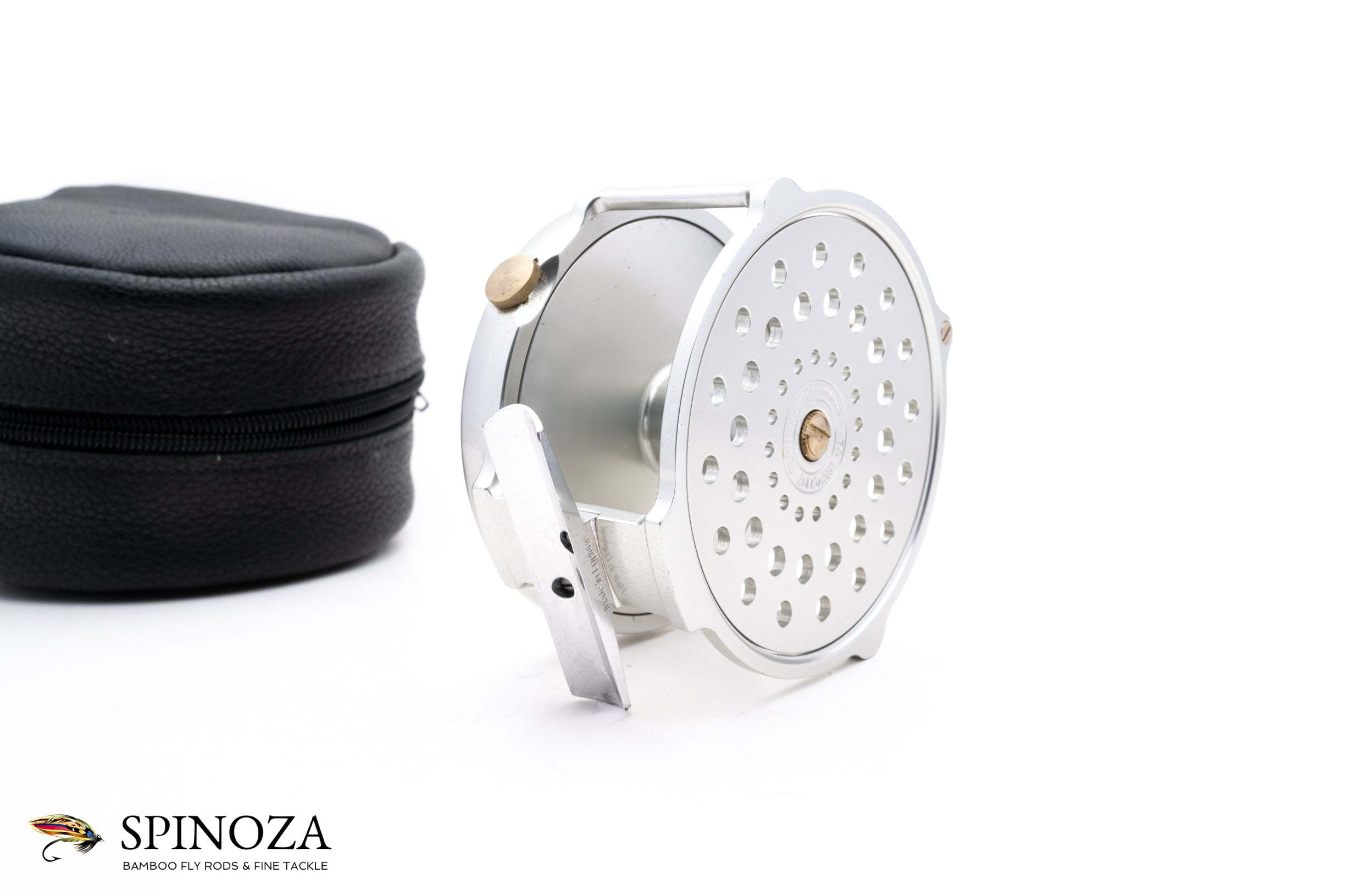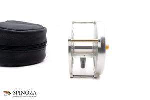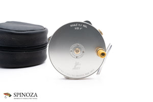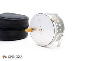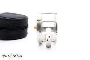 A nice Hardy Salmon Bougle 4" salmon reel. Made in England. Mint condition. Currently set up for LHW but easily convertible. Silver anodized throughout. A great rendition of this raised pillar model. The reel packs into a black leather zip pouch.