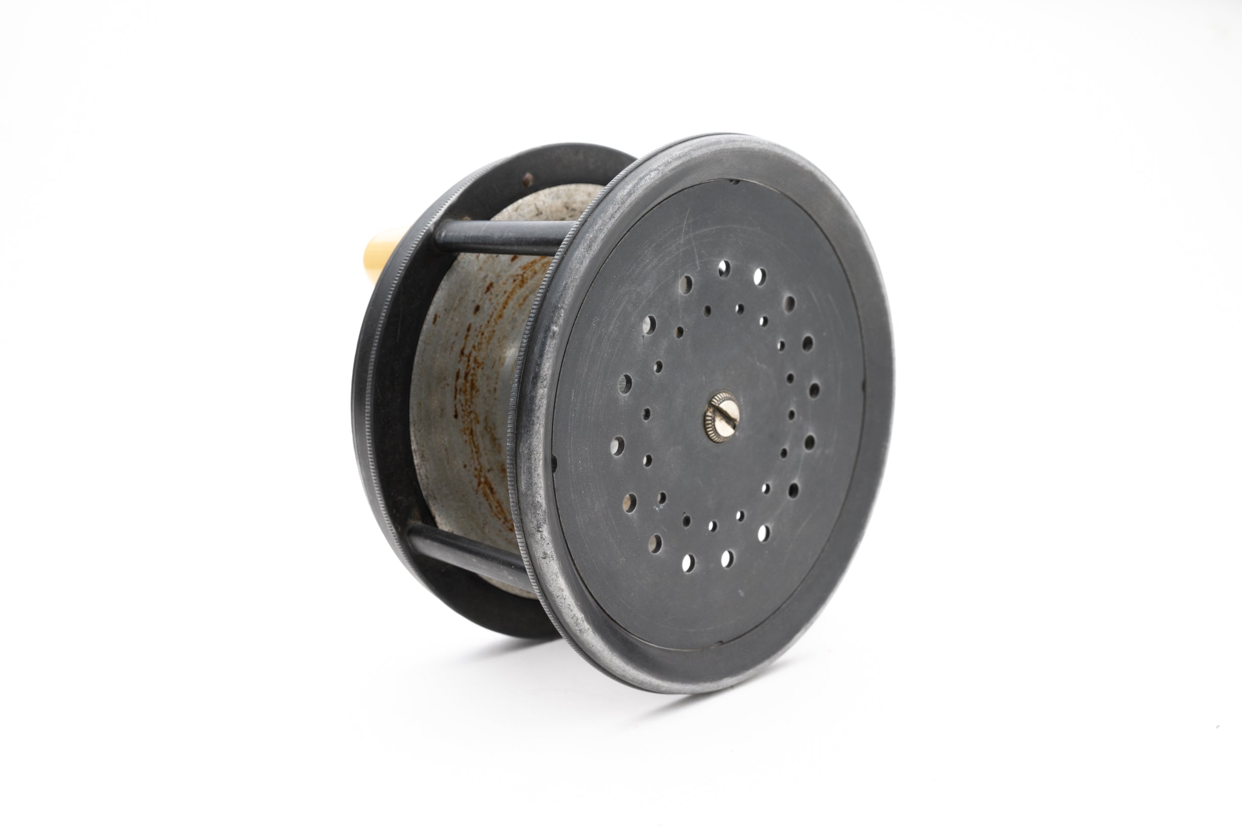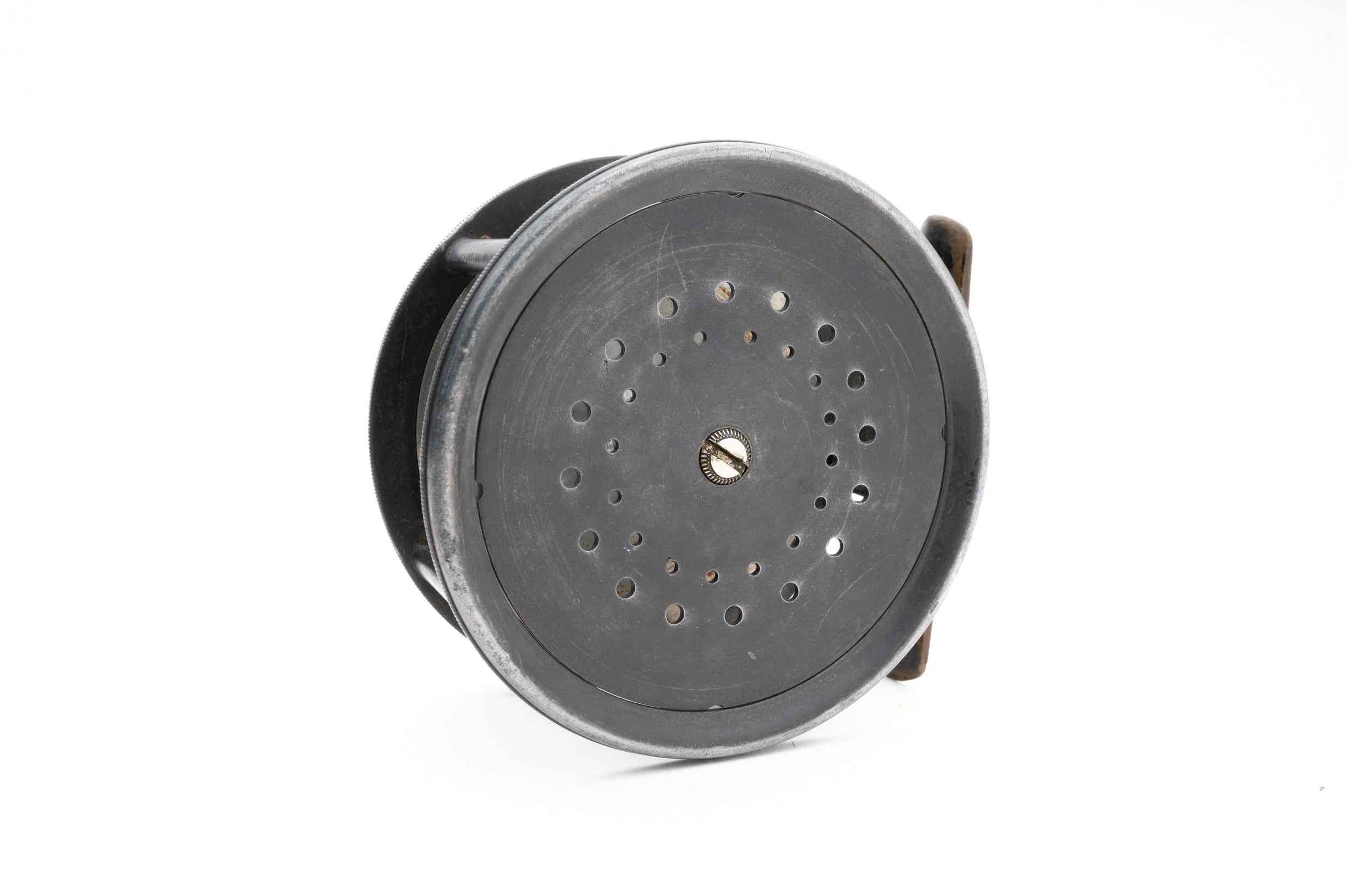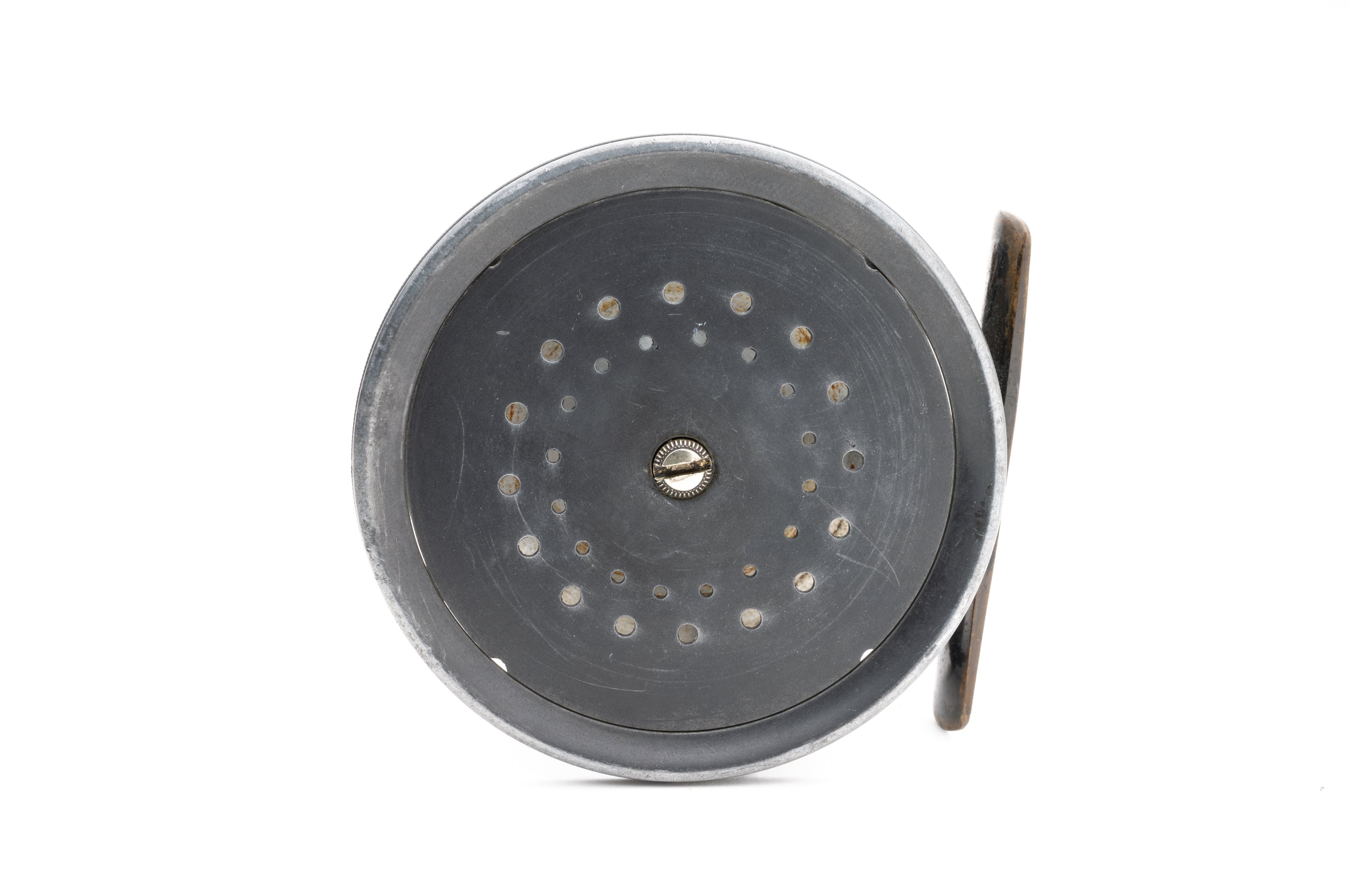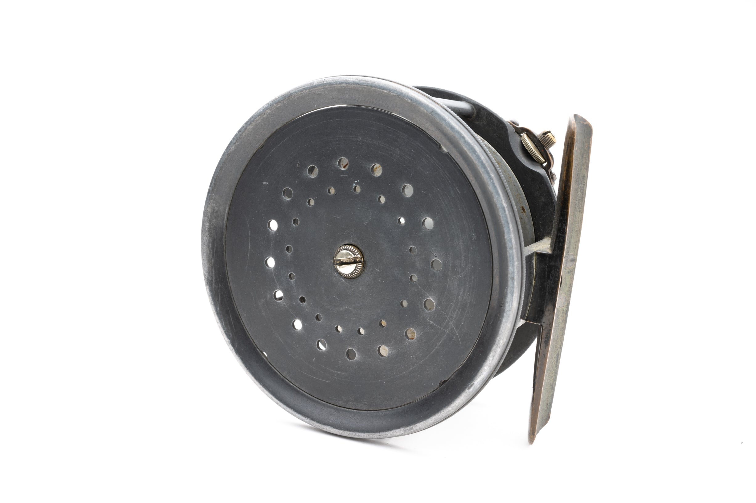 A very nice Hardy Brass Face wide drum perfect in a rare 4 1/4" size. 1905 check. Brass face with rod-in-hand logo and "Hardy's Pat 'Perfect Reel'" straight line logo on opposing sides. White ivorine handle spins freely. "Turk's head" style tension adjuster in excellent shape. Nice patina on the frame which is in great shape overall with normal expected use but free of defects. Knurled inner edge on the frame. The pillars are in excellent shape and free of line grooves. Very tight ported spool with no wobble. Great springs which offer a loud, satisfying click. Smooth brass foot. No case or pouch. A very nice reel here.