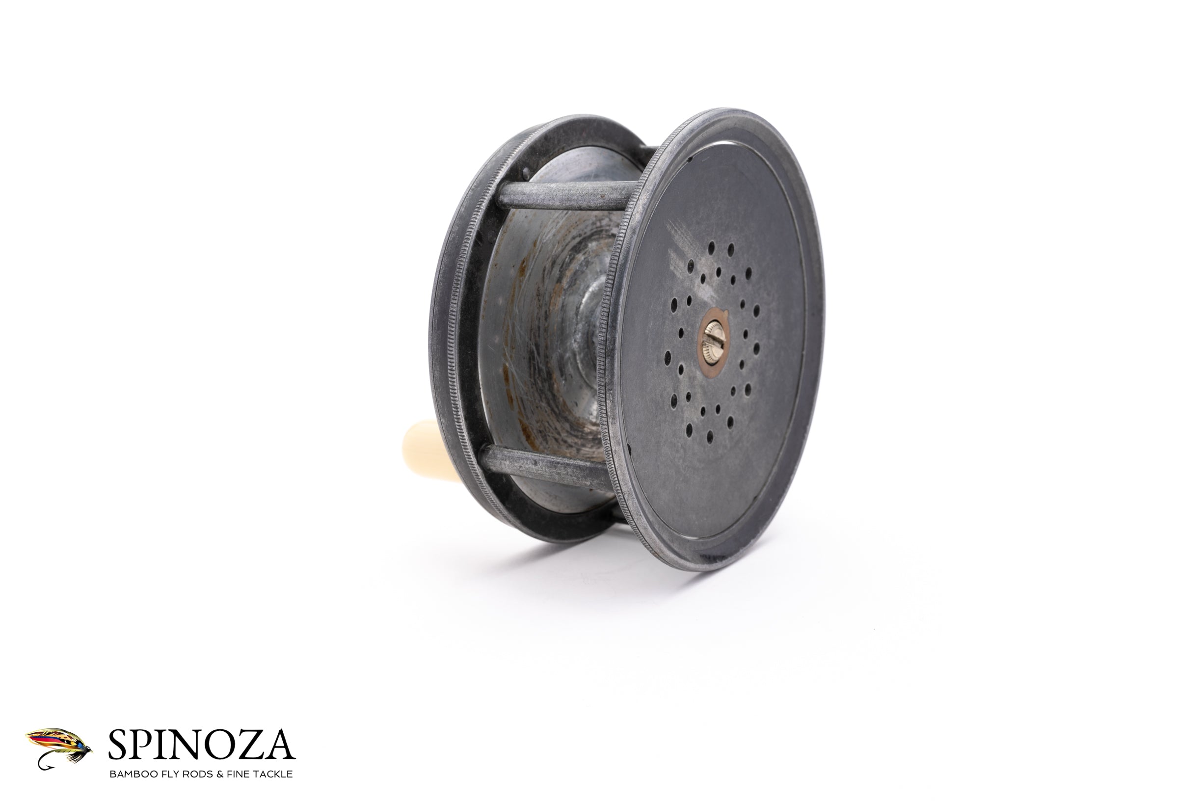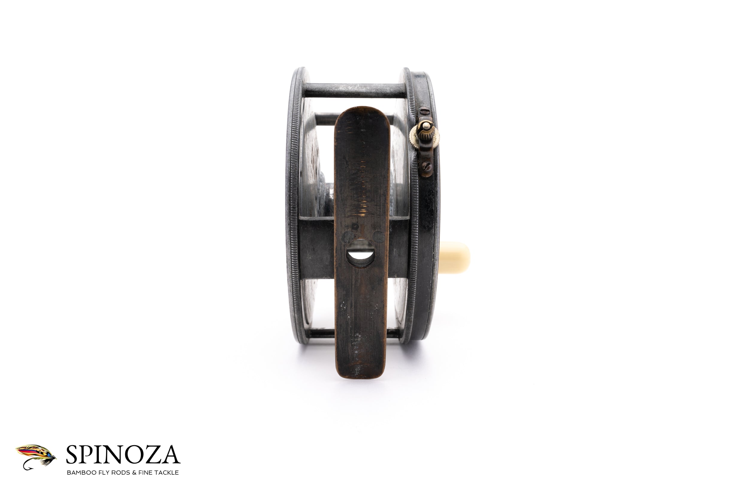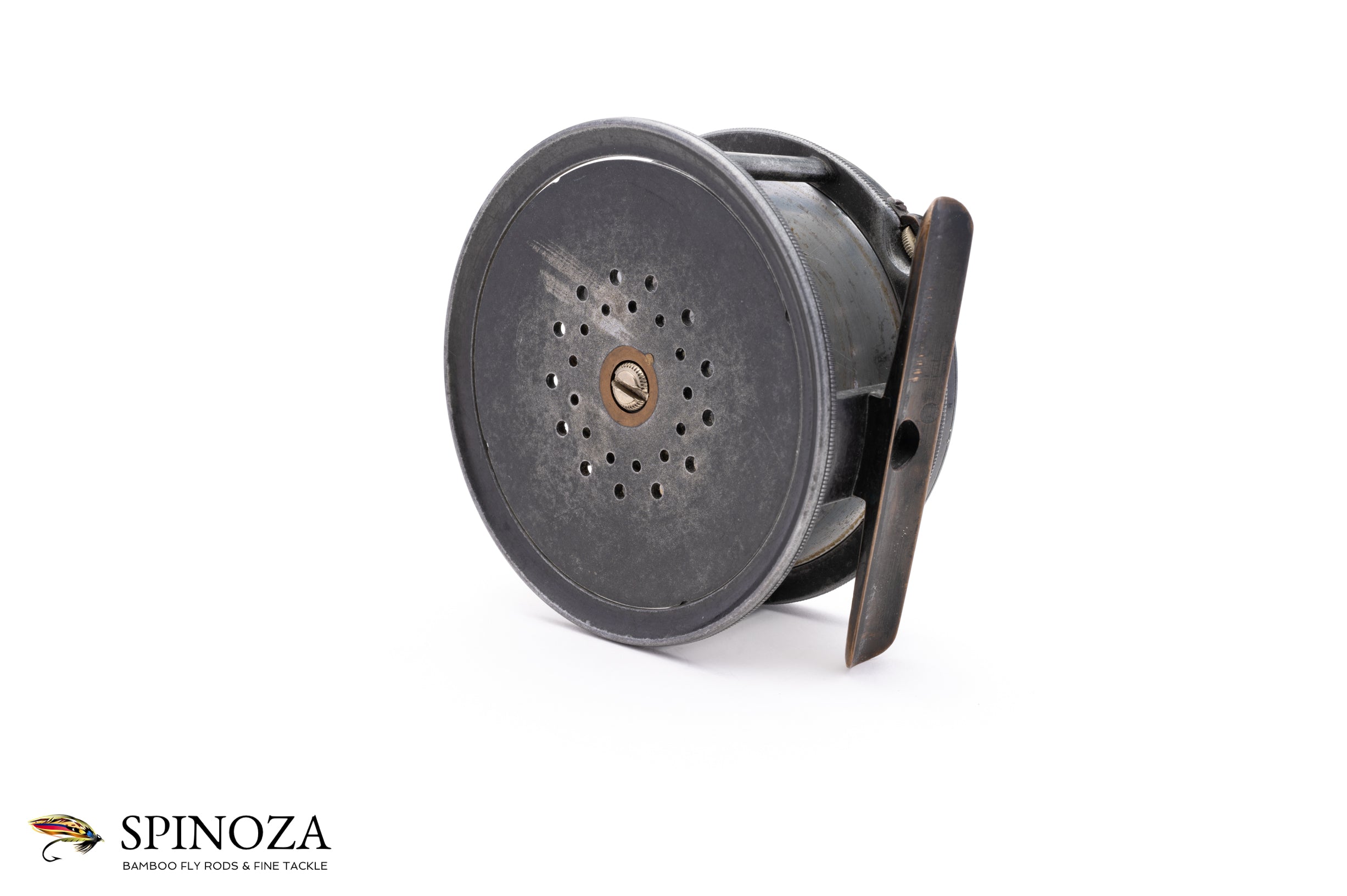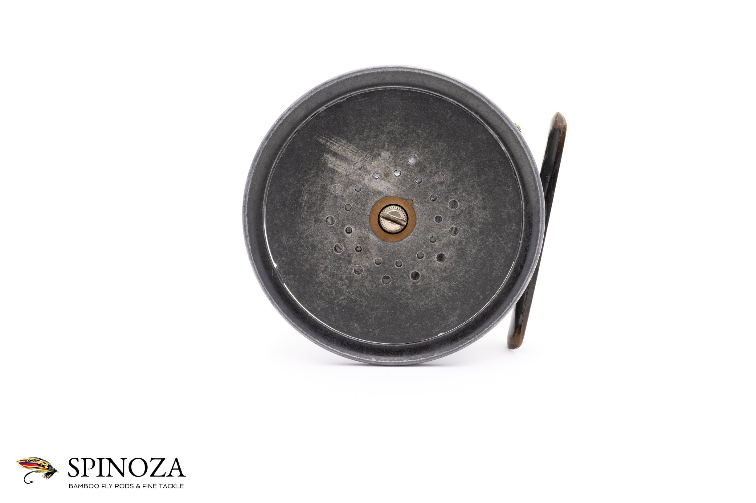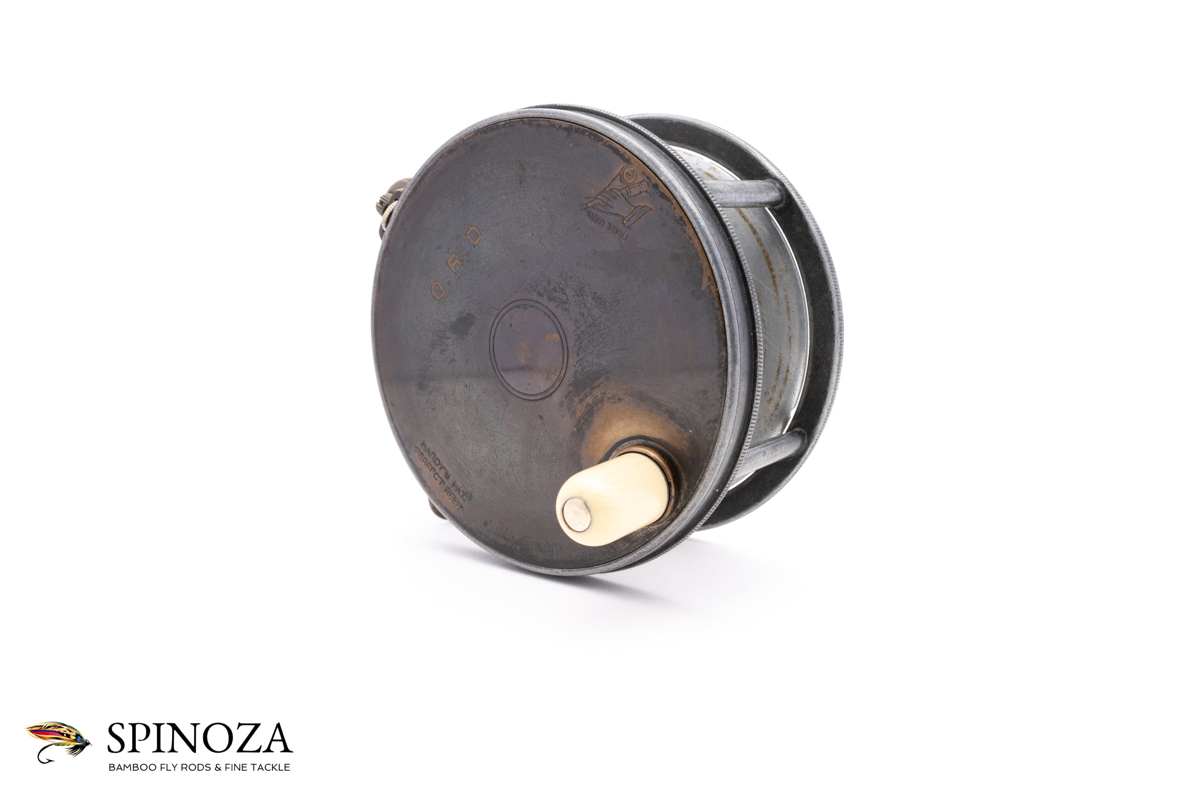 A very nice Hardy Brass Faced Perfect salmon reel, 4" diameter and set up for the typical RHW. The reel boasts the 1904 design with the improved ratchet pawl, which Hardy introduced to strengthen the pawl with a stronger steel bridge. This reel still has the "C" spring flush against the frame, however, which Hardy would soon orient perpendicularly. Excellent overall condition, with normal cosmetic wear but free of any major defects that I could find. There is a little bit of corrosion to the interior part of the spool but the reel is otherwise superb for its age. The spool is nice and tight, free of any wobble, the brass foot is full length, and the ivorine handle spins freely. The check is delightfully loud and the Turks head tensioner works perfectly throughout its range. The brass winding plate features the rod-in-hand logo and the straight line "Hardy Pat / Perfect Reel" stamp, along with the original owner's initials "ORD" professionally engraved. A fine example of a brass faced perfect salmon reel.