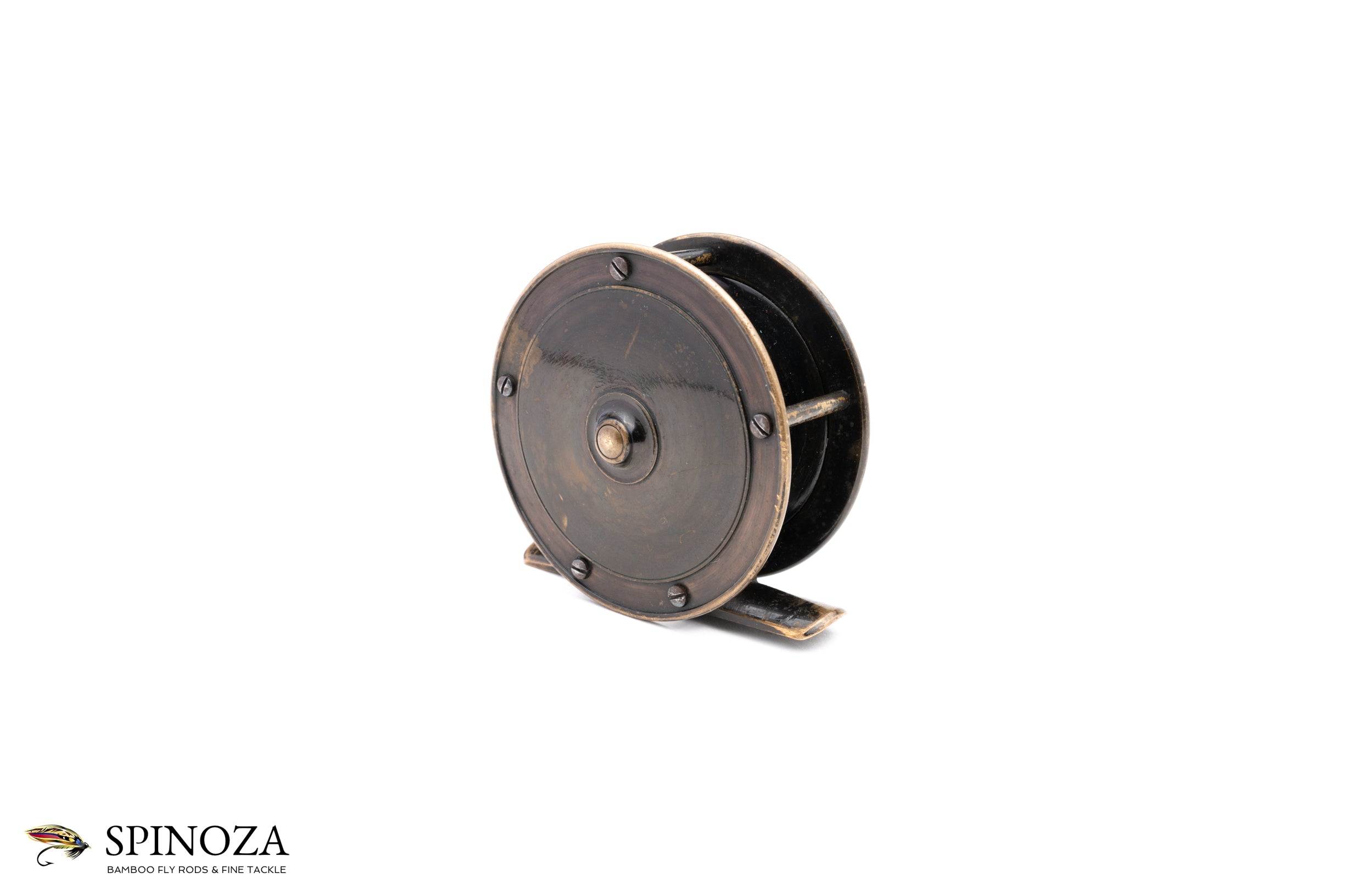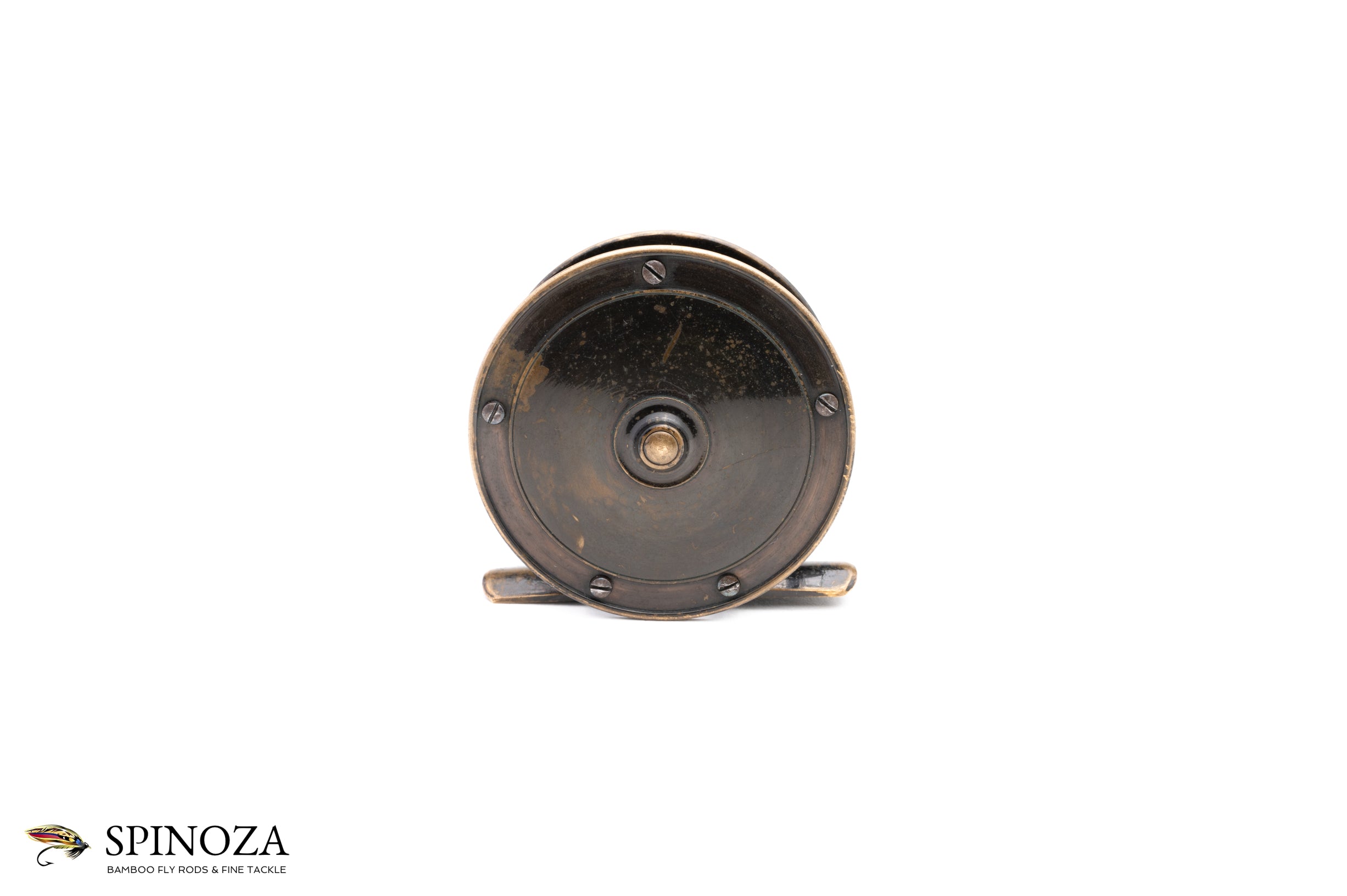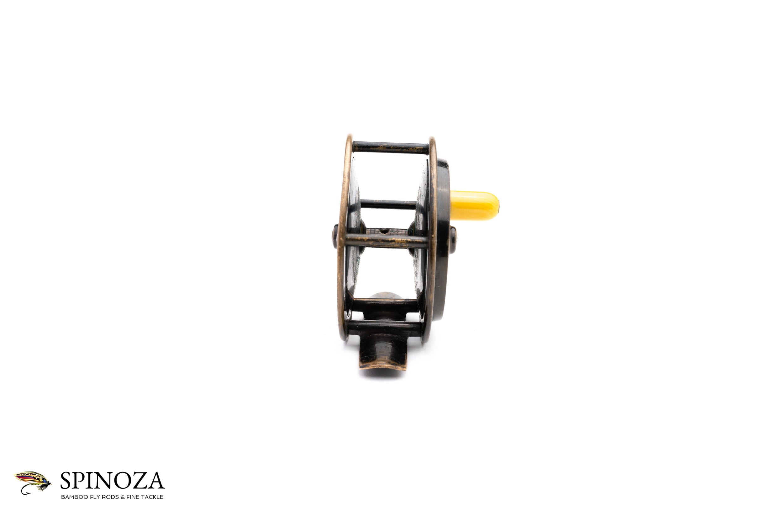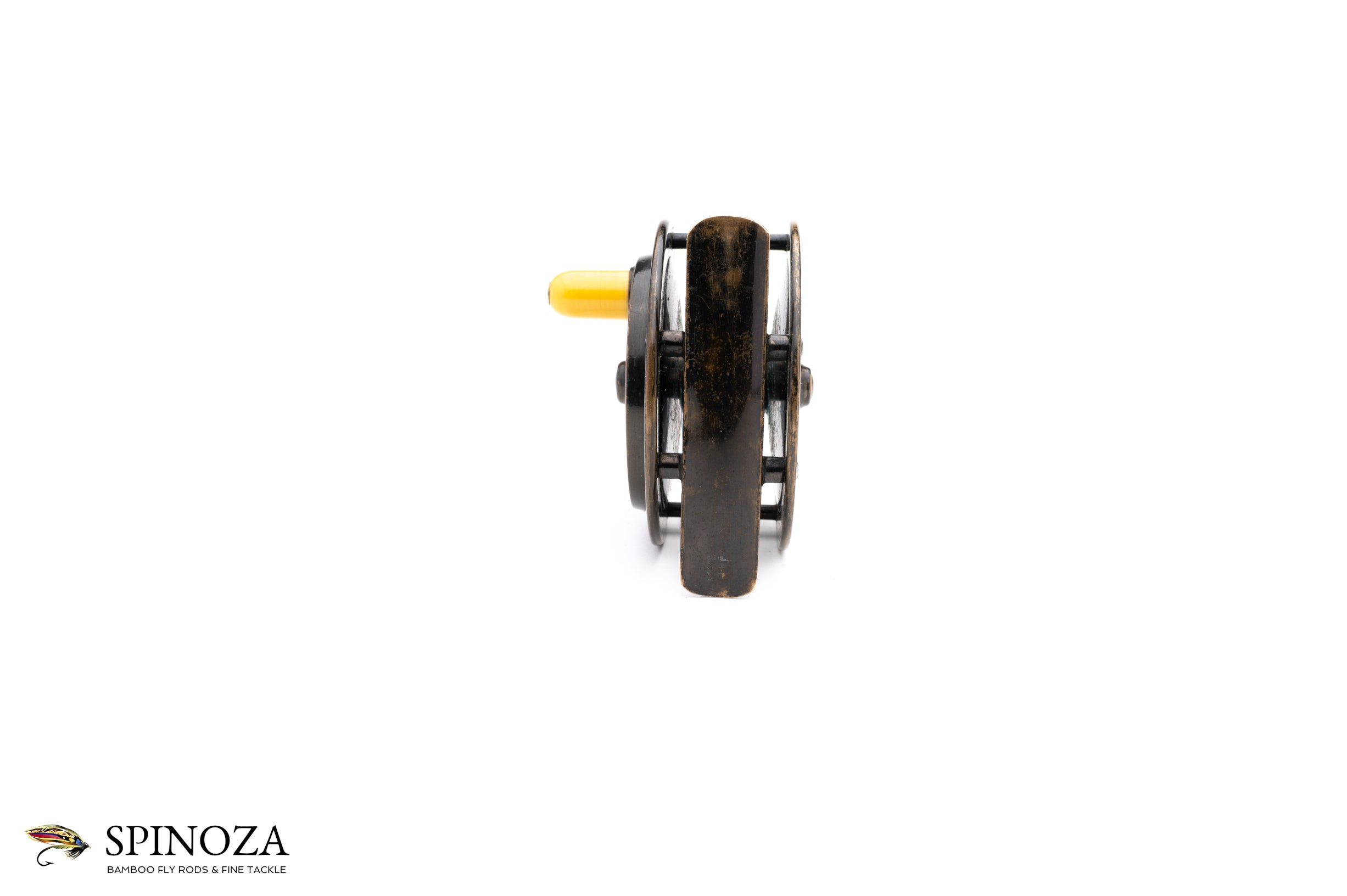 A wonderful little Hardy Hercules all brass trout fly reel, 2 1/2" in diameter. Circa 1890's this reel has the raised front housing, the original ivorine handle and both the maker’s logo and the "rod in hand" logo on the winding plate. Superb condition with a fine patina throughout, and free of any major defects, with the only possible exception being one part of the frame edge on the backplate where there is an ever-so-slight bend toward the center of the reel that you can only see if you look for it. Nice smooth ratchet clicker. A fine example of an early Hardy!