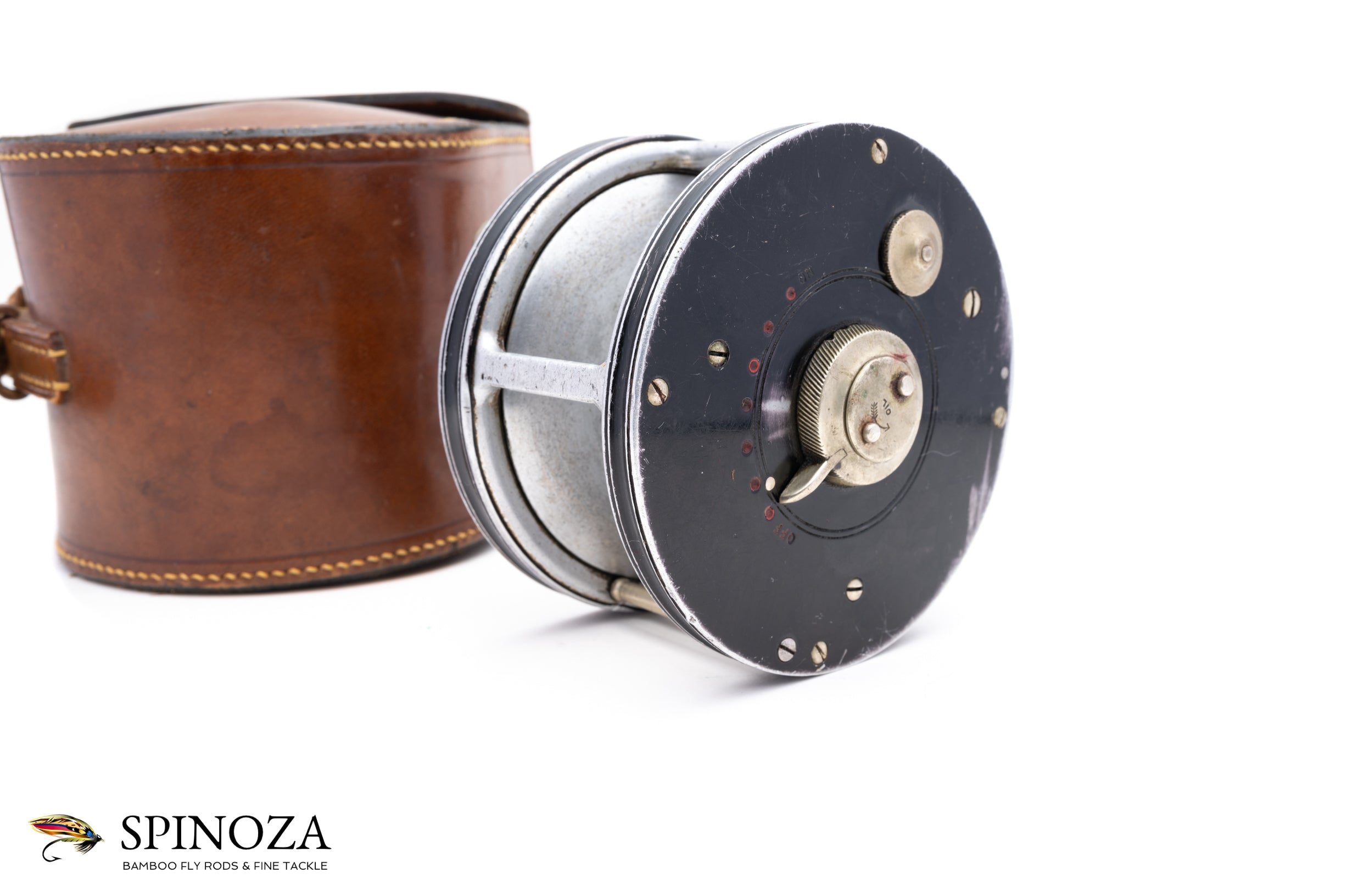 An exceptionally rare Hardy Cascapedia salmon reel, the original model made by Hardy from 1932 to 1939. Inarguably the most desirable of all Hardy reels, and certainly one of the most desirable fly reels ever made, prized and coveted by collectors worldwide. Hardy made only 113 of these reels during its nine year production run and they were designed primarily for the American market to compete with Edward Vom Hofe as the reel of choice on North America's best salmon rivers. This 3/0 size is 3 5/8" in diameter with 1 3/8" spool width. This is the later model introduced in 1937 made of duralumin with black anodized duralumin sideplates, which make up 43 of the 113 total. The reel boasts a 1.75 : 1 multiplying retrieve, and was designed to fish "rings up" positioned on top of the rod with the spool rotating in the opposite direction of modern reels. Good overall condition with some line marks to the duralumin bar and frame edge near the revolving pillar, and there are cosmetic scratches and anodizing loss in several areas on the backplate and the front plate. Several of the screw heads also show signs of wear. The ribbed foot appears unmolested with the patent stamped into its side, and all three medallions are intact (one is rotated slightly) which note the model size and House of Hardy stamp, the royal warrant to King George V, and the royal warrant to the Prince of Wales, respectively. Mechanically the reel is excellent with a smooth pleasing click and the disc to engage and disengage the check works flawlessly. There is a seven position drag adjuster on the backplate and the drag becomes shockingly strong when the adjuster is moved progressively through its settings. The reel packs into an original Hardy leather block case especially designed for this model that is in excellent condition. As collectible reels go they don't come rarer or more desirable than this.