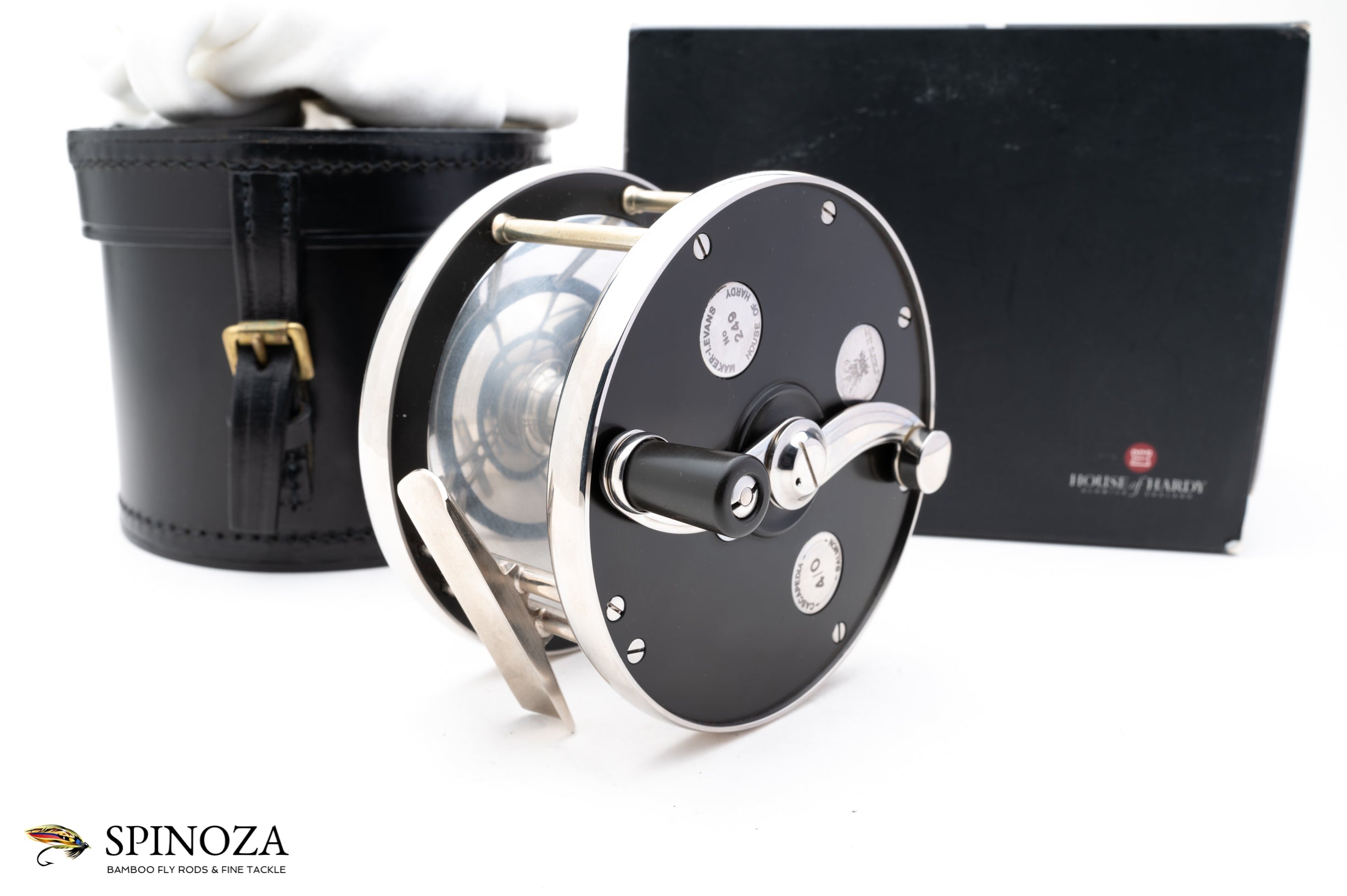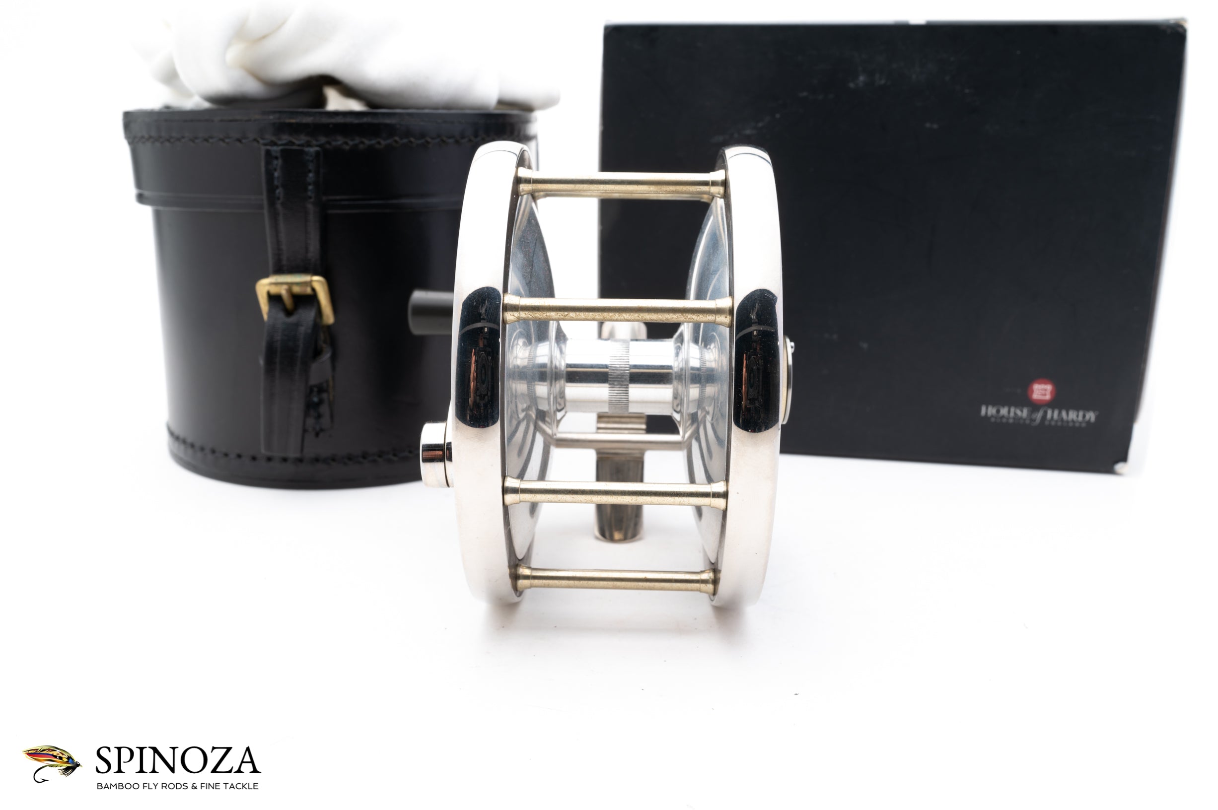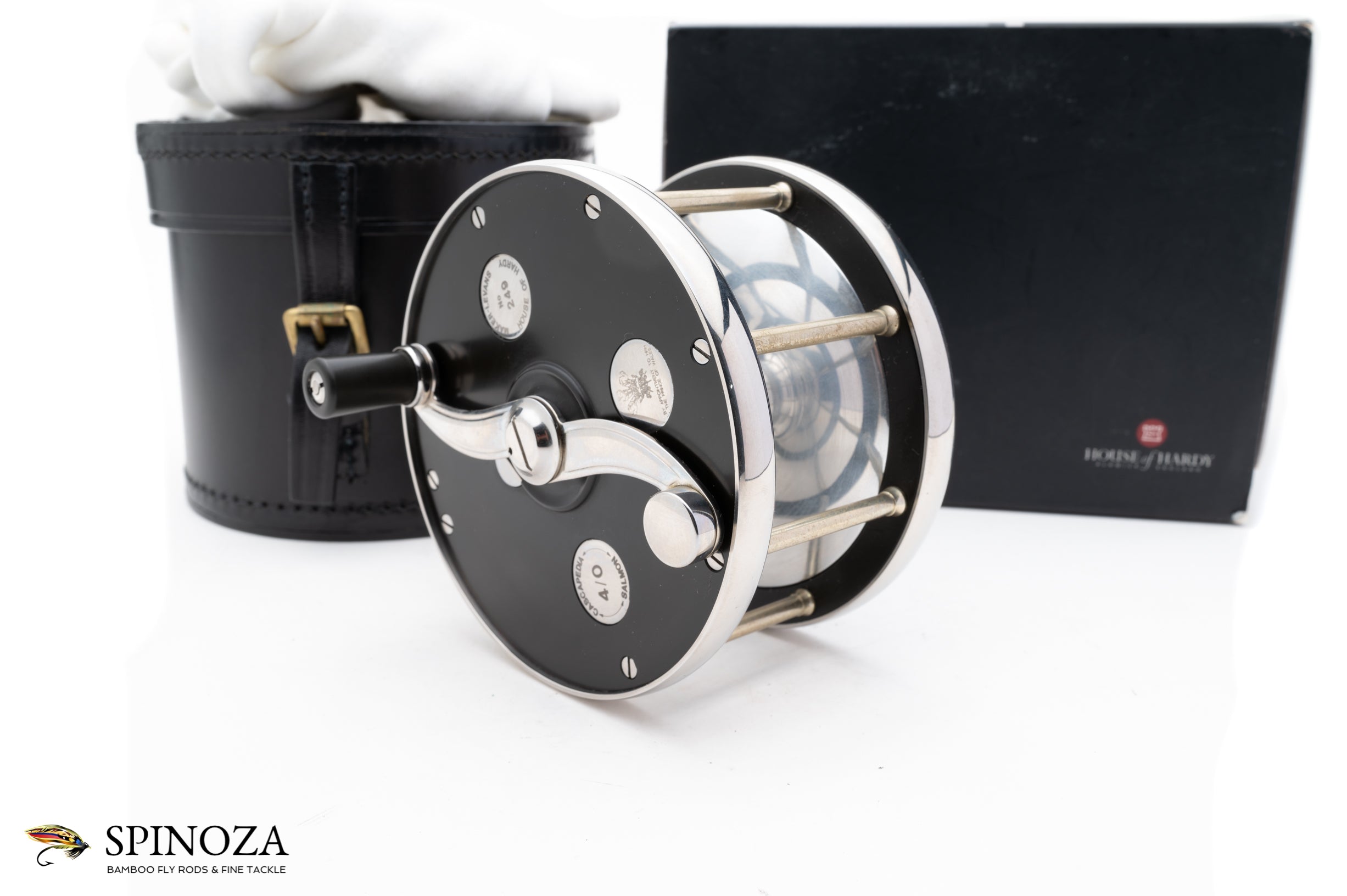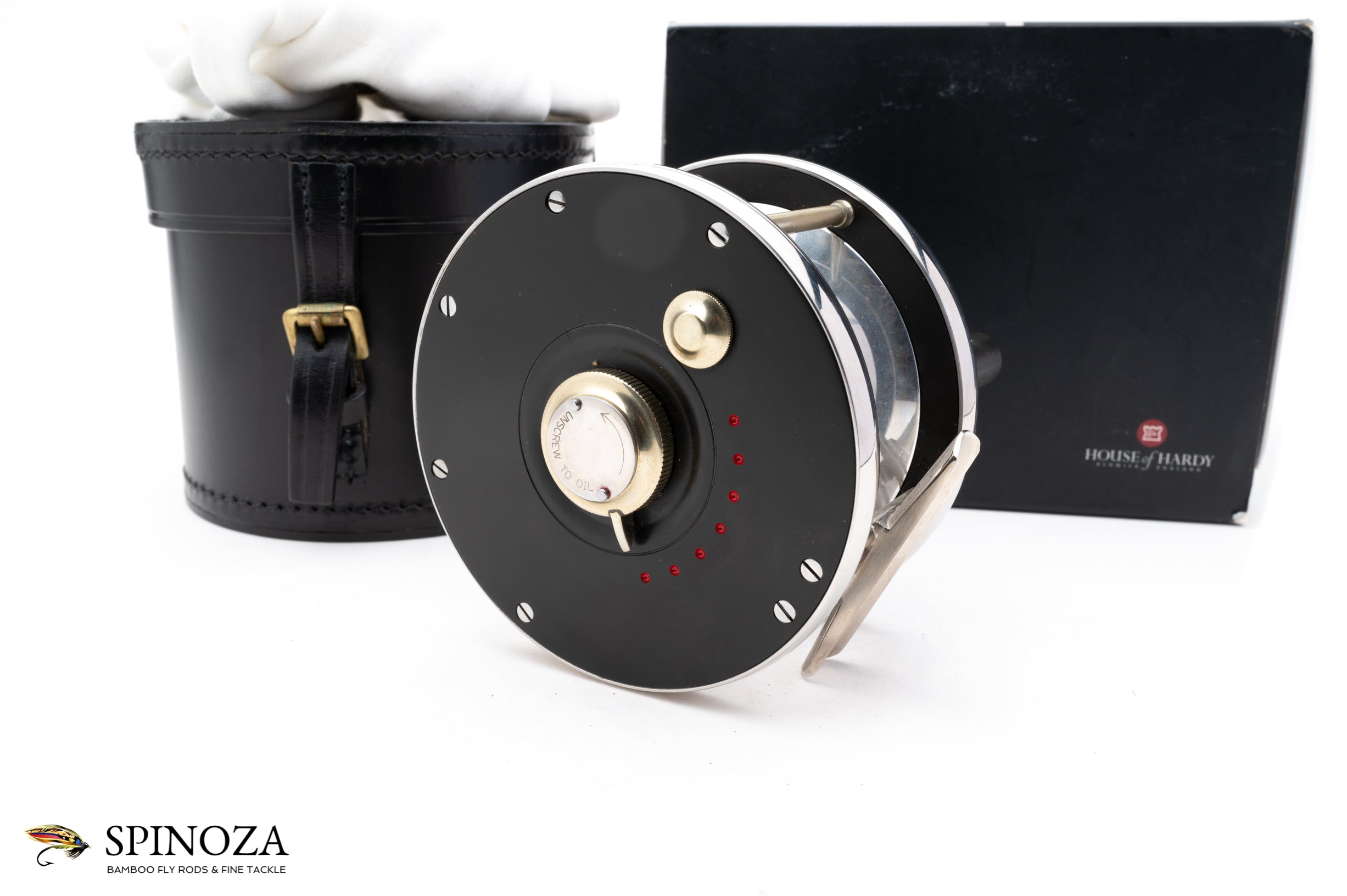 A fine Hardy Cascapedia 4/0 Limited Edition Fly Reel that Hardy introduced in the late 1990's. This exquisitely finished, and hand-built multiplier reel is number 249 of only 500 made worldwide. This one is made by reelmaker Ian W. Evans as noted on one of the medallions, while the other displays the royal warrant of HRH The Prince of Wales, and the third notes the 4/0 size. RHW. Unfished. All original with box, sleeve, block leather case, booklet, and white gloves! The drum is made from highly polished bar-stock aluminum, the side-plates are polished ebonite, and the rims are stainless steel. The reel seat is brass nickel, and the pillars, drag selector, and check button are finished in nickel silver. Nice smooth drag and the reel features a 1.7/1 multiplier retrieve. The drag selector can be adjusted to seven different levels, and the check button allows for an audible click or silent operation as preferred.
