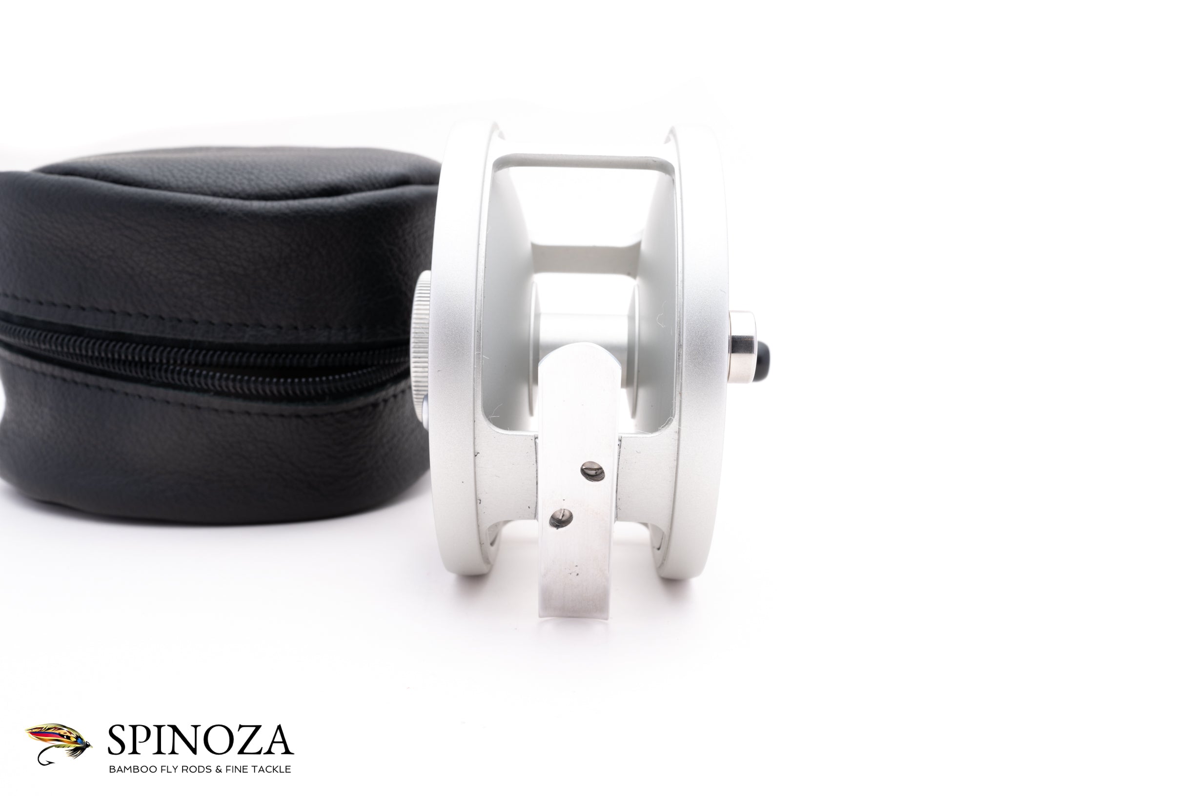 A Hardy Cascapedia 8/9 fly reel, 3 3/4" diameter and set up for LHW. This is one of the current versions of this model. It appears to be unfished. The reel weighs 12.1 ounces on my scale. Classic S-handle design. Black anodized sideplates with a silver matte finish frame and spool. In an homage to the original version, the reel has three medallions set into the front plate. The disc drag is adjusted via a dial on the backplate. Made in England. Serial "B78918" stamped into the side of the foot. The reel packs into a black zipper fleece lined pouch.