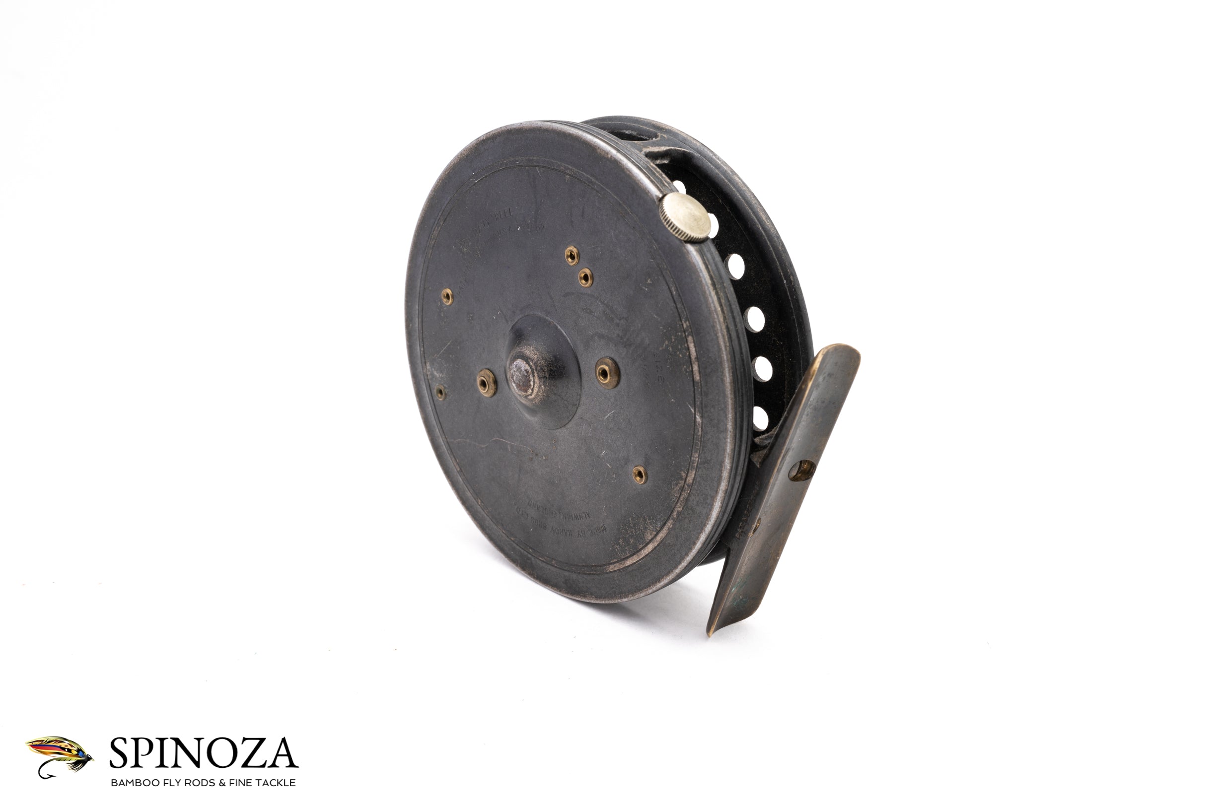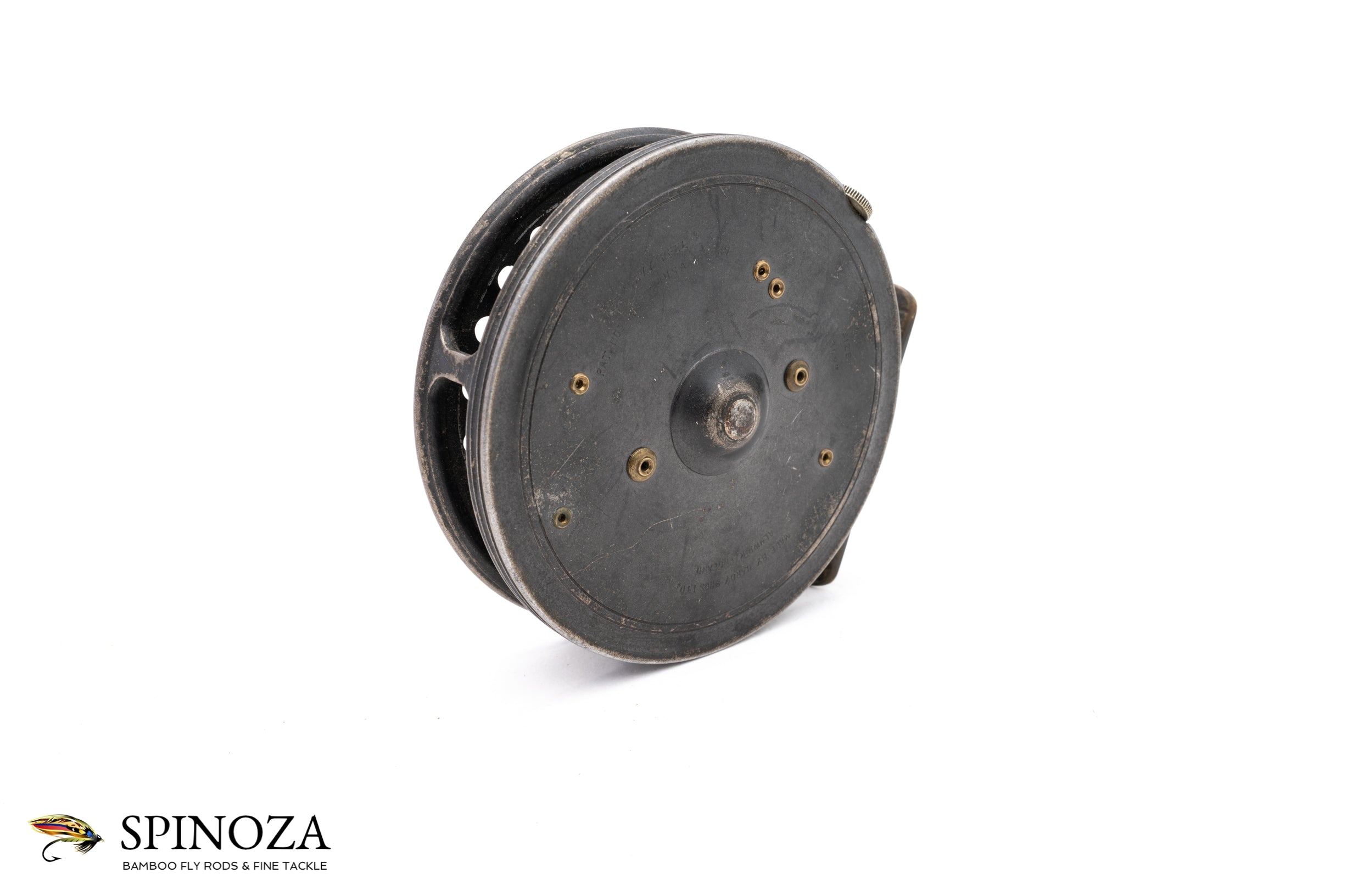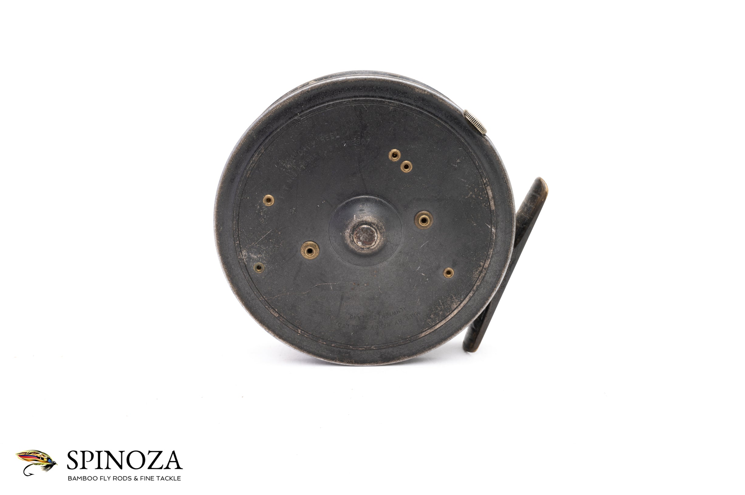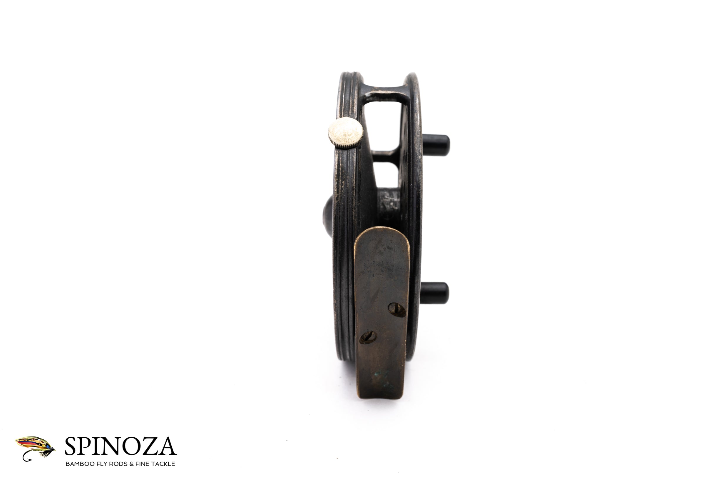 An exceedingly scarce Hardy "The Davy" Reel, with a 3 1/2" diameter and a scant 17/32" between the spool plates, making it one of their thinnest trout models. The reel weighs 5.6 oz. The unmolested ribbed brass reel foot measures 2 7/16". This is one of the rarest of all Hardy trout reels with only 187 made during the period 1930-1939. Originally designed at the behest of Martin Davy, this model drew from the Eureka and boasted a drop latch, two handles, and was thought to have been desired for the increased line retrieval rate that its dimensions afforded. Relatively few of them remain due to their thin, and therefore more fragile, design, and there are even fewer like this one here which is in superb original condition. I've gone over it very carefully and aside from some normal cosmetic wear it is in excellent shape overall with no cracks, chips, or any other issues, and the frame remains just as tight today as it was when it came out of the Hardy factory. As John Drewett notes about the Davy in his definitive book on Hardy reels: "Examples come to light all too infrequently. The Davy does appear to have been a reel that once purchased subsequently received frequent use with the consequence that when you do see a Davy the likelihood is that it will not be in pristine condition." That certainly is not the case here. This is just a marvelous example of one of the rarest hardy trout reels of them all and deserves pride of place in a great reel collection.