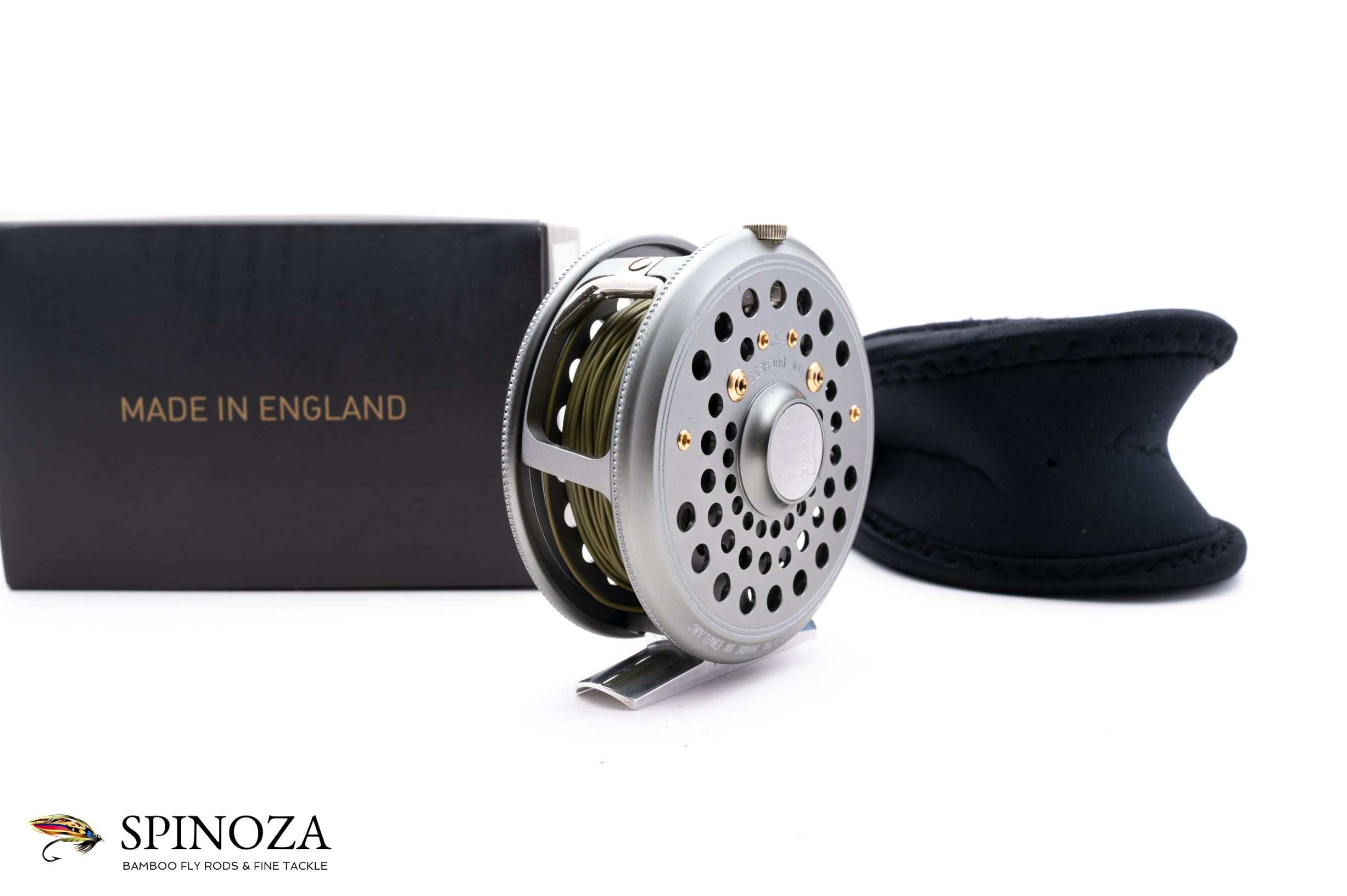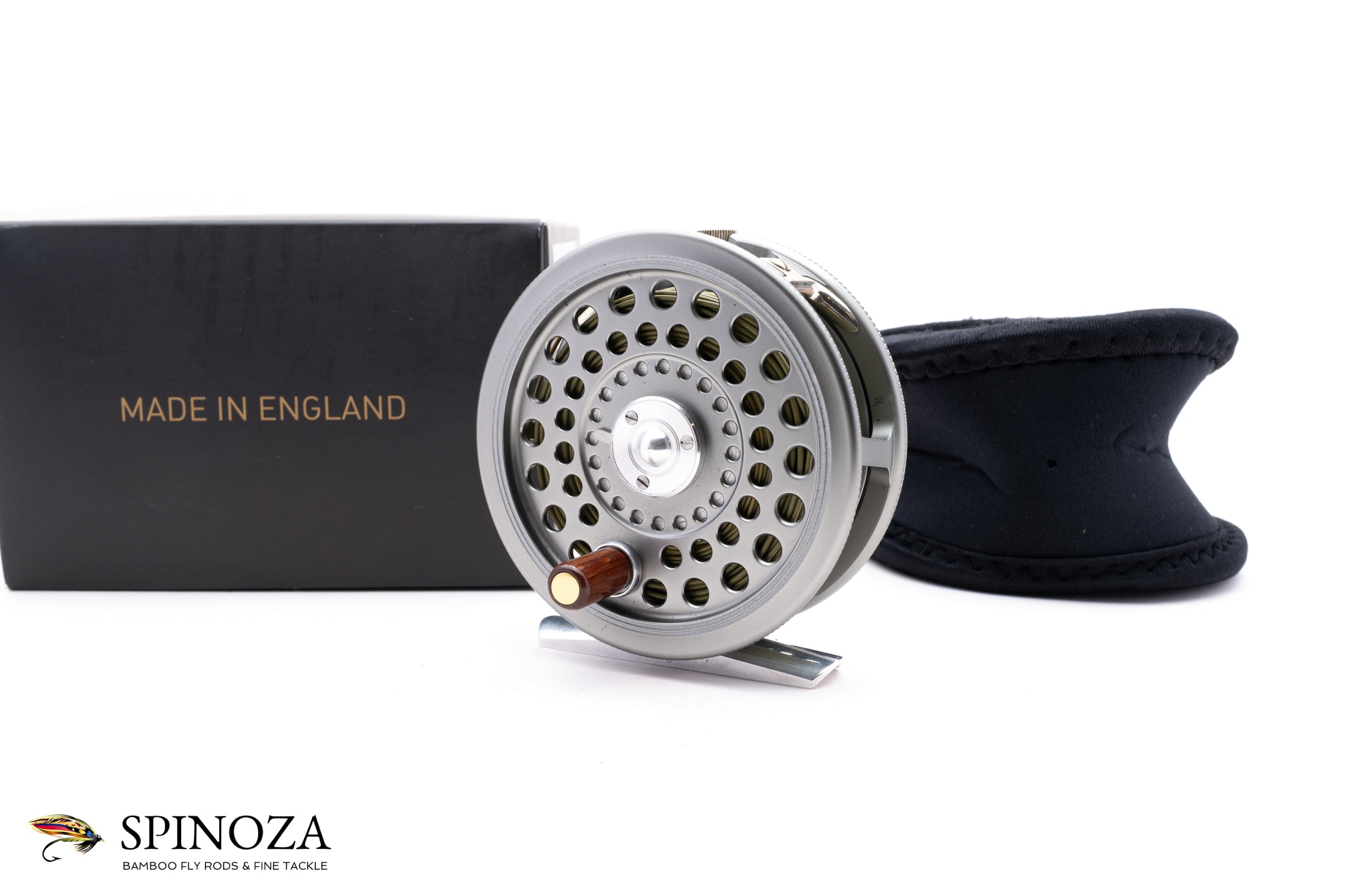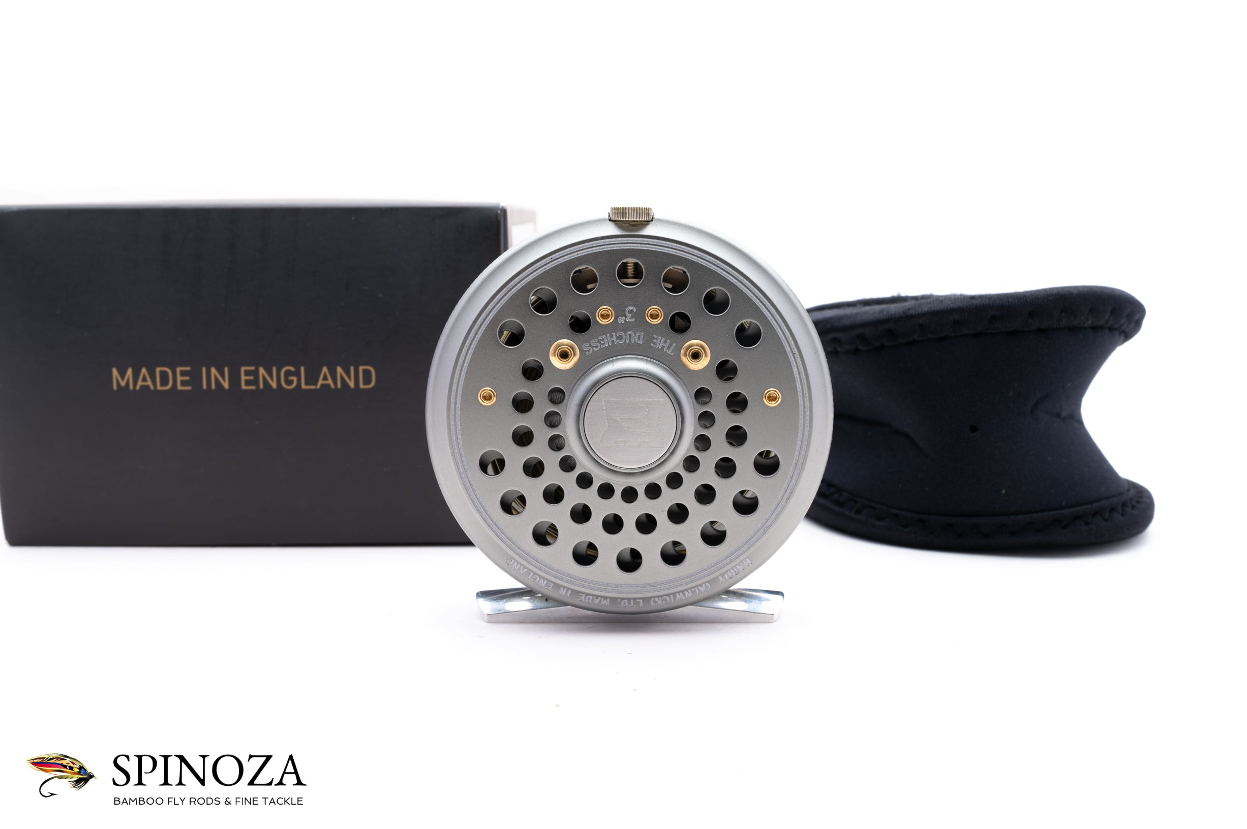 A contemporary Hardy Duchess fly reel, 3" diameter and currently set up for LHW. A line has been loaded on the reel but I could find no sign that it has actually been fished. Medium arbor design with a gray finish. Dual nickel silver line guards. Wood handle. The reel packs into the original neoprene Hardy pouch and box with paperwork.