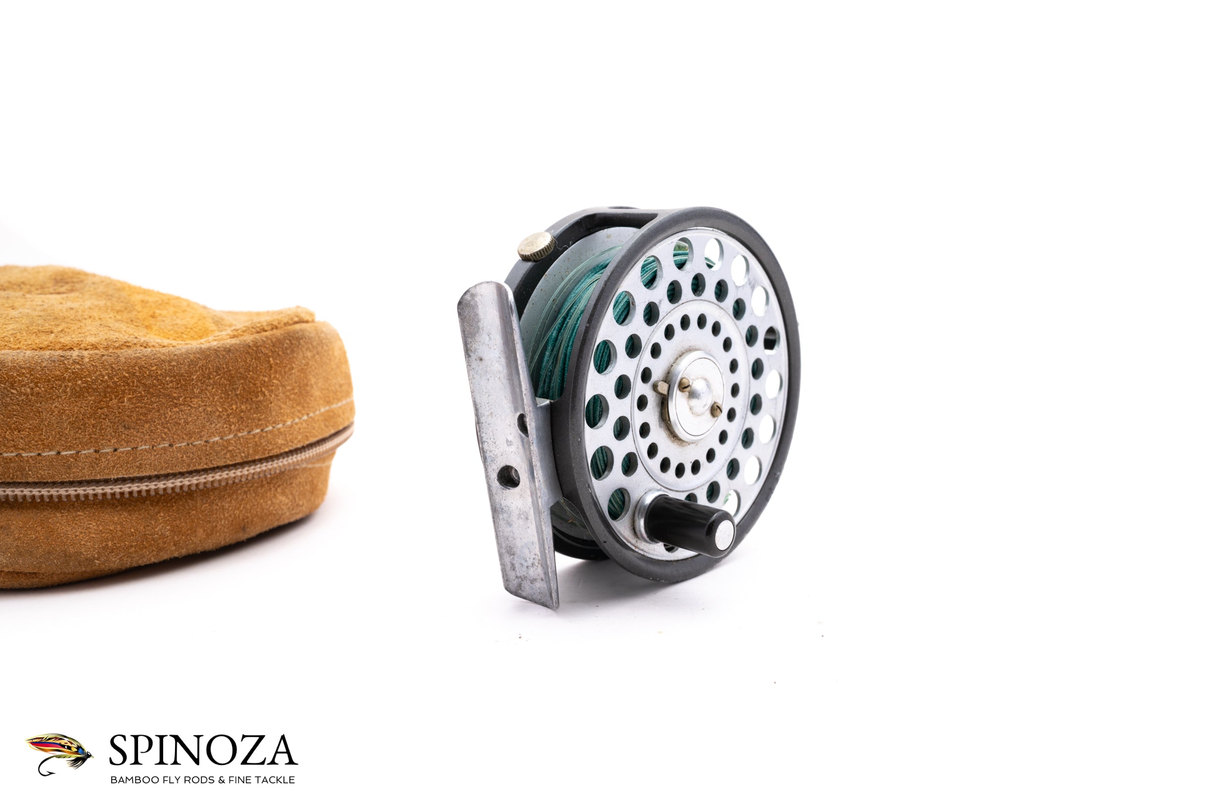 A Hardy Featherweight fly reel, 2 7/8" diameter and set up for RHW (but easily convertible). Fair condition with some moderate to heavy rim rash to the frame edge in one area and moderate cosmetic wear throughout. The reel is certainly fishable and mechanically sound. Two-screw latch plate with a reversible two screw L-shaped nickel silver line guard. Designed to hold a DT4+40 or DT5+15 (there is a line currently loaded on the reel). The reel packs into an oversized Orvis suede zip pouch.