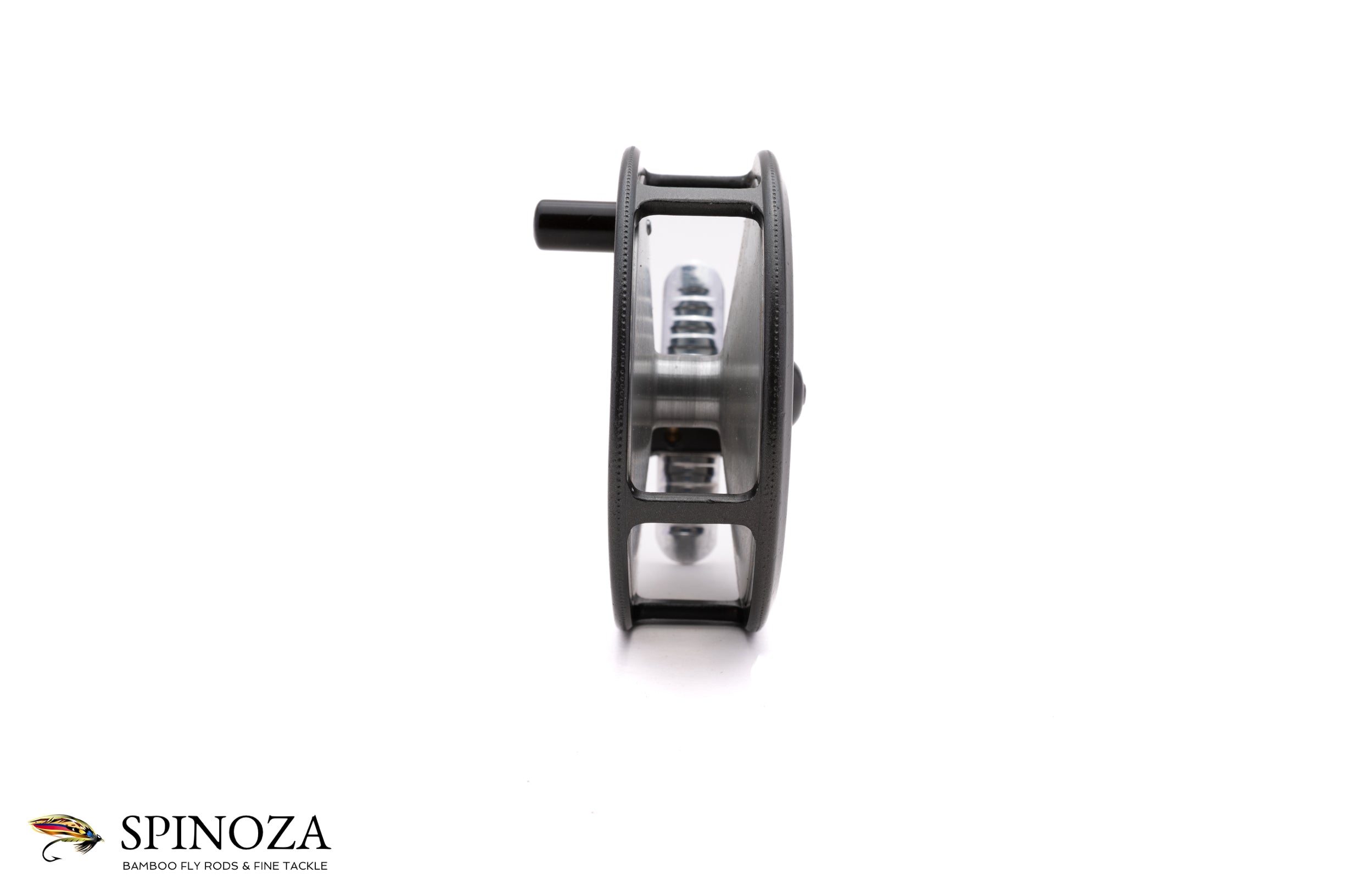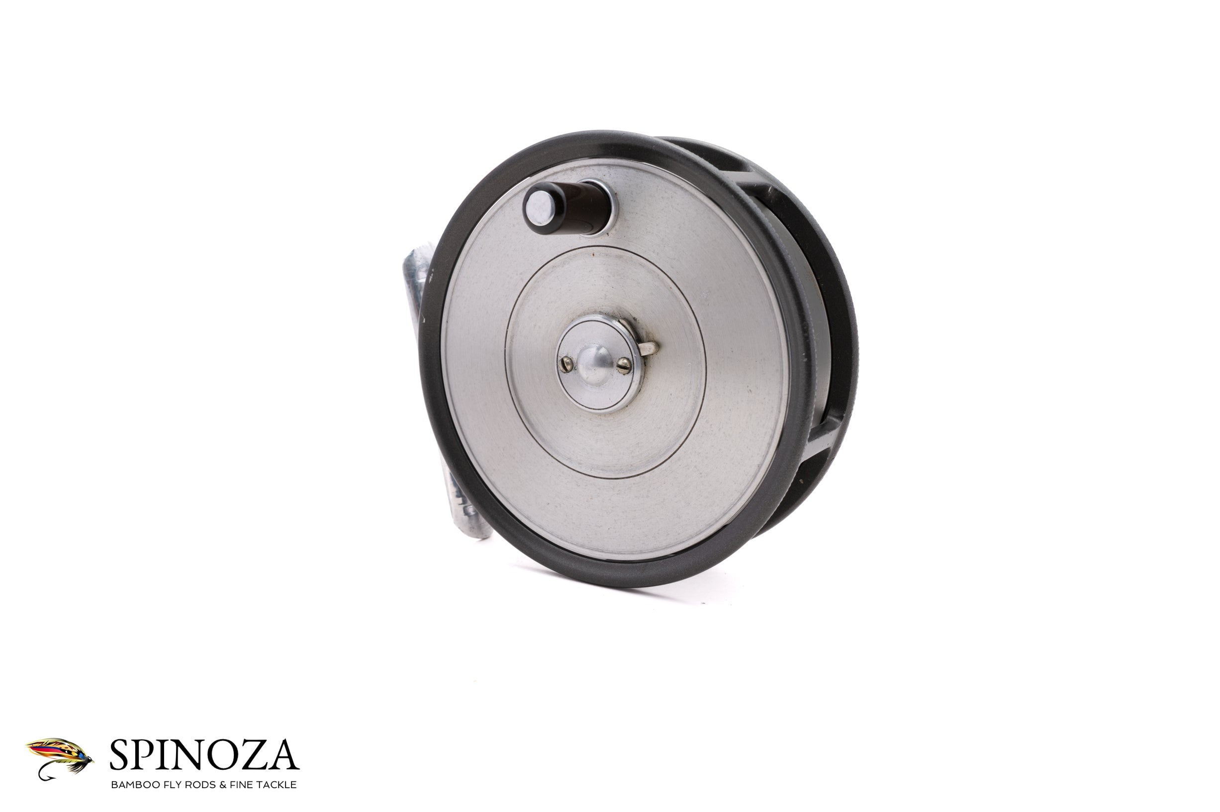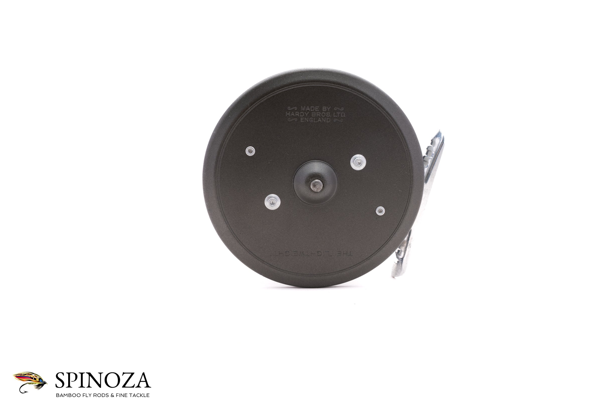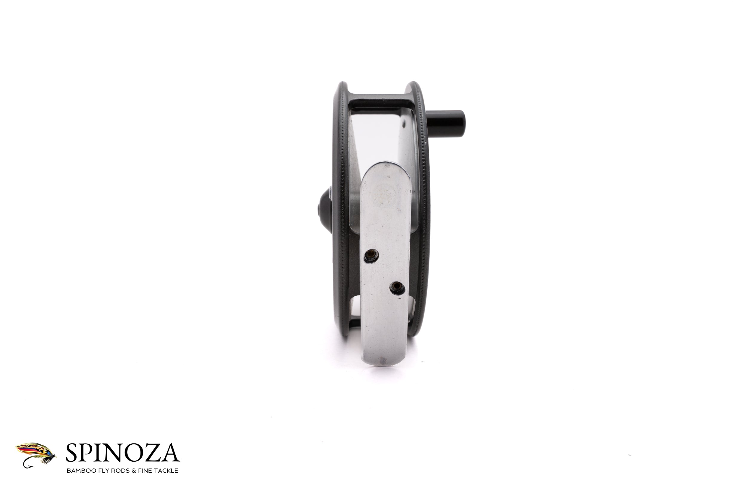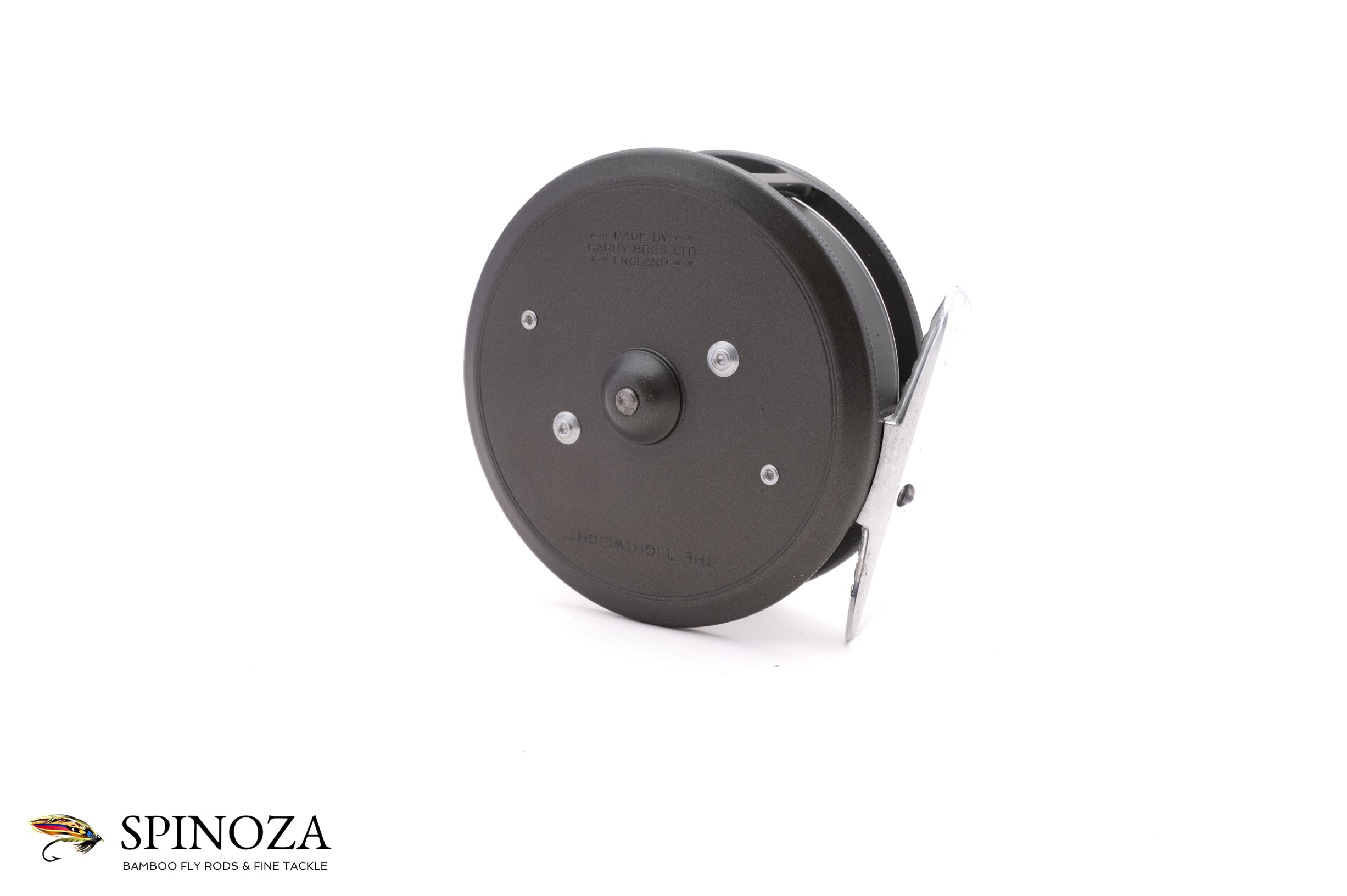 A Hardy Lightweight fly reel, 3 3/16" diameter and currently set up for RHW though easily convertible. Two screw model. This is an unusual model made with a solid unventilated spool, which I don't believe I have seen before (An early version from Hardy?). The location of the pillars is also unusual, boasting four rather than three and having them located approximately at the 8:30, 10:30, 1, and 3 positions. Near mint condition with a few trace marks on the frame edge and a tiny spot of line grooving on one of the pillars. Ribbed alloy foot. Ebonite handle. Mechanically, the reel is excellent. No line guard and no tensioner. No case or bag. An interesting reel for the Hardy fan who has it all.