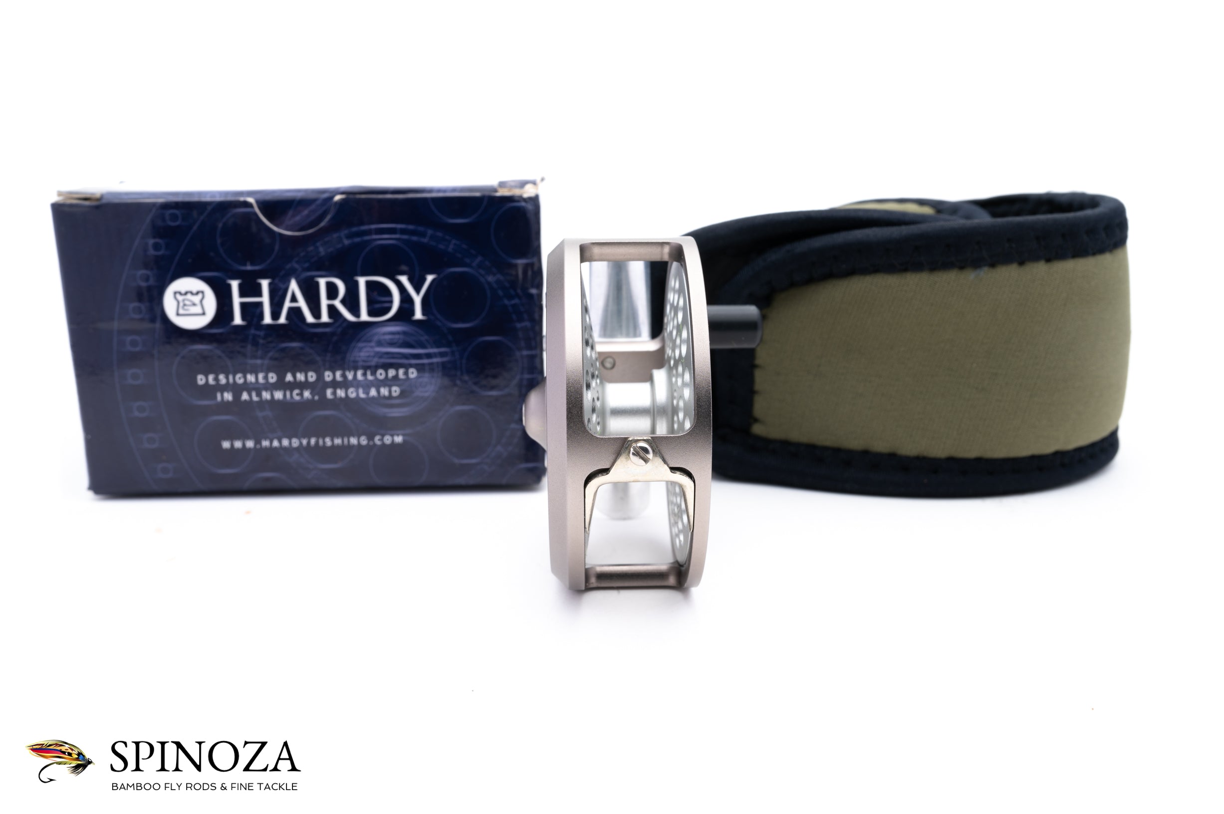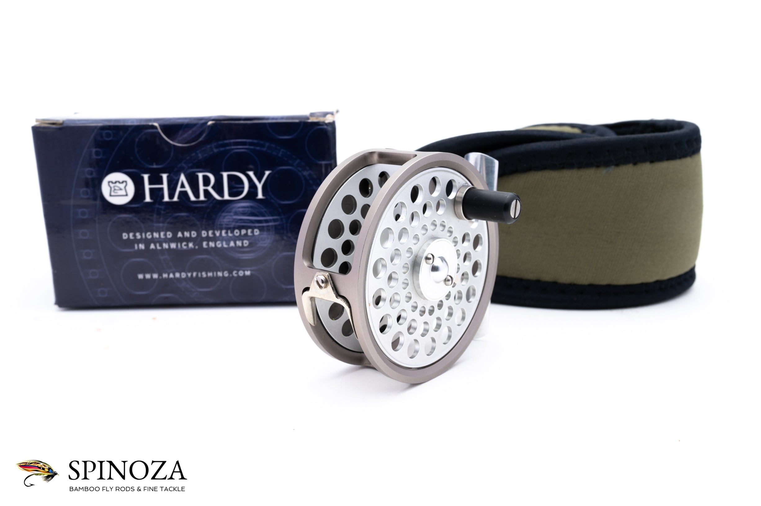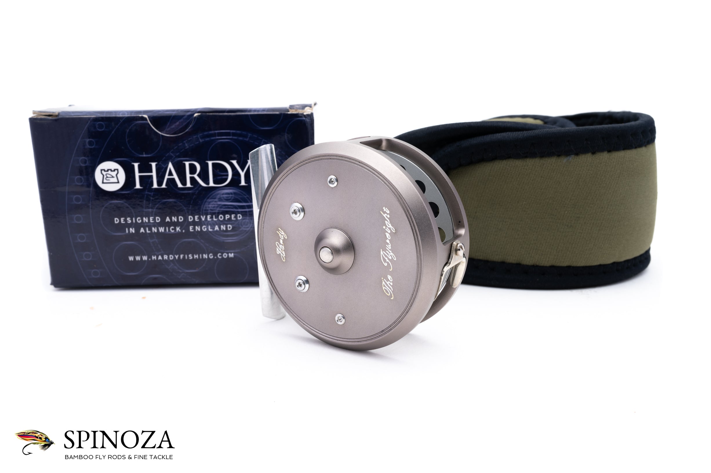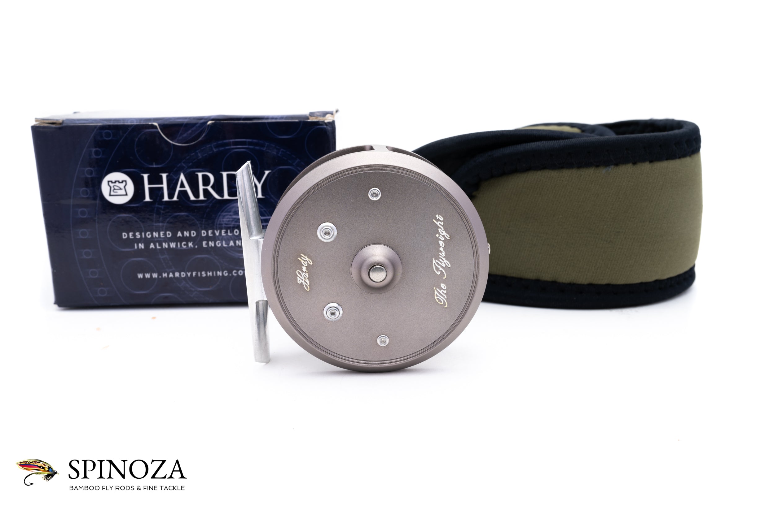 A Hardy Flyweight fly reel, currently set up for RHW (though easily reversible). 2 1/2" diameter. Reversible nickel silver line guard. Smooth alloy foot. Two-screw latch plate. Near mint condition. Serial "R36683" stamped into the side of the foot. Capacity is up to a DT4 with no backing or a WF3+50yds. Comes with an olive neoprene Hardy pouch with the original box and paperwork.