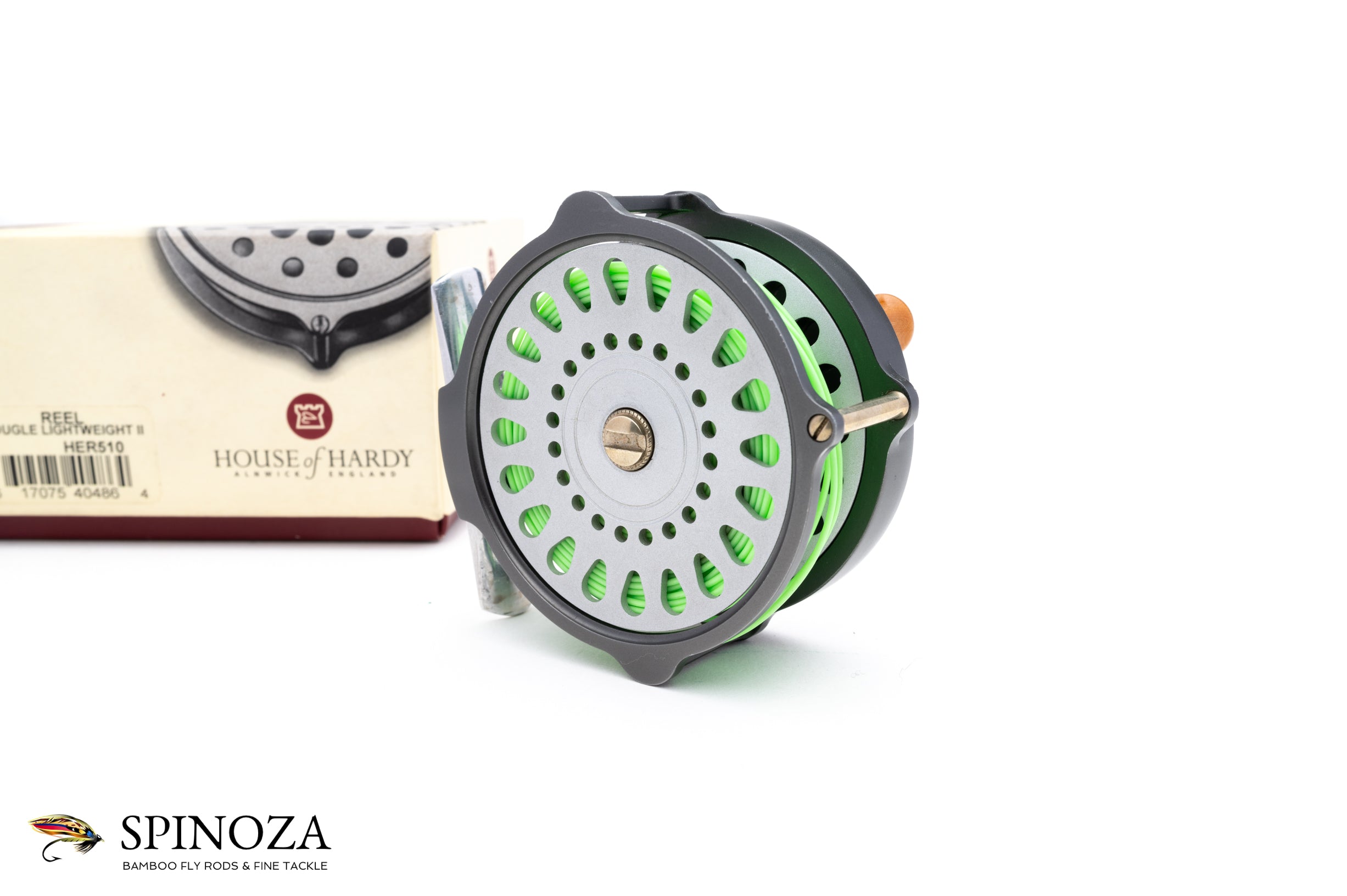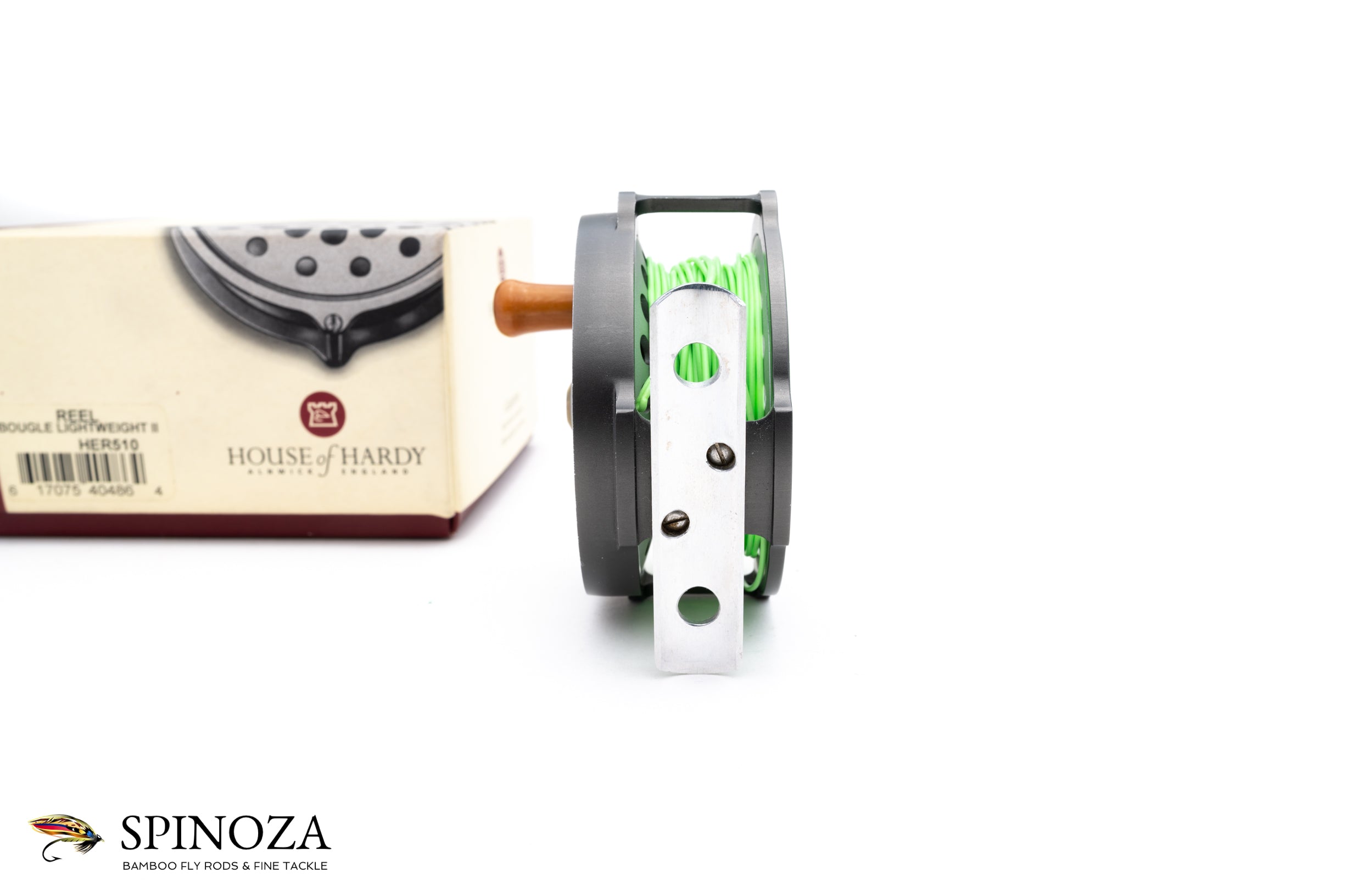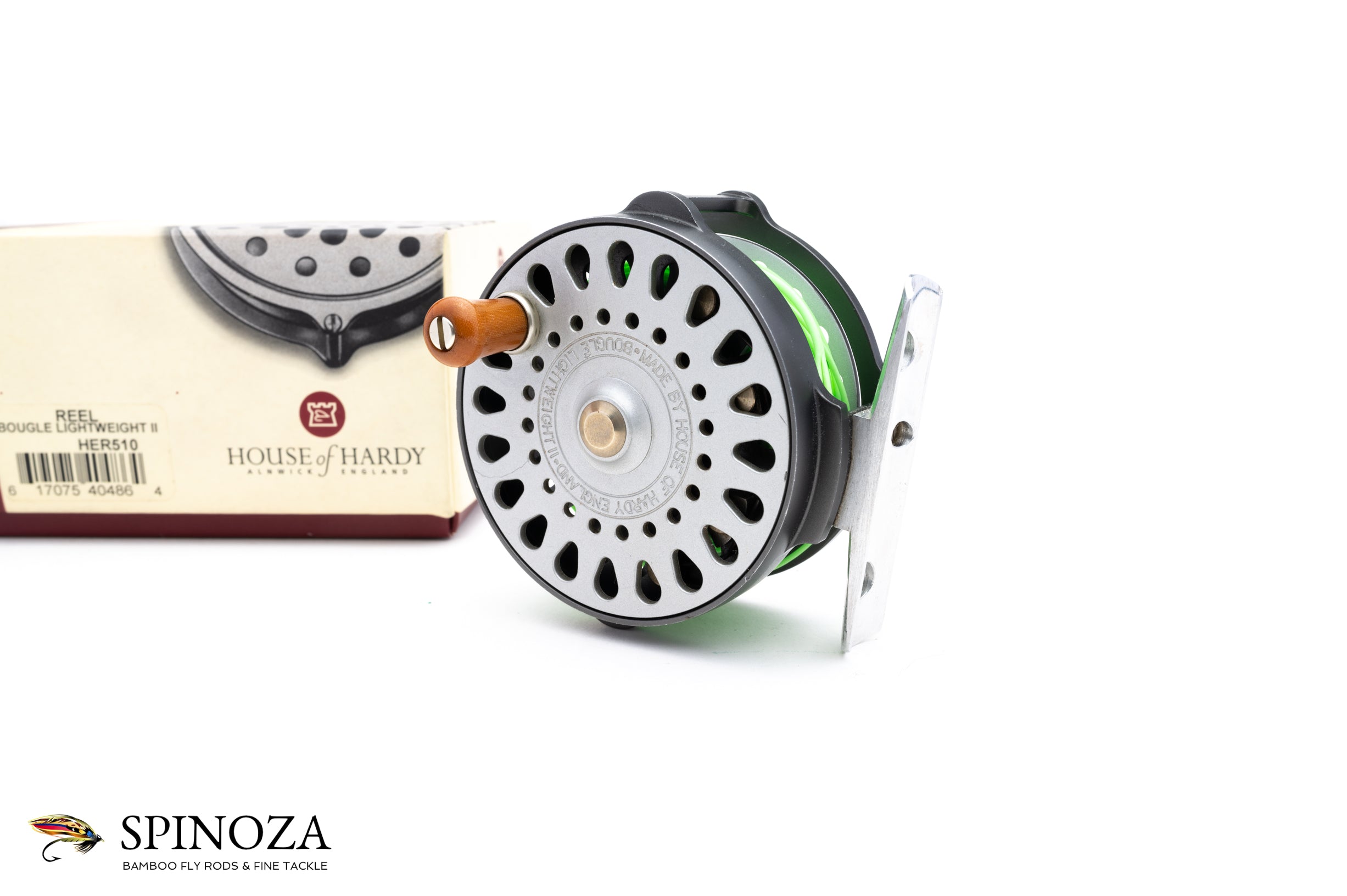 A nice Hardy Bougle Lightweight II fly reel, 2.90" across the pillars with a spool diameter of 2.30". Currently set up for LHW. A very desirable model which combines the iconic Bougle design with contemporary tear drop porting. Excellent used condition with some minor cosmetic wear in a few places, but very clean. Bronzed grey frame color with a silver spool. Catalog weight of 3.4 ounces, this one has a line loaded on it. Made in Alnwick, England. Comes with original box, pouch, and paperwork.