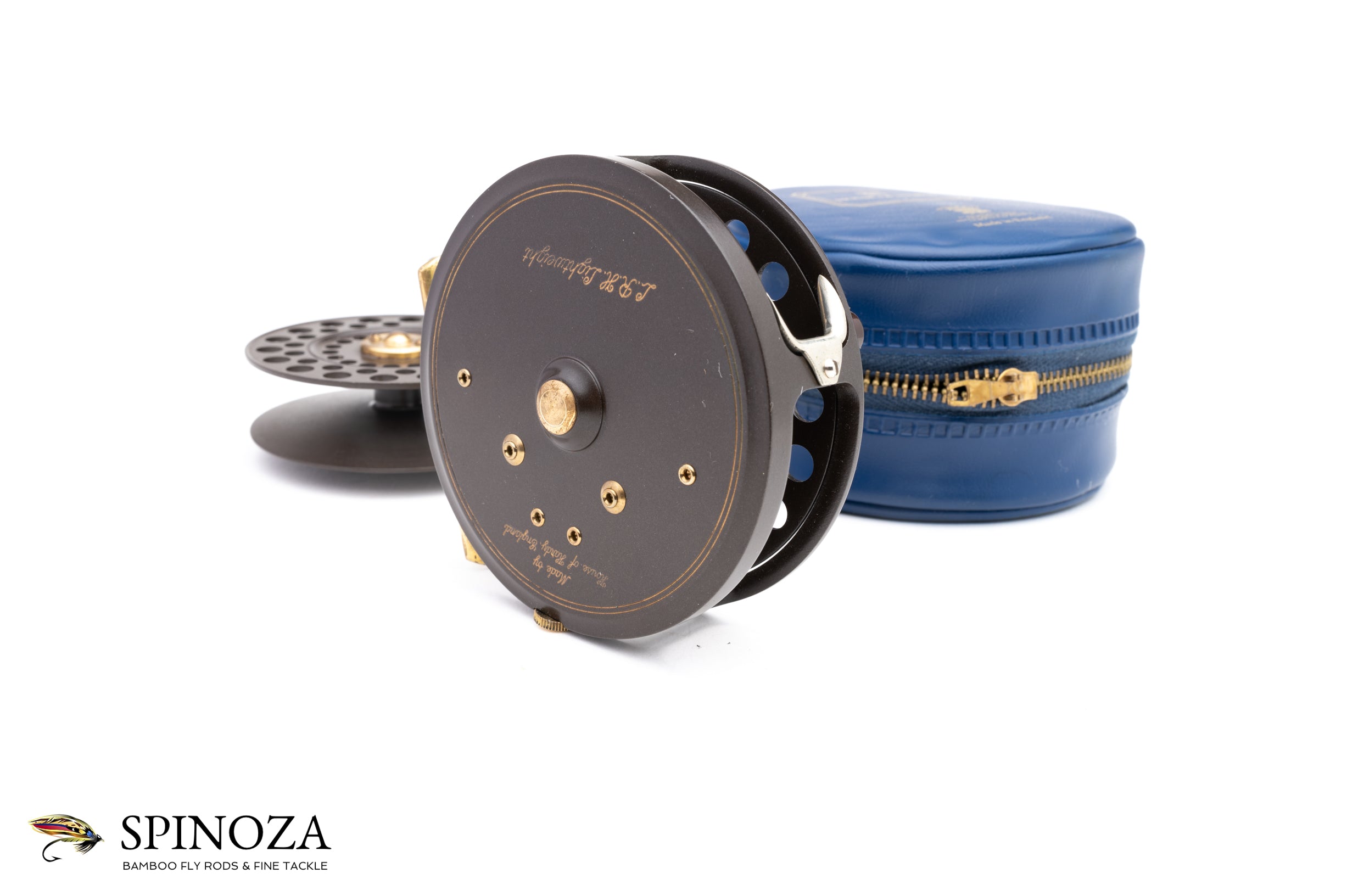 A nice Hardy Golden LRH Lightweight fly reel with a spare spool, 3 1/8" diameter and currently set up for LHW (though easily convertible). Near mint condition with some minor mounting marks on the foot being the only sign that this reel was ever on a rod. Flawless otherwise. Reversible single screw line guard. Designed to hold a DT5+55 or DT6+20. The reel packs into a blue vinyl Hardy case (the spare spool has no case).