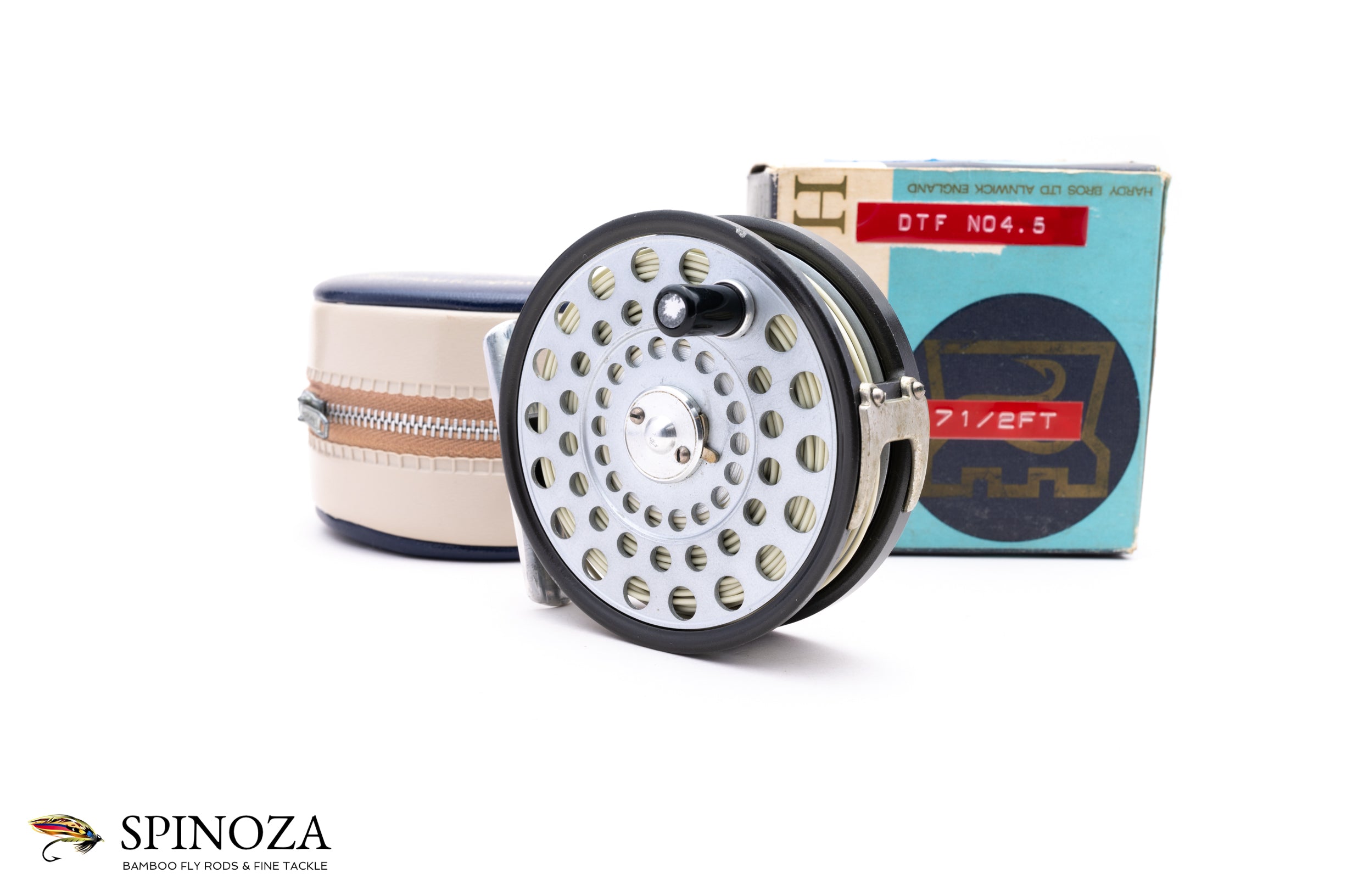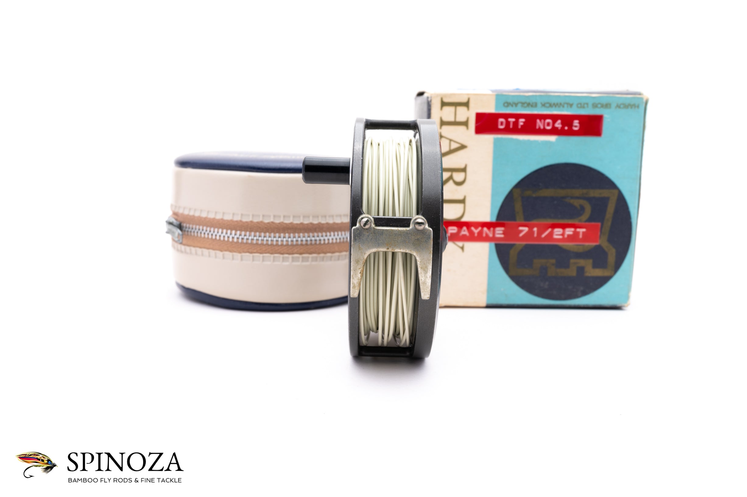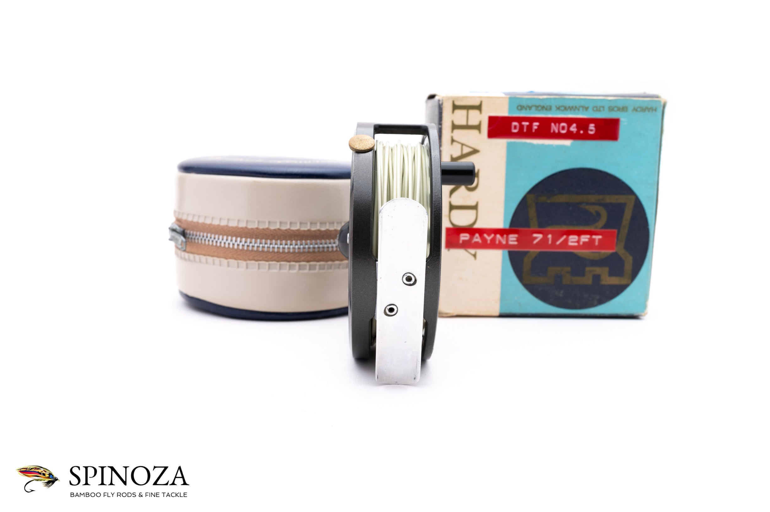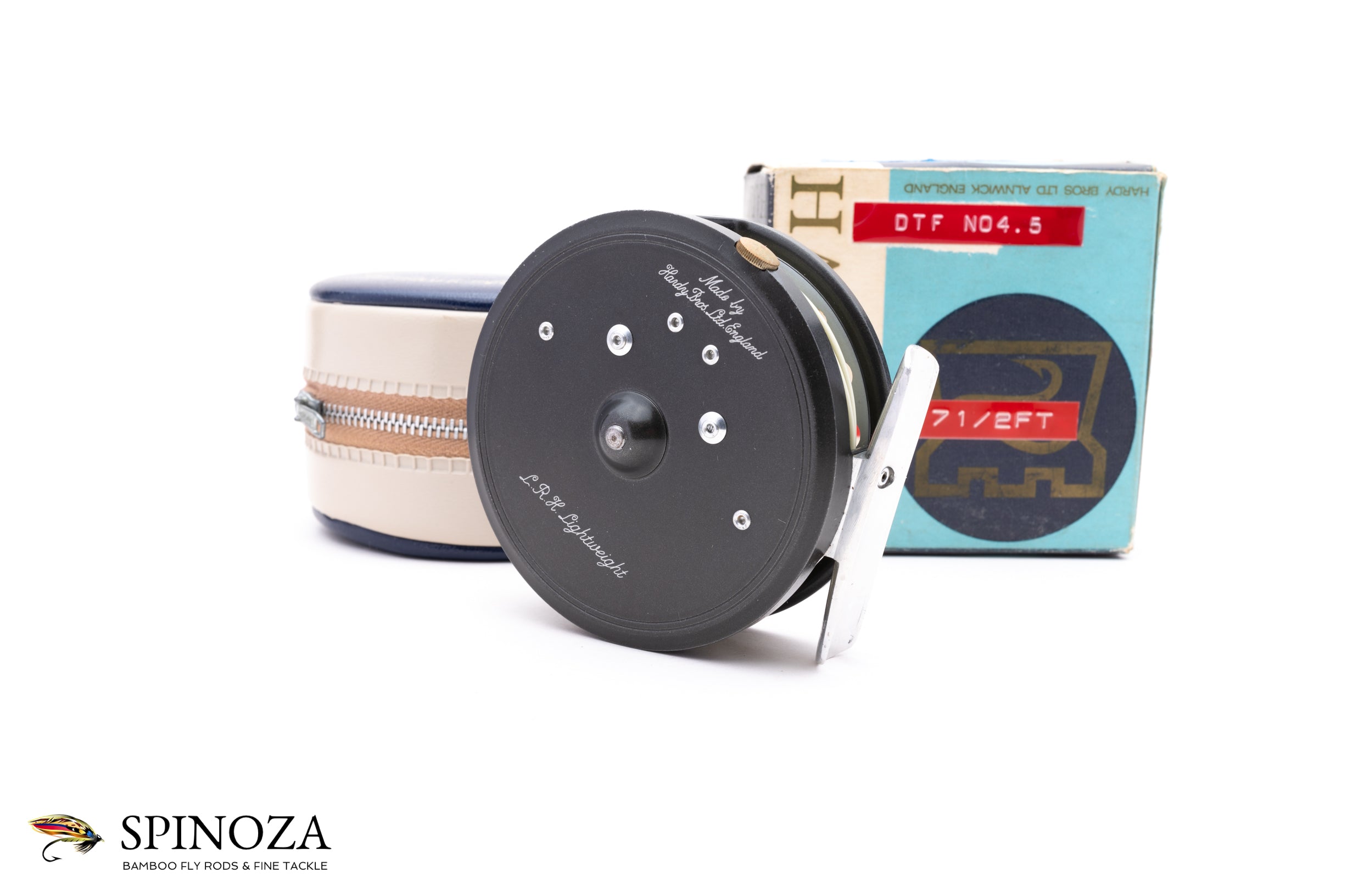 A Hardy LRH Lightweight fly reel, 3 3/16" diameter and currently set up for LHW though easily convertible. Two screw model. Made in England. Good used condition with some minor cosmetic wear here and there though nothing significant. Mechanically perfect with a nice pleasing click. A line is currently loaded on the reel. Double-screw u-shaped line guard and the tensioner and springs are in excellent condition. Capacity for a DT5+55 or DT6+20. The reel comes in the original cream and blue vinyl zipper case and the original box (there are some sticky labels attached to the box denoting the line loaded on it and which of the original owner's rods the reel was paired with).
