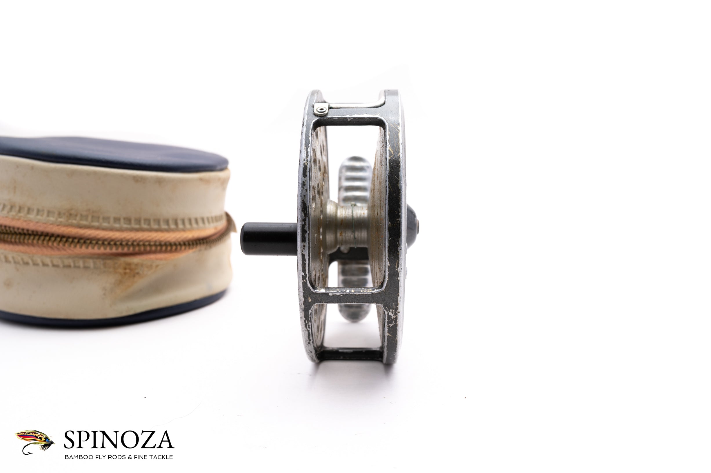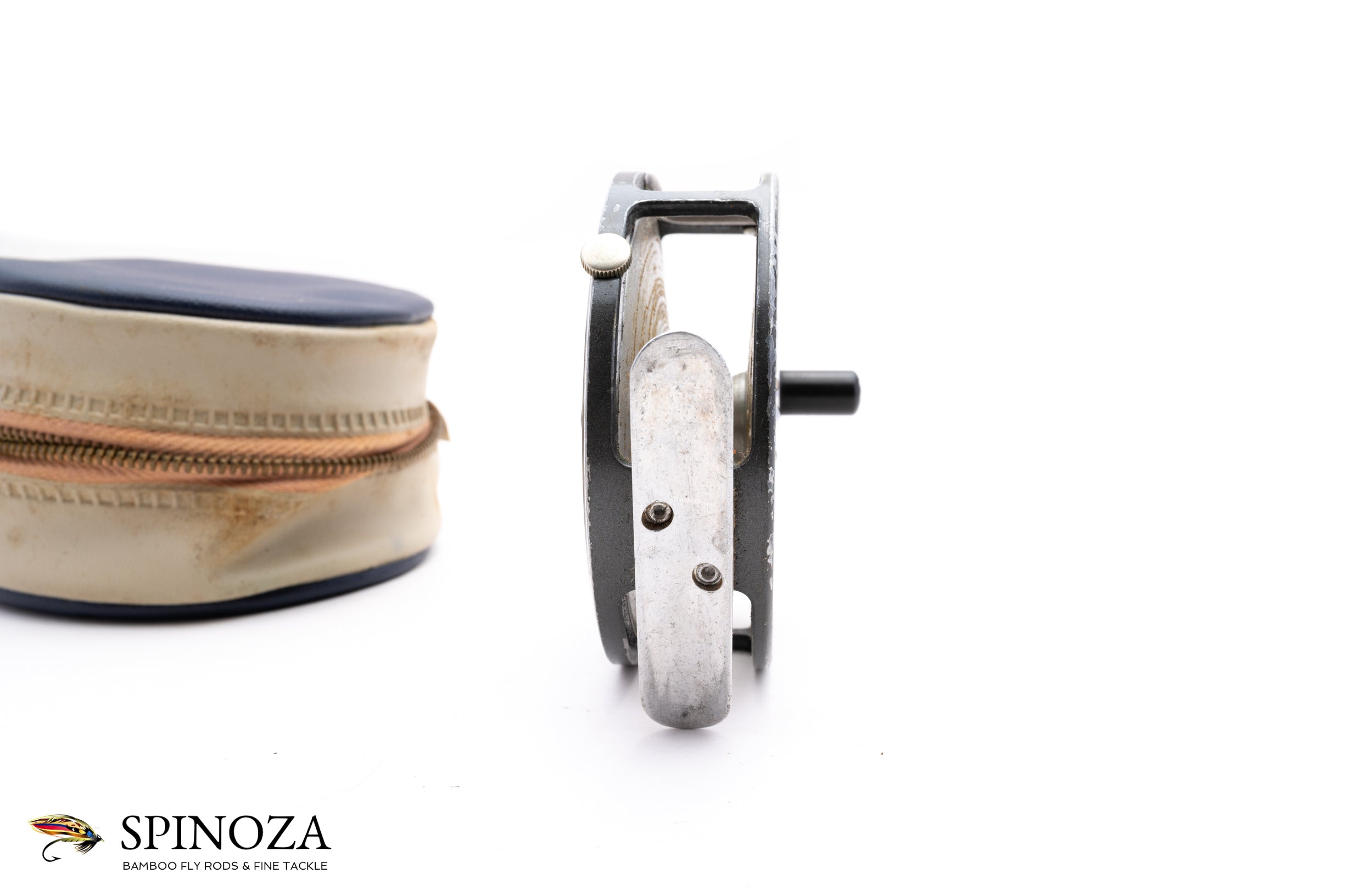 A Hardy LRH Lightweight fly reel, 3 3/16" diameter and currently set up for RHW though easily convertible. Two screw model. Made in England. Fair used condition with moderate cosmetic wear throughout, as well as some scratching on the backplate (faint initials in one area and something that has been scratched out in another). Single-screw L-shaped line guard. Capacity for a DT5+55 or DT6+20. The reel comes in the original cream and blue vinyl zipper case.