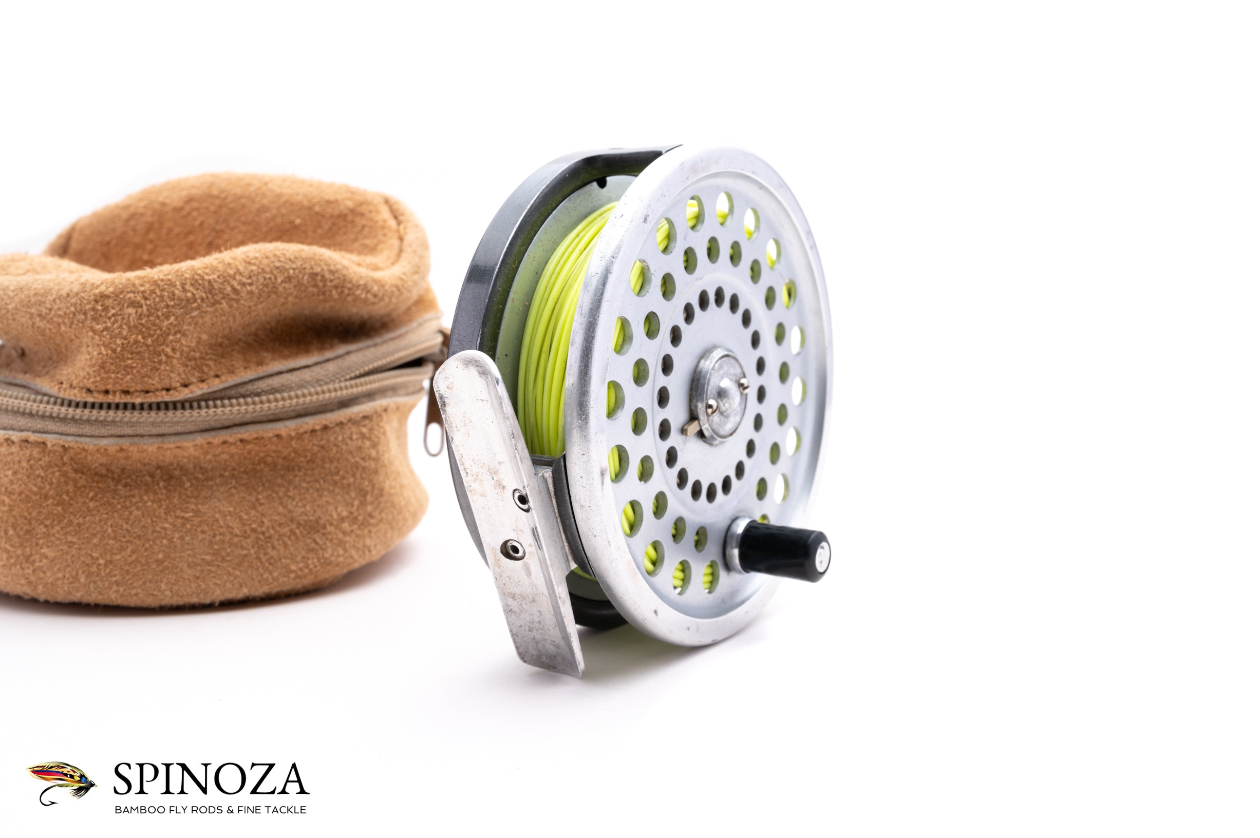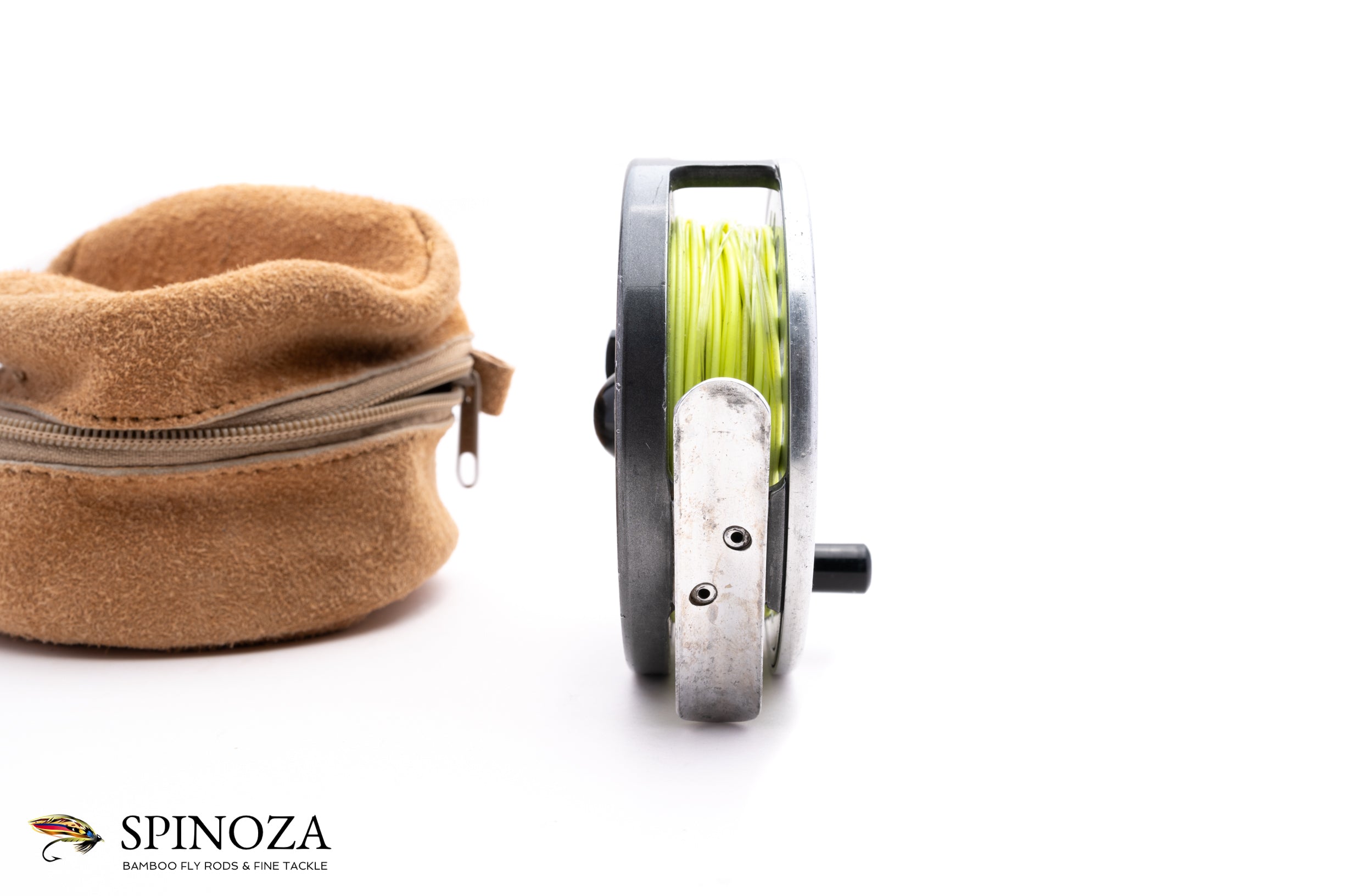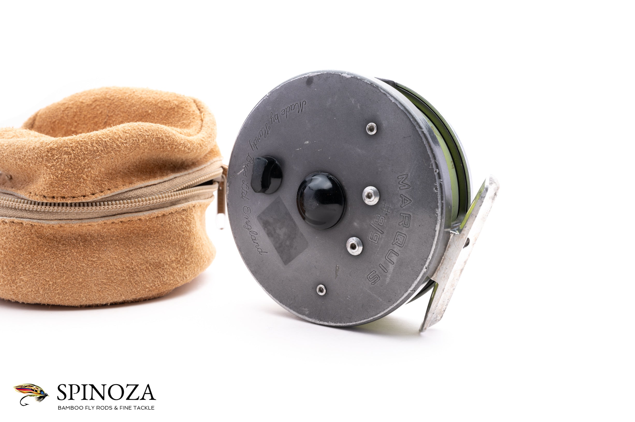 A Hardy Marquis 8/9 fly reel, 3 5/8" diameter and set up for RHW though easily reversible. Good used condition with normal cosmetic wear throughout and a leftover imprint of a line sticker on the backplate. There is a very slight catch in the reel when cranked though it's certainly fishable. Designed to hold a WF8F and 100 yards 18# dacron backing. Comes with suede zipper pouch.