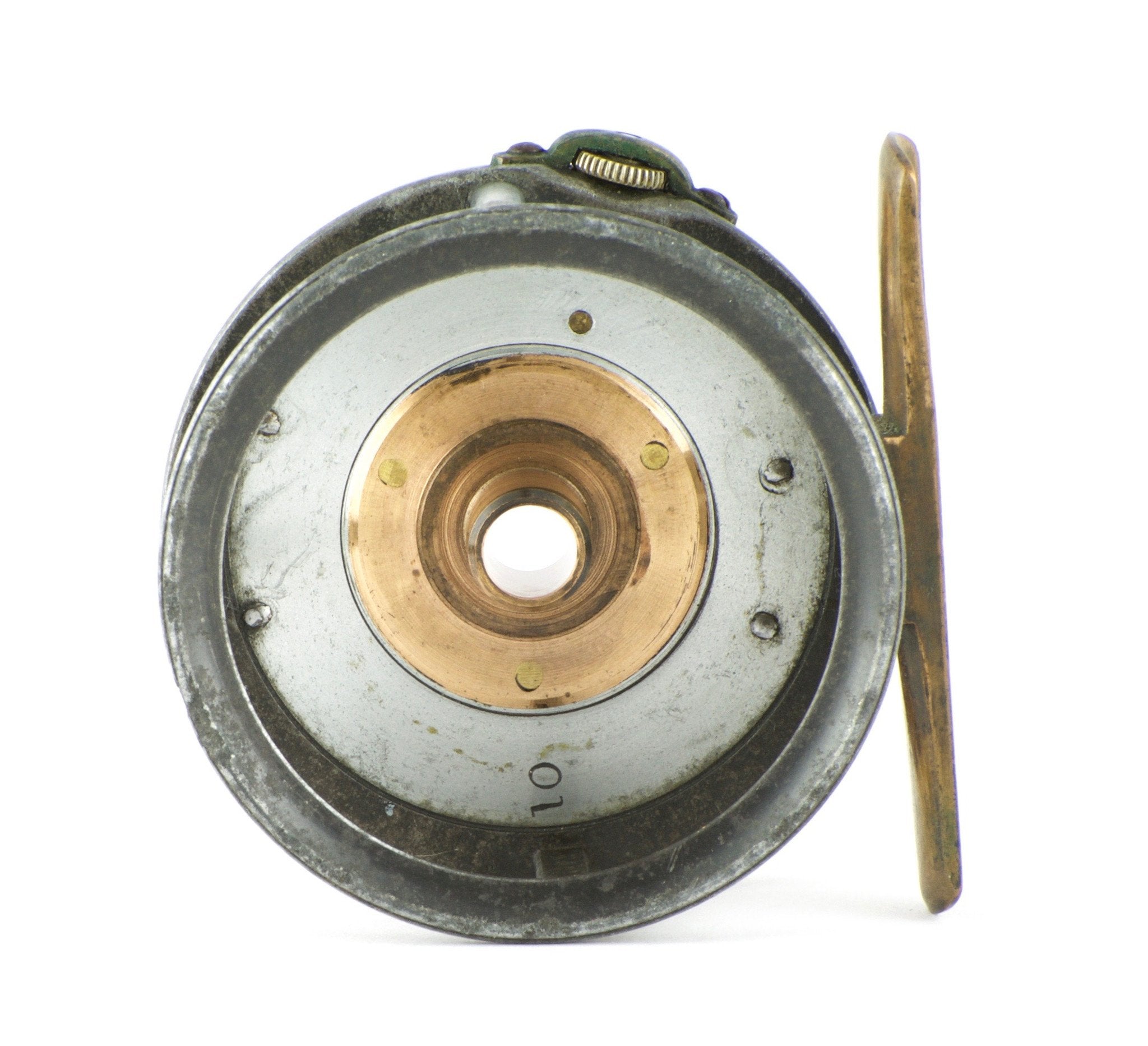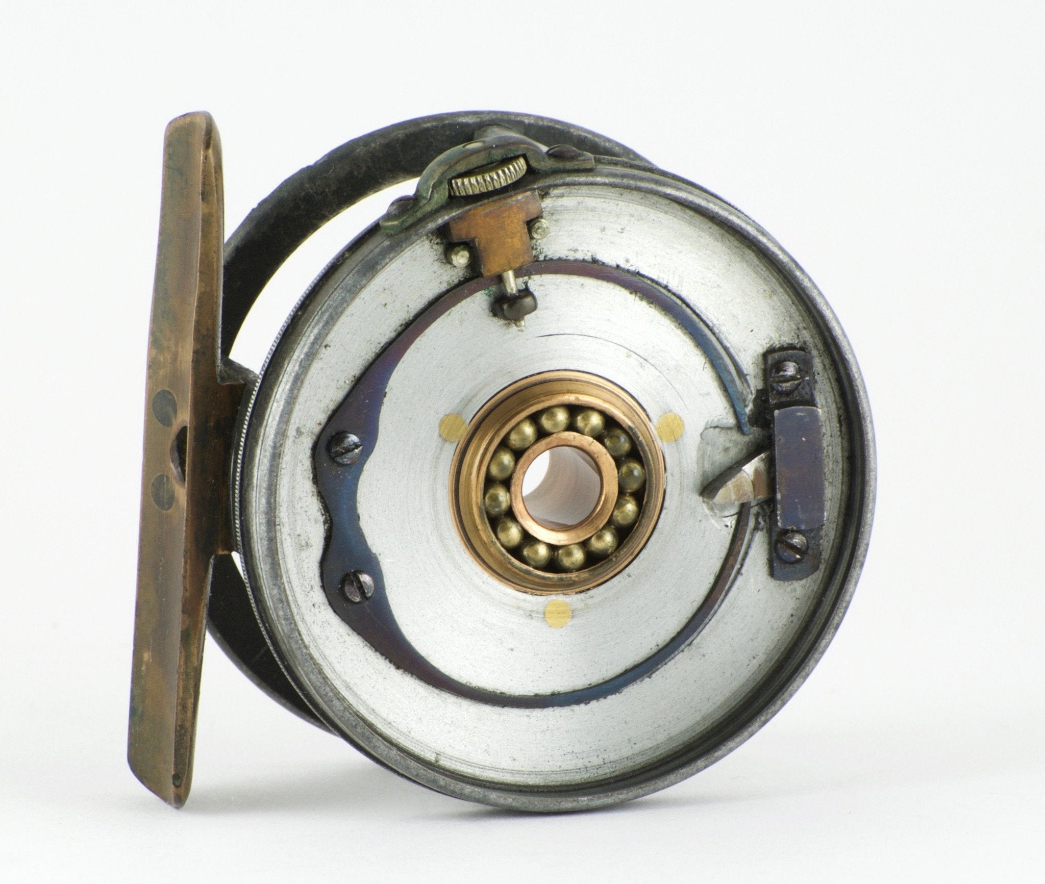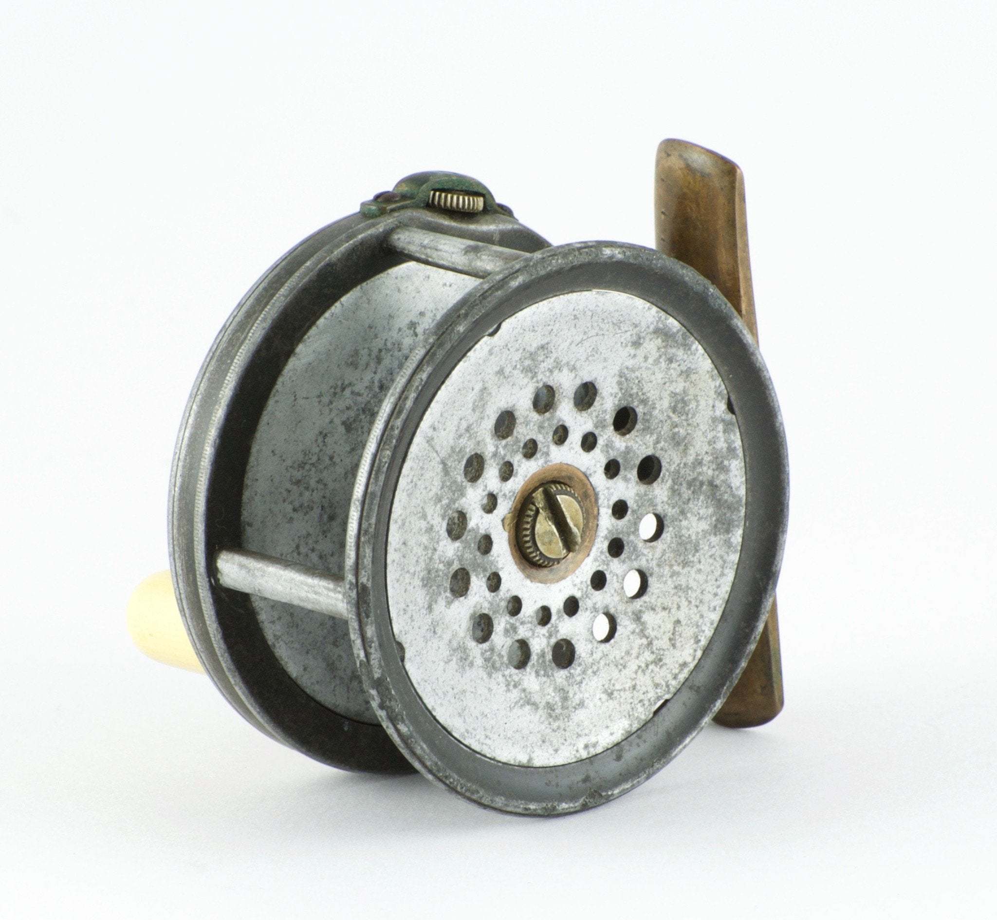For sale here is a scarce alloy 2 1/2" Hardy Wide Drum Perfect with 1896 check. All original with matching "10"s throughout. Aluminium face plate with rod in hand and straight line logos. Rarely does one find an alloy Perfect like this with the rod in hand logo. Full length foot and strapped tension adjuster. The frame remains structurally sound with no cracks. There is some rim rash however.