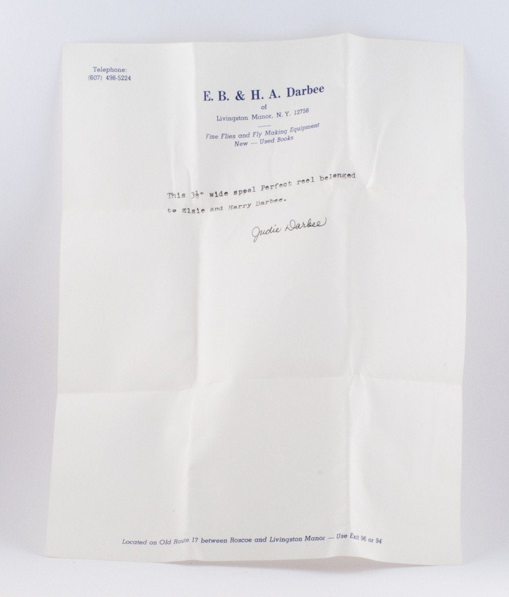 For sale here is a 3 1/2" Hardy Perfect wide drum fly reel from the pre-WWII era that belonged to the late Catskill fly tying greats, Harry & Elsie Darbee. The reel is in excellent original condition. The original ribbed brass foot is full length and unmolested. No chips, cracks, or line grooves. Excellent spool/spindle fit. The reel comes with a letter from Judie Darbee (in a Marty Keane envelope) and is housed in an Abercrombie and Fitch zippered reel pouch. The reel weighs 10.85 oz. The reel foot is 3 1/8" in length. Don't let this one get away!