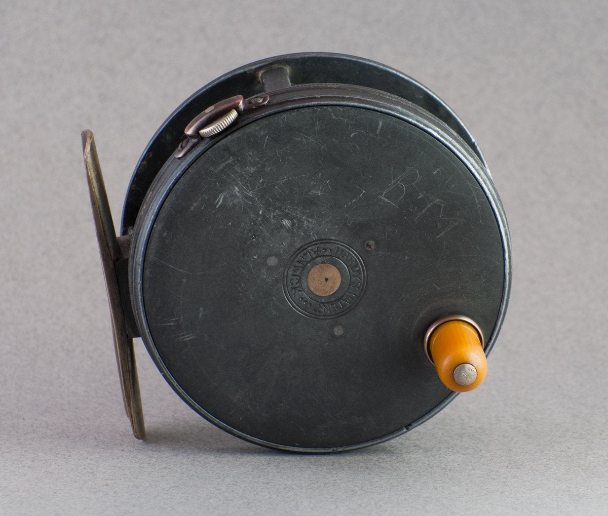 For sale here is a Hardy Perfect 3 1/8" diameter reel with 1906 check system. Wonderful amount of original leading remains on the reel surface. No spool movement - tight spindle fit. It has the matching number "9" on the main three parts of the reel. Smooth brass foot may have been shaped a little, but if so, it's very near original. It's also not precisely straight, but I tested it on my rods and it fits my reel seats. Stunning ivory handle spins freely. Strap over tensioner which works perfectly. Some yahoo scratched his two initials into the winding plate, but they don't penetrate deeply at all. You can see these in the photos. I've seen much worse!