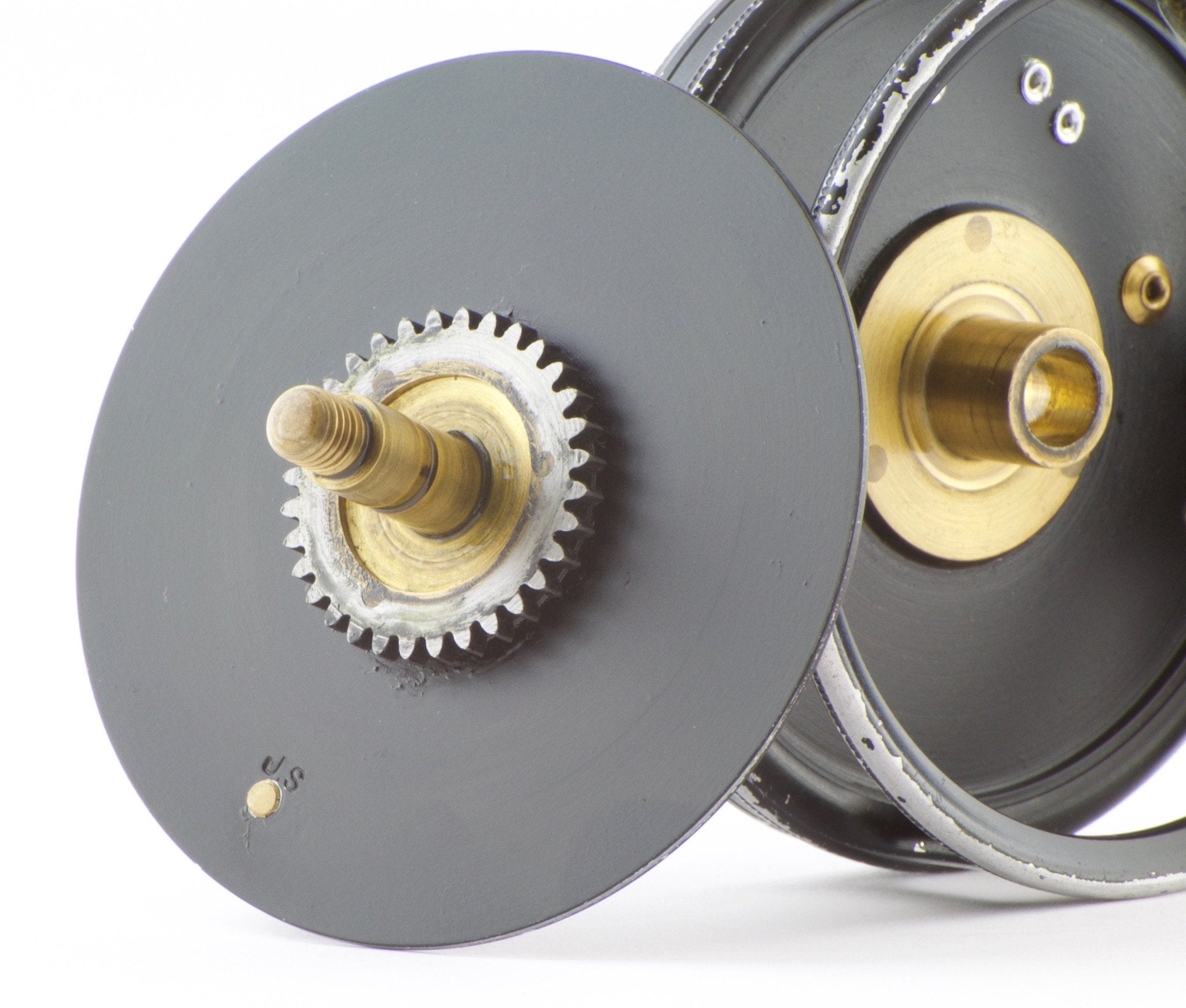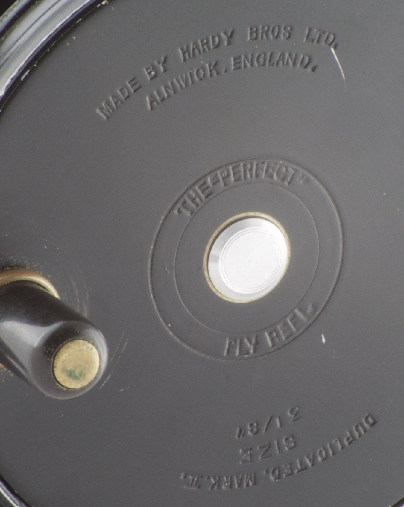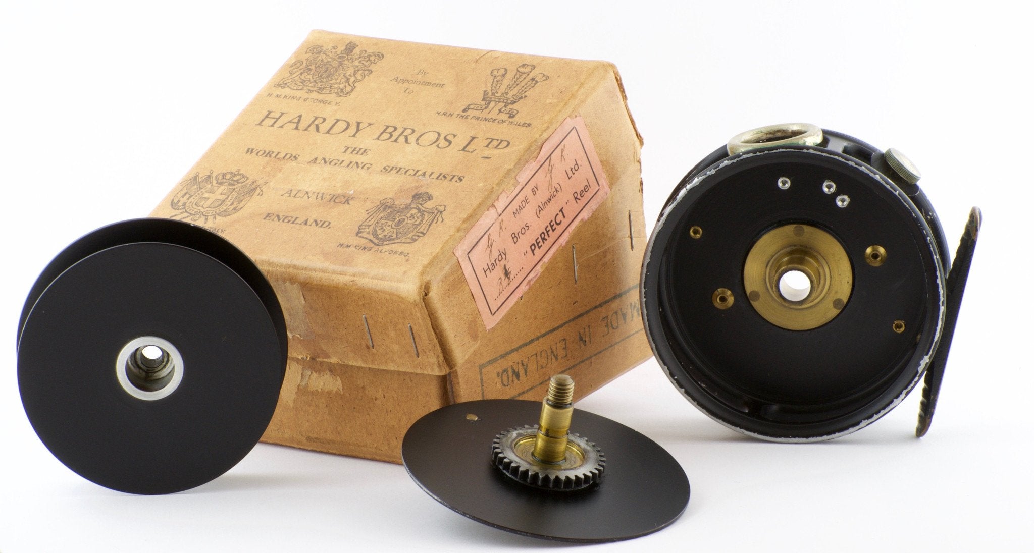 For sale here is a wartime-era Hardy Perfect 3 1/8" trout fly reel with German silver line guide, full-length ribbed brass foot, ebonite handle, and rim tension regulator. Comes housed in an original Hardy box! Dual spring/pawl Duplicated MKII check. A very nice reel mechanically and cosmetically. The reel weighs 6 1/8 oz. Jimmy Smith's initials appear on the winding plate. The reel foot measures 2 7/16". A collectible Perfect someone will be delighted to add to his/her collection!