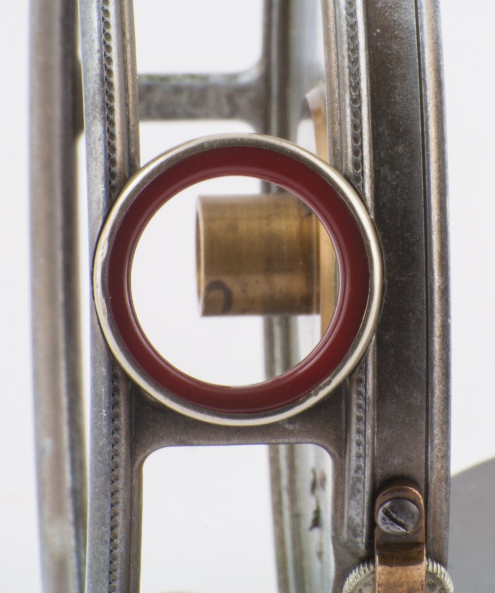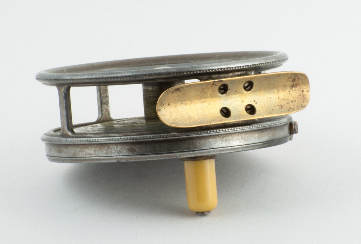 For sale here is a Hardy Perfect with a highly coveted 1912 check and un-blemished red agate line guide. 3 3/8" diameter. The smooth brass reel foot measures 2 3/8" and may have been shortened/shaped, but if so, was done very uniformly. Ivory handle spins freely but does rotate with a little friction. Strap over tensioner works perfectly. All parts of the reel are stamped "5". Good overall condition mechanically with some slight play in the spool/spindle.