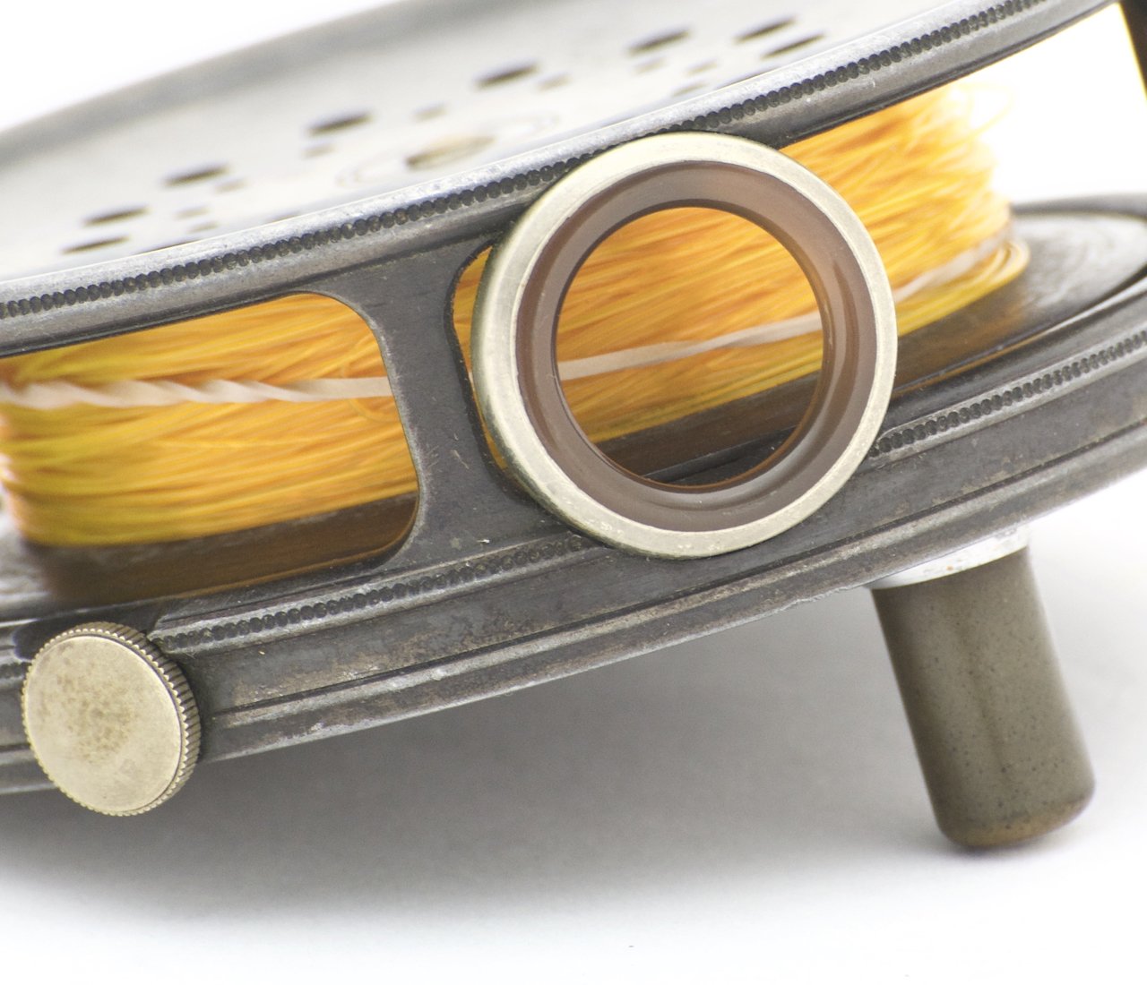 The reel is in excellent overall condition. Pristine agate line guide with no cracks and a beautiful dark hue. The original ribbed brass reel foot is full-length. No chips, cracks, or line grooves. Mechanically excellent fit.
