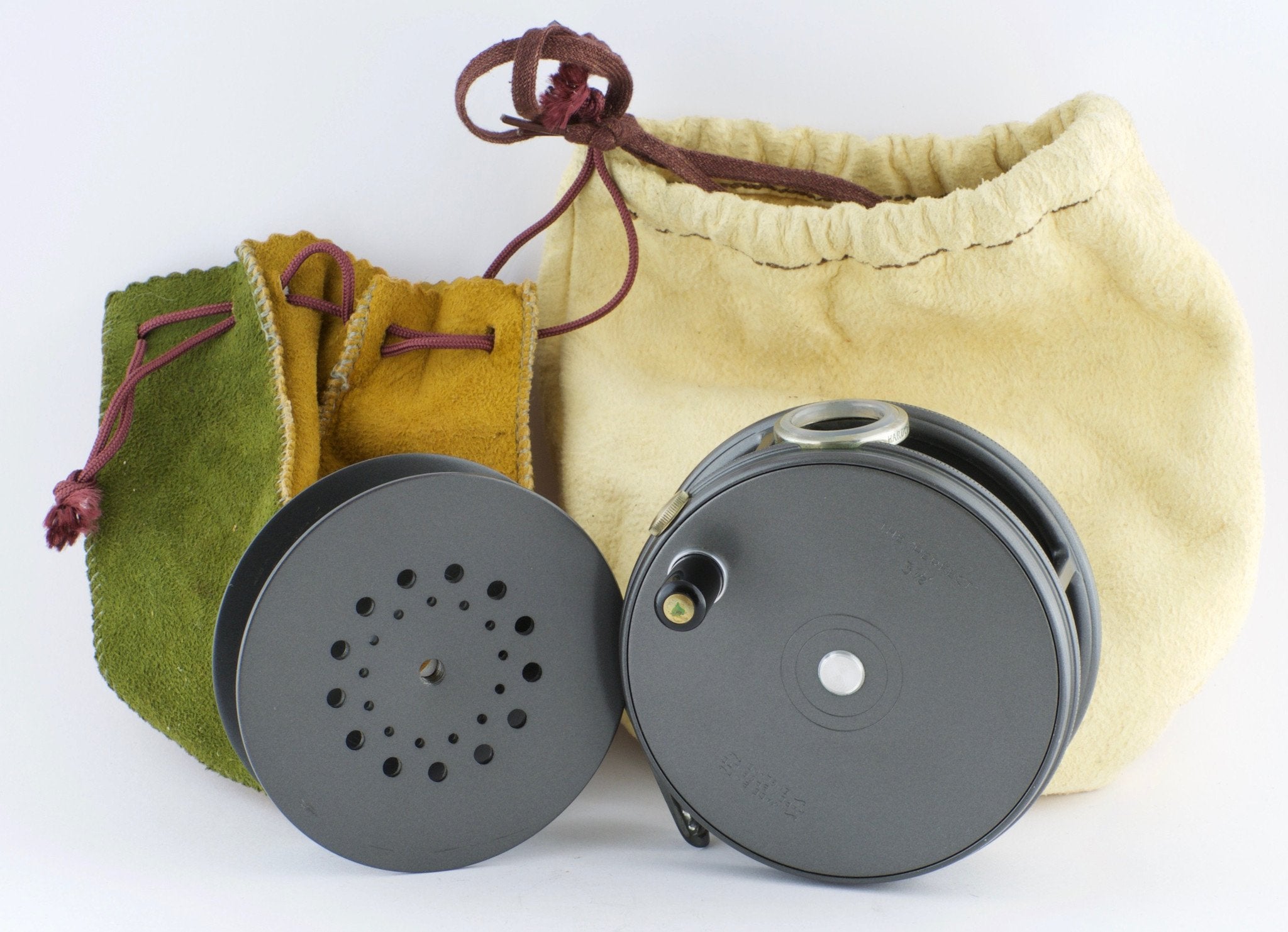 For sale here is a 1950s Hardy Perfect 3 7/8" with the Duplicated MKII check and unblemished agate line guide. Full length and unaltered ribbed brass foot with the factory lacquer still present. Ebonite handle spins freely. Tensioner works perfectly. No line burns. No cracks/chips/dings. No problematic wobble or end play. NEAR MINT CONDITION!Comes with and extra spool and the reel/spool cases shown in the photos.