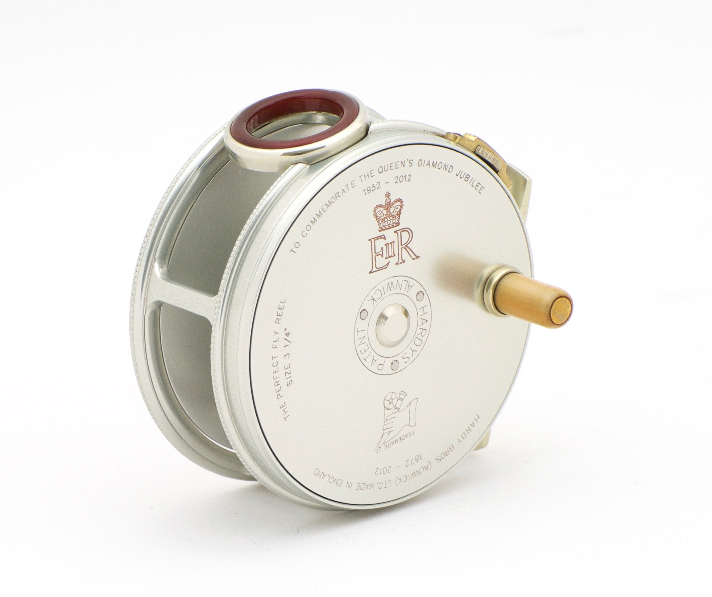 For sale here is a Hardy Perfect Diamond Jubilee Fly Reel. Mint condition. Left hand retrieve. This reel is a late prototype of the limited edition of just 250 reels to commemorate the Queen's Diamond Jubilee and 140 years of Hardy Bros. Equipped with red agate line-guard set in a handmade nickel silver bezel. 1912 adjustable check system with ivorine handle. 3 1/4" diameter. 5.9 oz. Capacity DT6+35m or WF7+60m.
