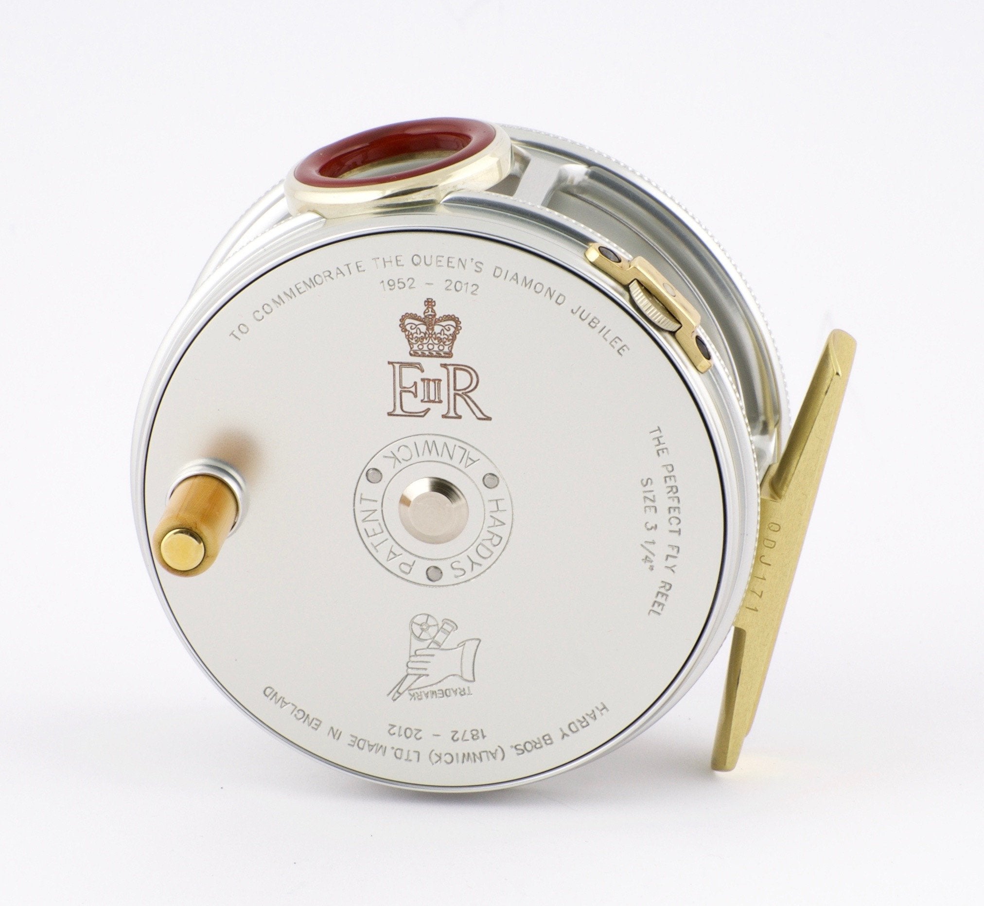 For sale here is a Hardy Perfect Diamond Jubilee Limited Edition Fly Reel. Near mint++ condition. Left hand retrieve. One of a limited edition of just 250 to commemorate the Queen's Diamond Jubilee and 140 years of Hardy Bros. Equipped with red agate line-guard set in a handmade nickel silver bezel. 1912 adjustable check system with ivorine handle. Supplied with its original marked presentation box as well as a commemorative limited edition Hardy Bros Medallion. Also included is a handmade black leather reel case and paperwork. 3 1/4" diameter. 5.9 oz. Capacity DT6+35m or WF7+60m.