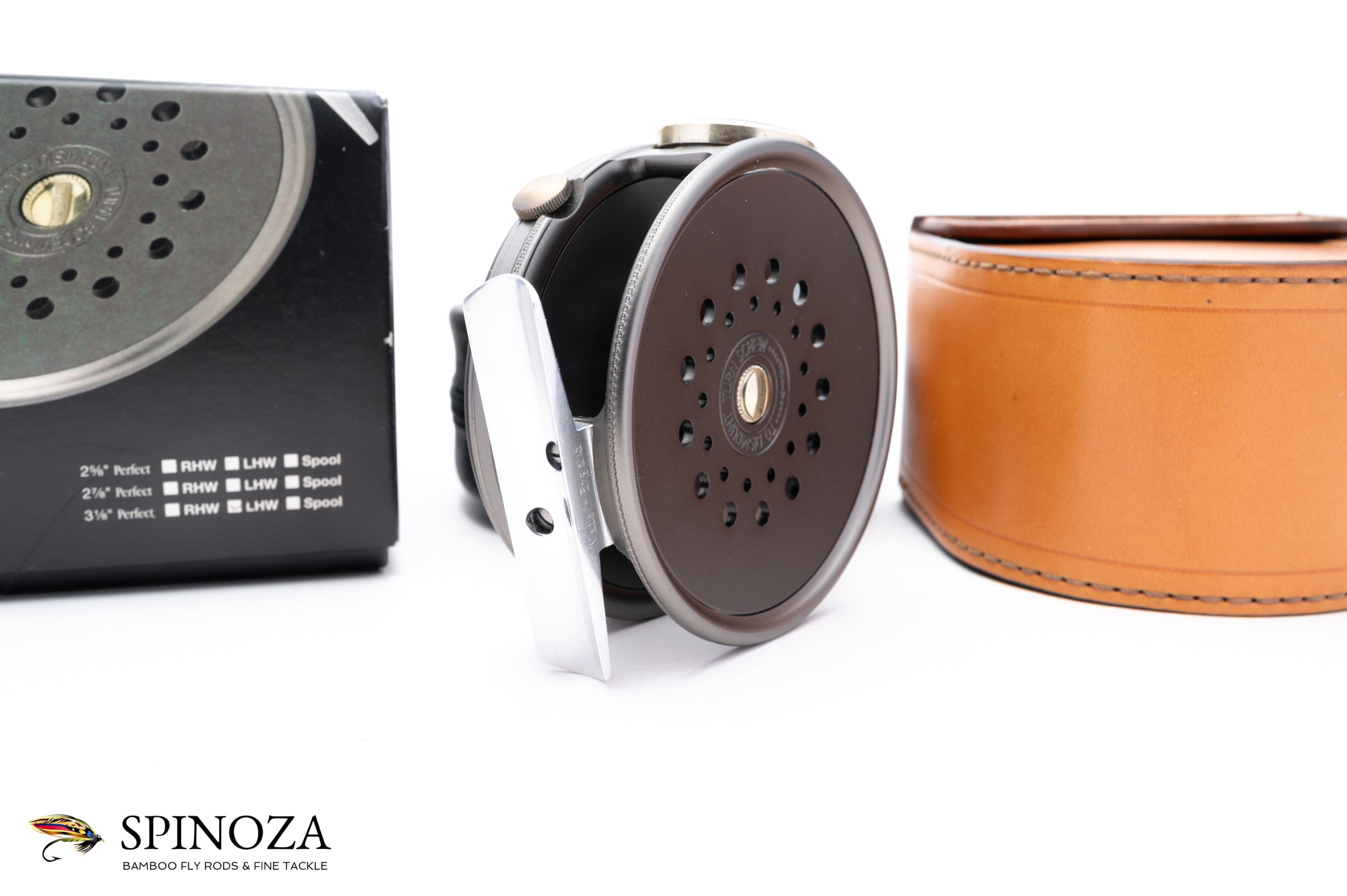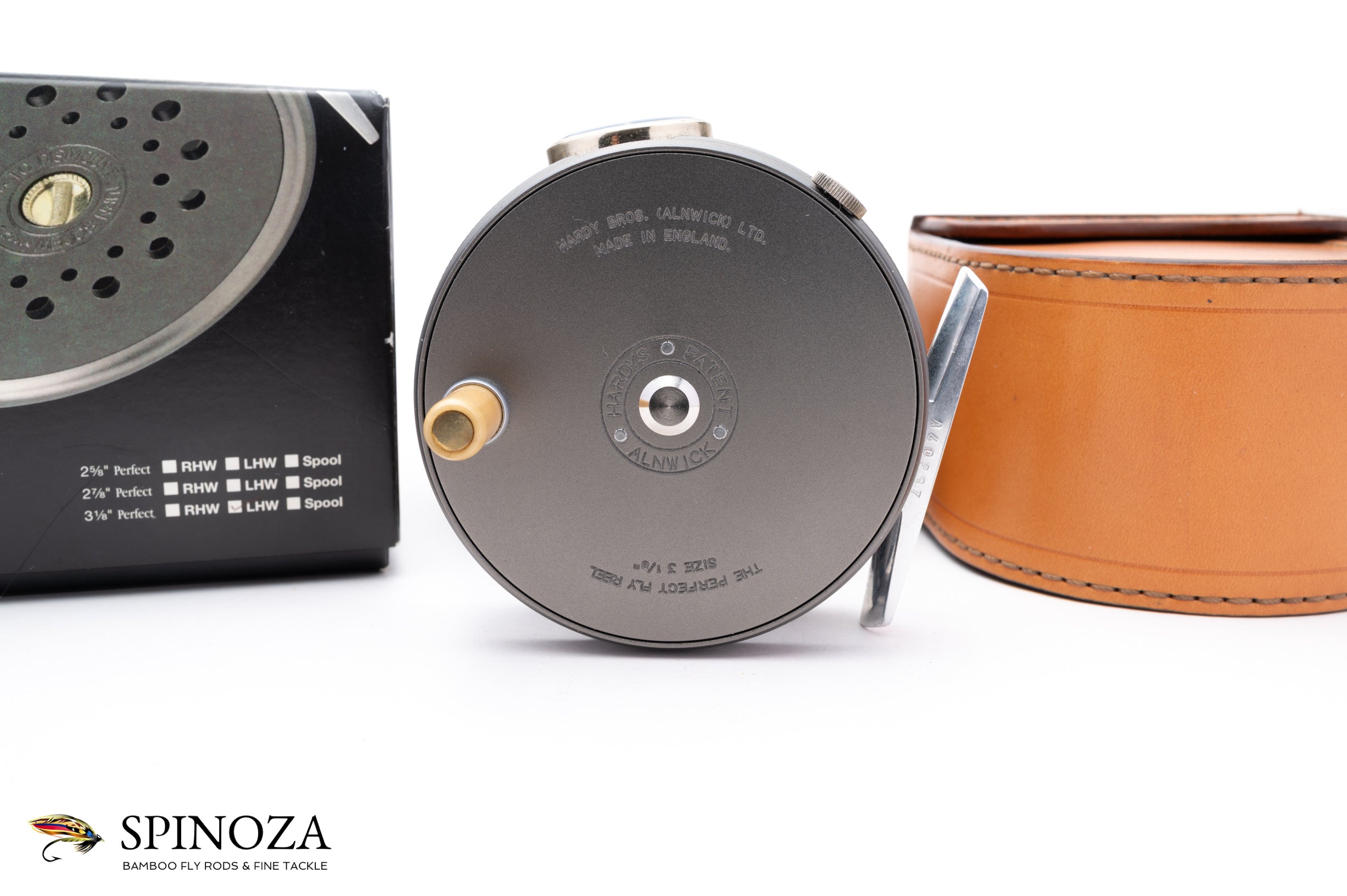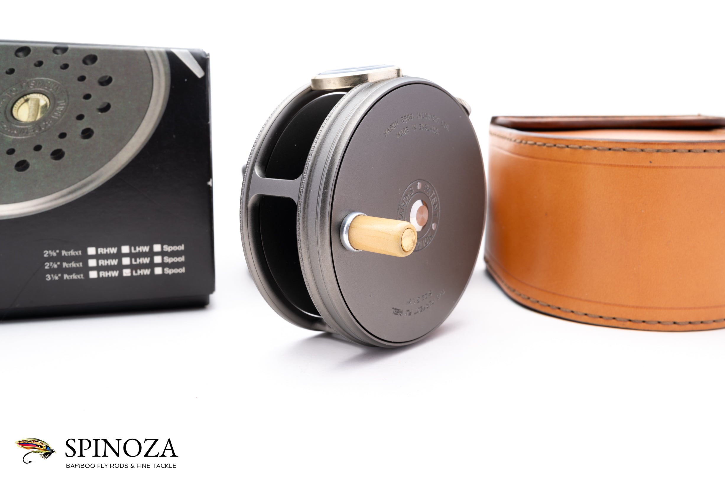 A nice Hardy Perfect fly reel, 3 1/8" diameter and set up for LHW. This is the modern reissue of this classic, and this one comes with an additional block case made by Olaf Kundrus. Made in England. Mint condition. Polished line guard. Smooth pleasing click. Designed to hold a #5 with ~ 70 meters of backing. In addition to the Kundrus case, this one also comes with the original box, black zippered reel case, and papers including the warranty card.