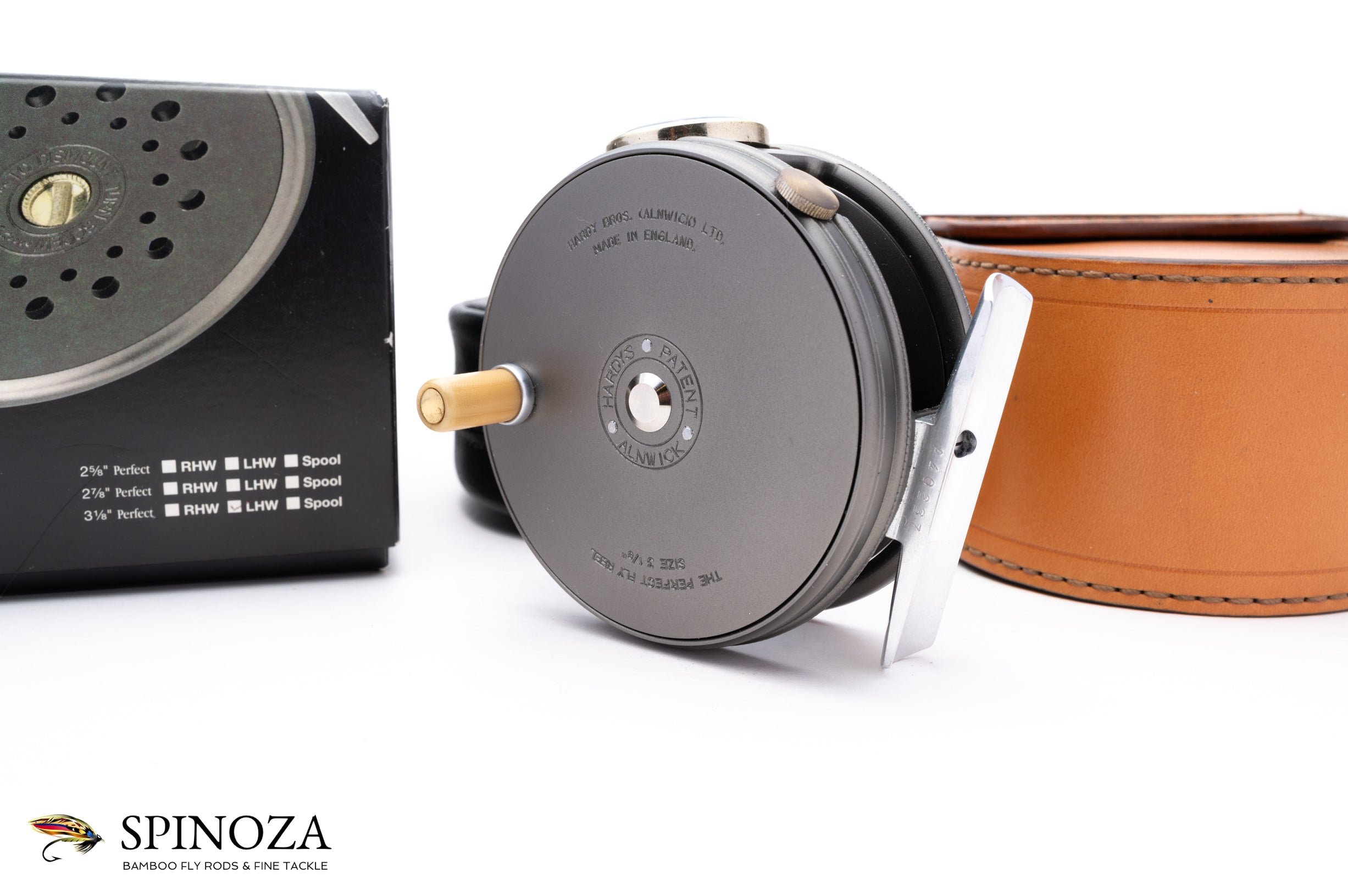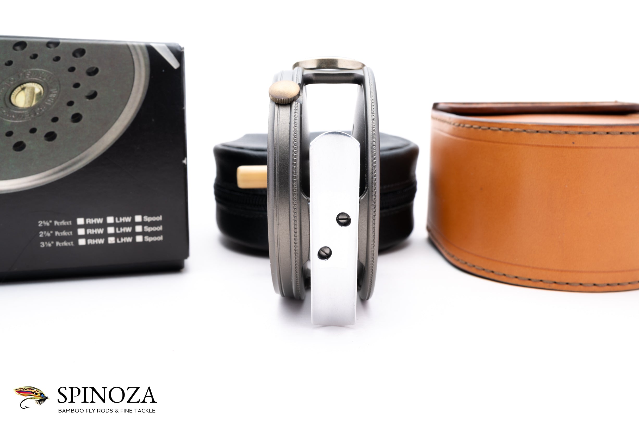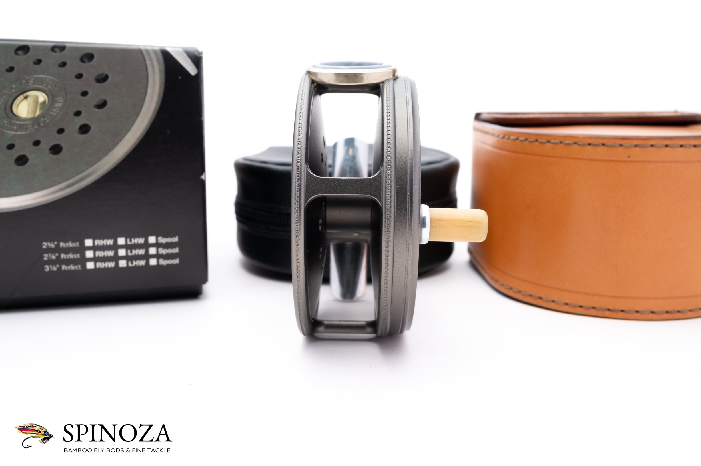 A nice Hardy Perfect fly reel, 3 1/8" diameter and set up for LHW. This is the modern reissue of this classic, and this one comes with an additional block case made by Olaf Kundrus. Made in England. Mint condition. Polished line guard. Smooth pleasing click. Designed to hold a #5 with ~ 70 meters of backing. In addition to the Kundrus case, this one also comes with the original box, black zippered reel case, and papers including the warranty card.