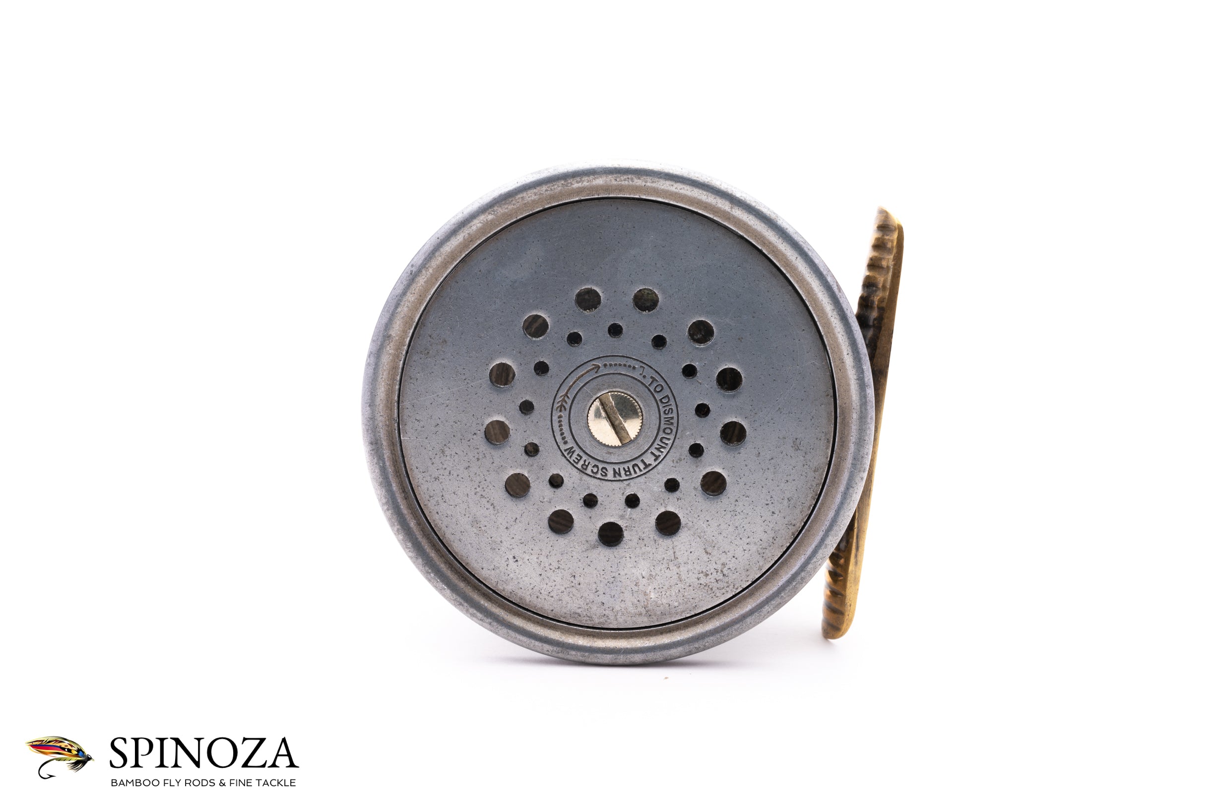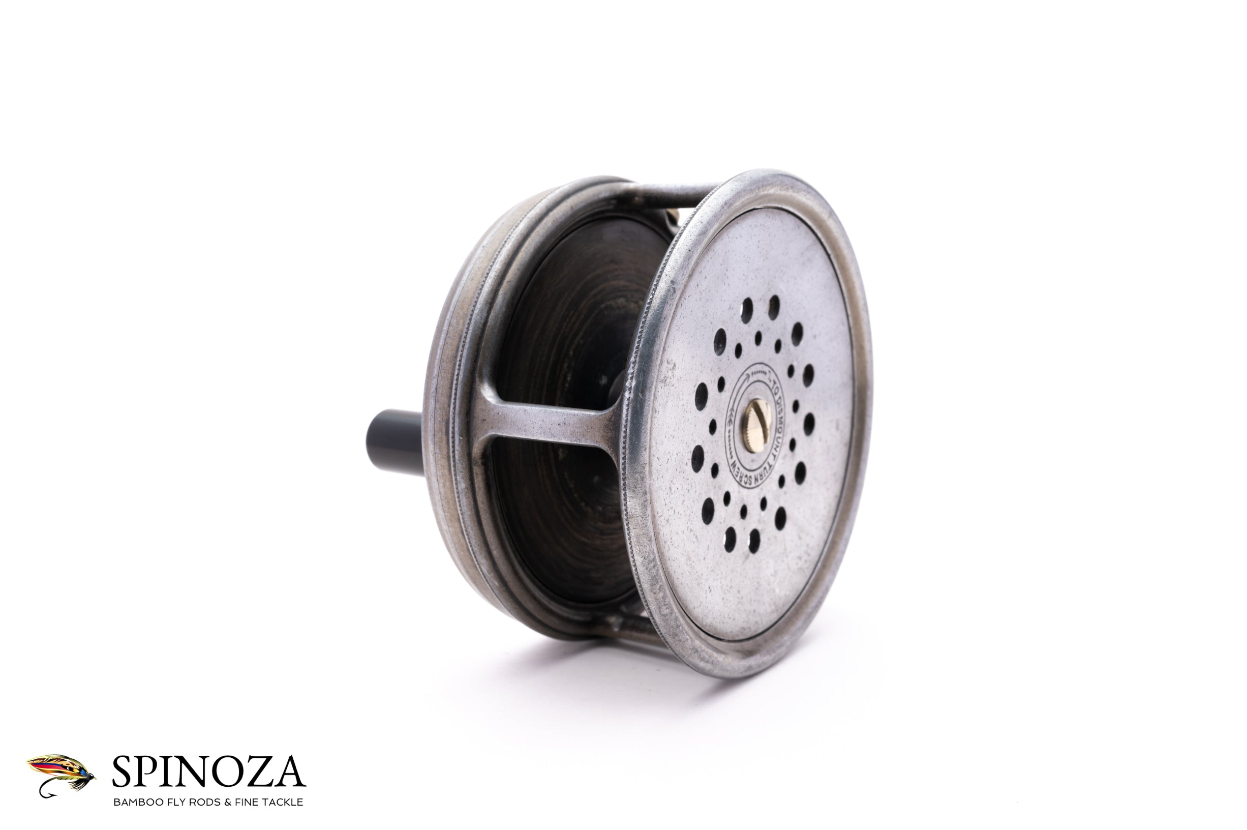 A very nice Hardy Perfect wide drum salmon reel, 3 1/2" and set up for the typical RHW. An early leaded finish reel in excellent overall condition. The winding plate and spool are mostly devoid of the original leaded finish, but other than that, and some very minor line burn at one small spot on the frame edge, the reel is in superb shape. Duplicated Mark II check that's nice and smooth. Full length ribbed brass foot. Ebonite handle. The tension adjuster works great. Hardy reelmaker Jimmy Smith's (1908-1960) initials are stamped on the inside of the winding plate. No bag.