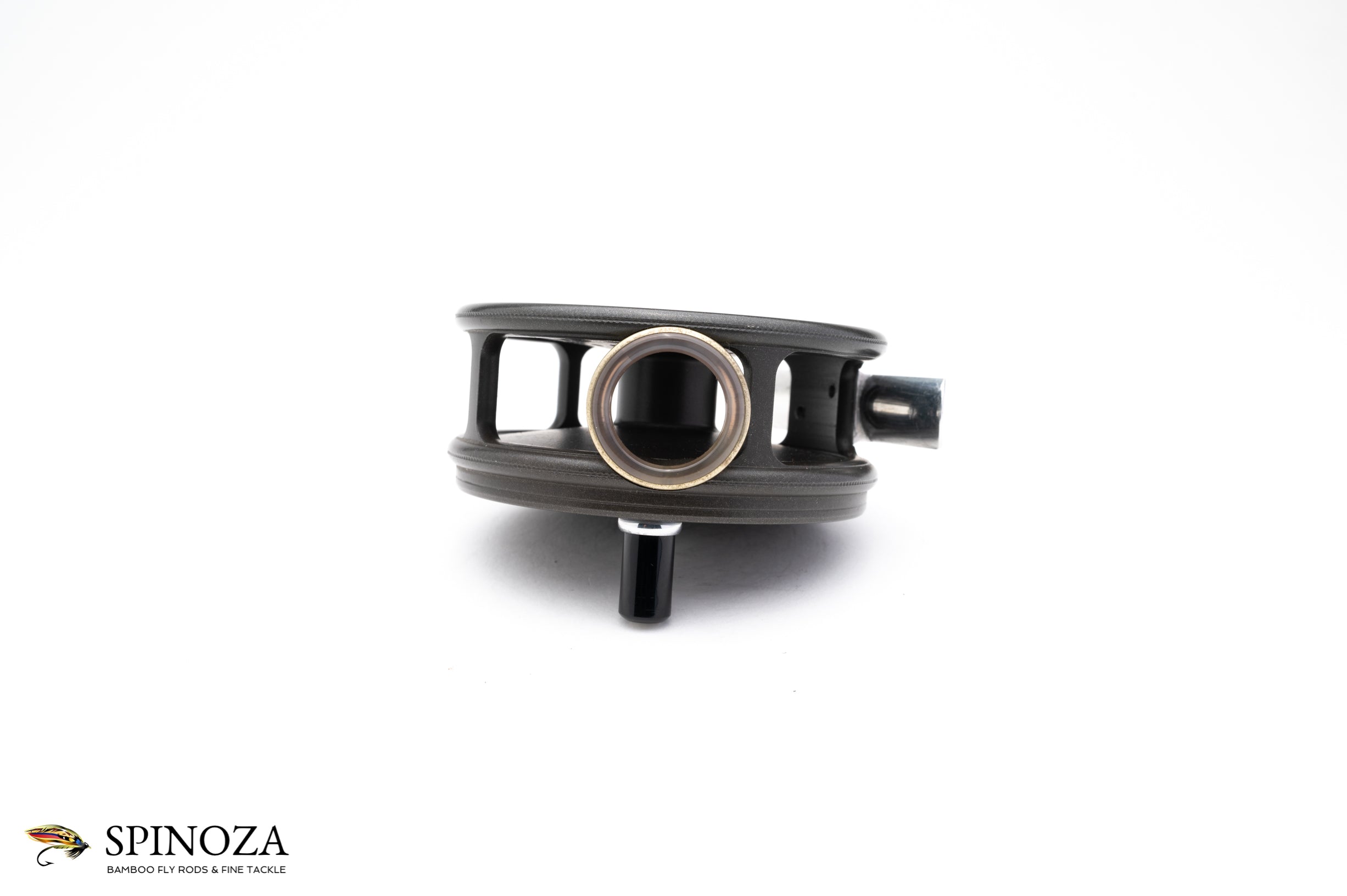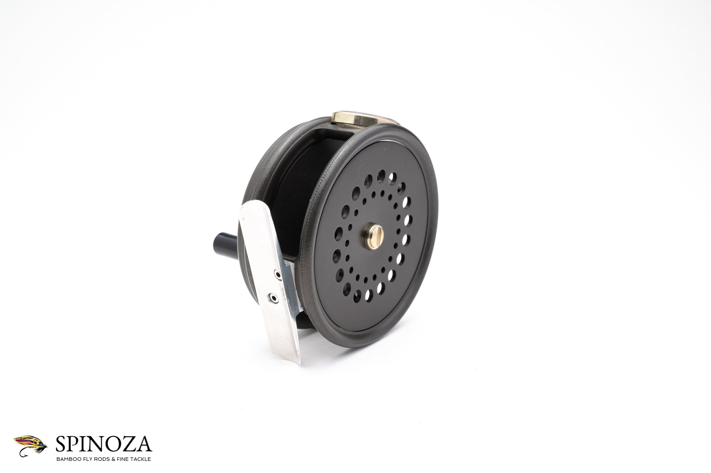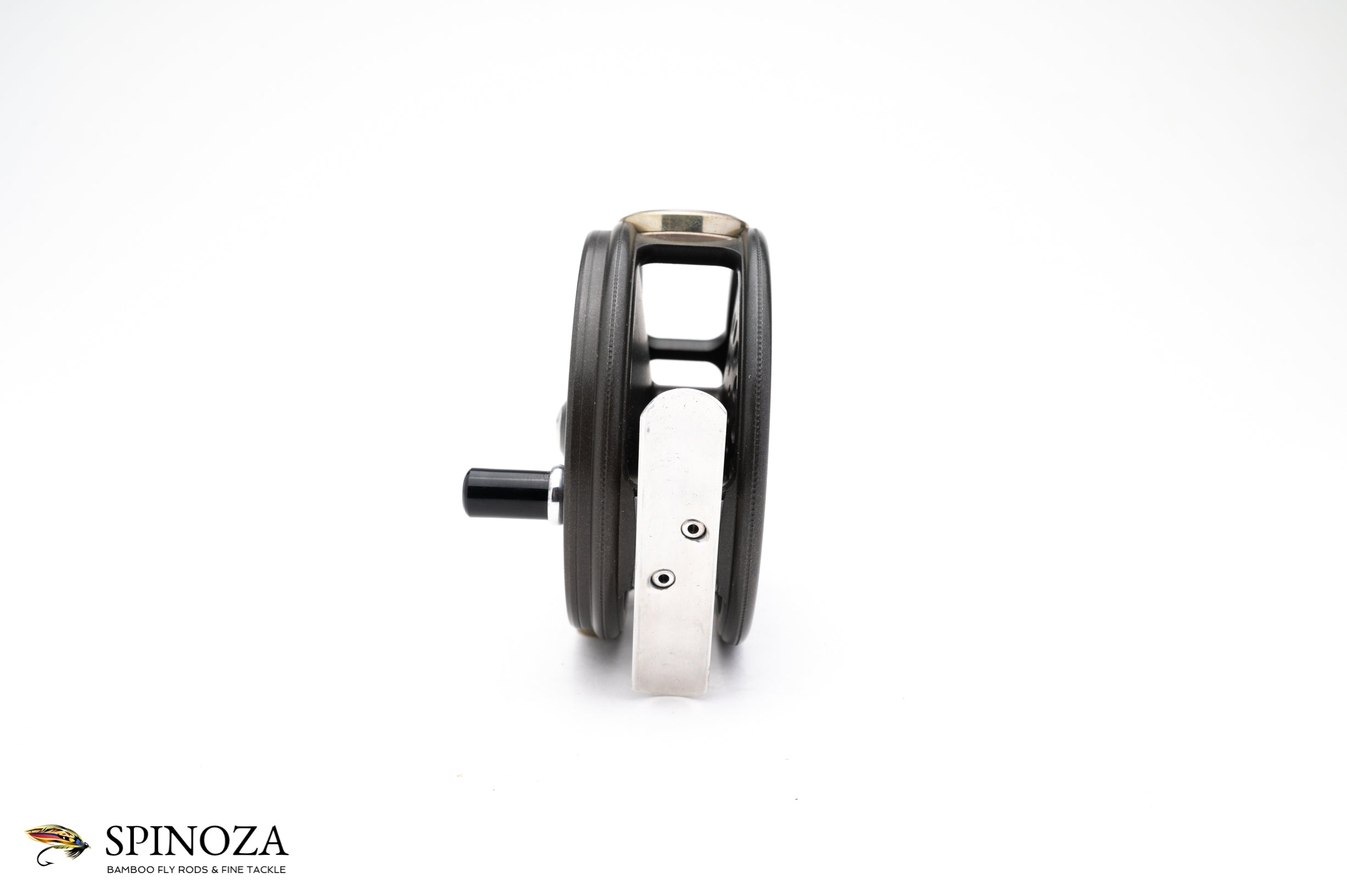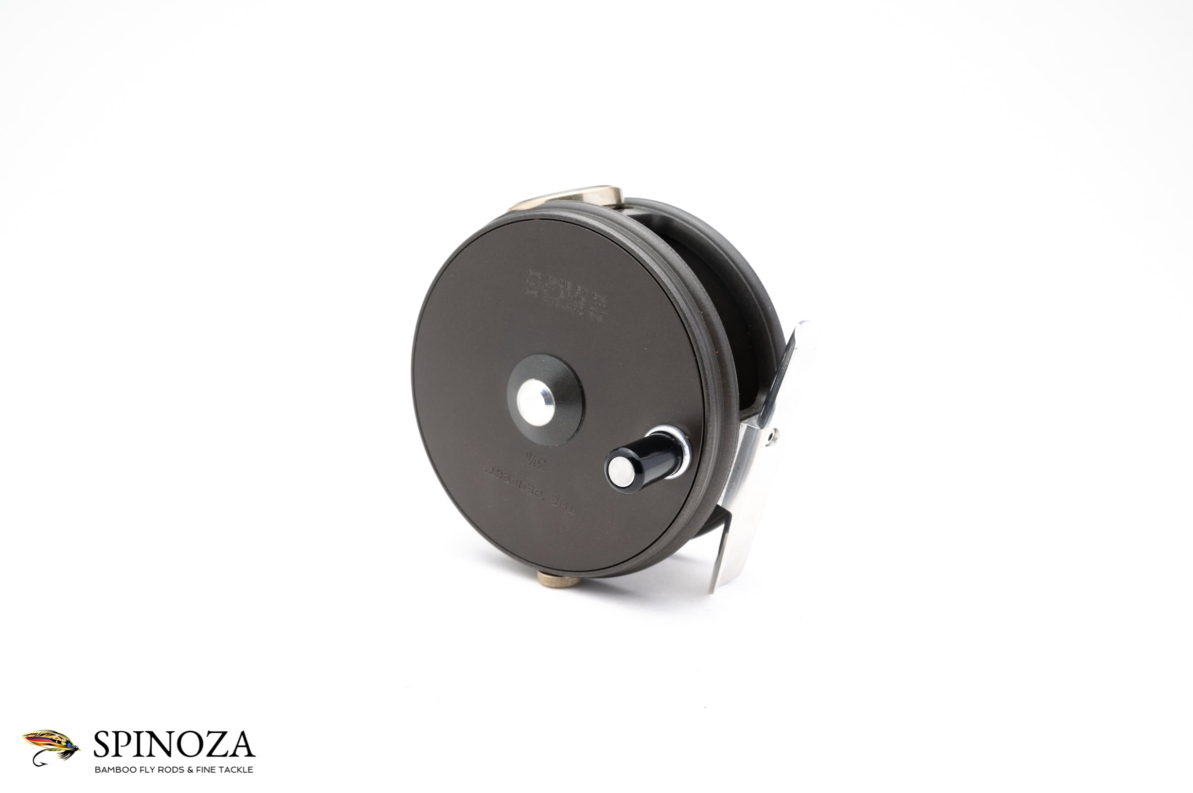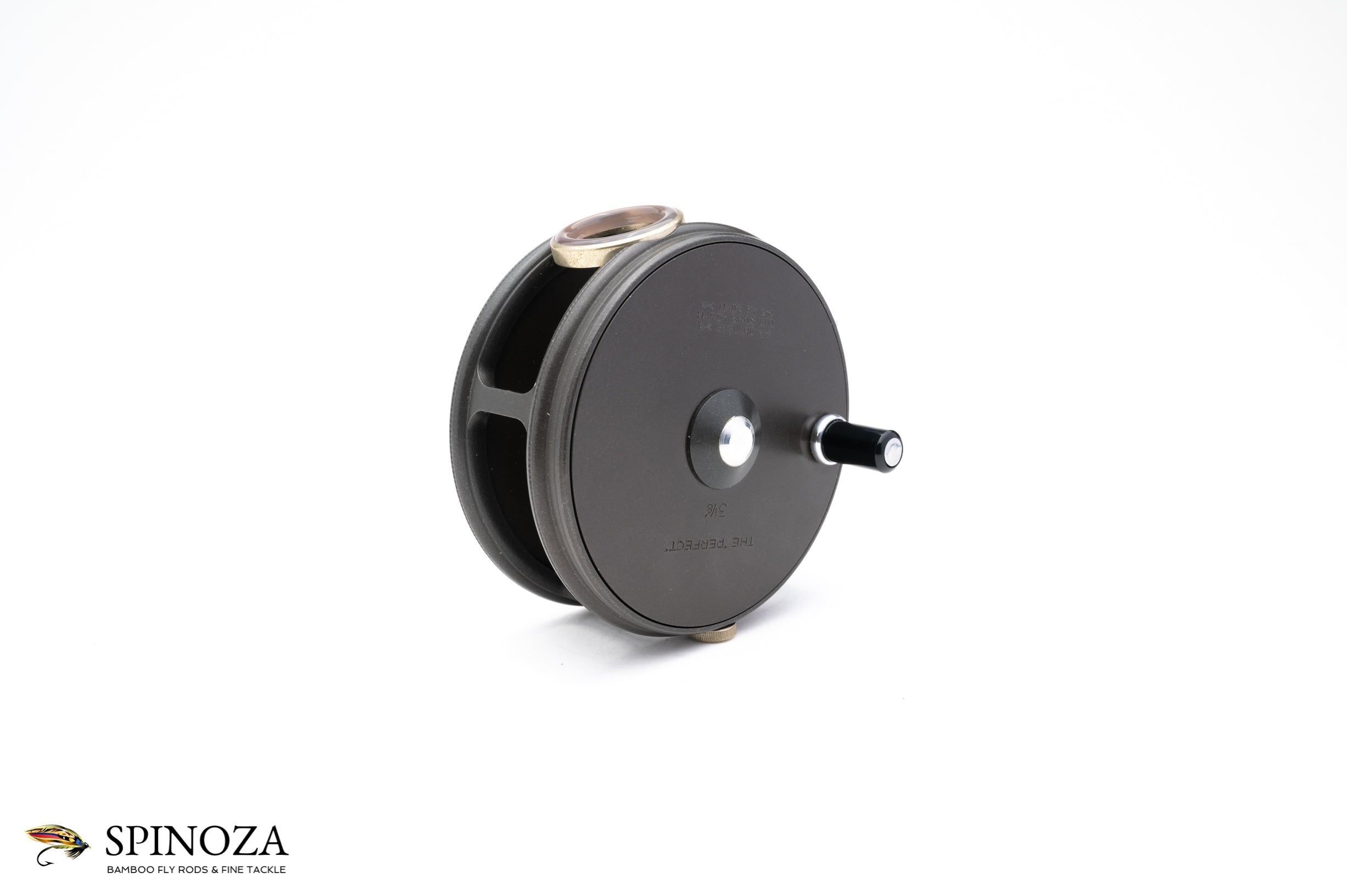 A Hardy Perfect 3 1/8" fly reel, set up for LHW. Gray enamel finish with a light smoke agate lineguard. Near mint condition. In fact the only sign of use I could see were some mounting marks on the foot so I suspect it was mounted on a rod but not fished or fished only very lightly. The frame and spool are unblemished and the agate is clean. Modern pawl drag design and the reel is tight mechanically. Straight line lettering on the winding plate. No bag or case.