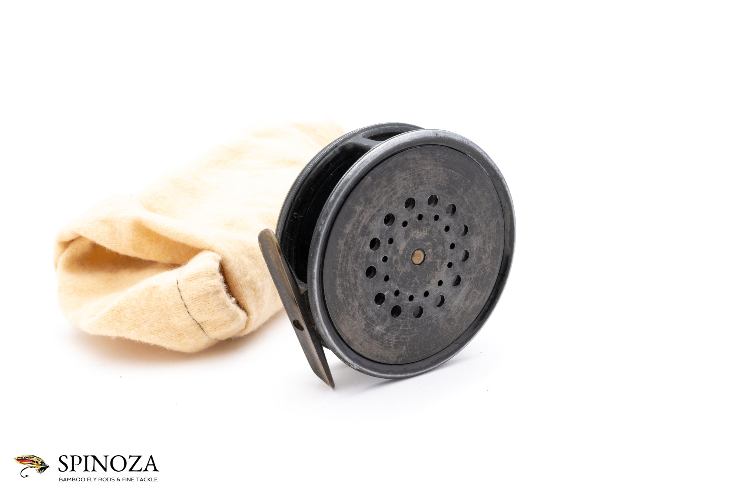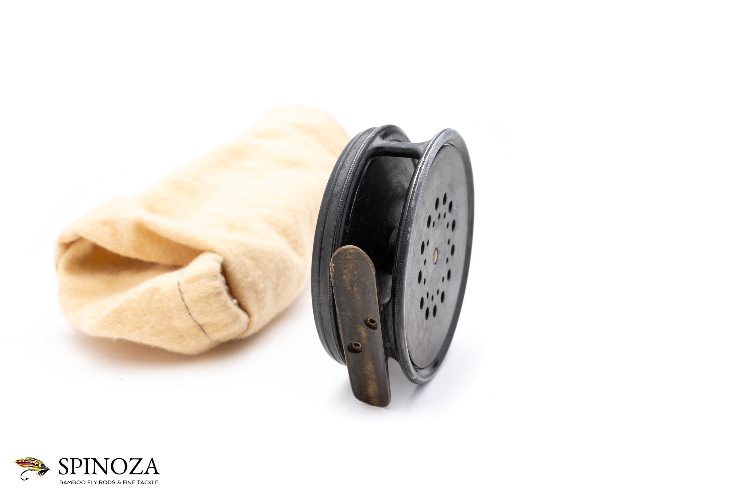 A nice Hardy Perfect trout reel, 3 3/8" in diameter. RHW. Approximately 11/16" spool width. Duplicated Mark II check with a nice satisfying click on the inbound and outbound. Nice leaded finish that is in excellent shape overall. The frame, plates, and spools are in great shape. One pillar has a little bit of line wear at the corner but it's mostly cosmetic and quite shallow. Straight line logo on the winding plate. Inside the winding plate are the initials "TA" for Thomas Appleby, presumably, who was at Hardy from 1920-1947. Smooth brass foot that appears unmodified and is 2 7/16" in length. Nice overall reel here and it should hold a #6 line perfectly.