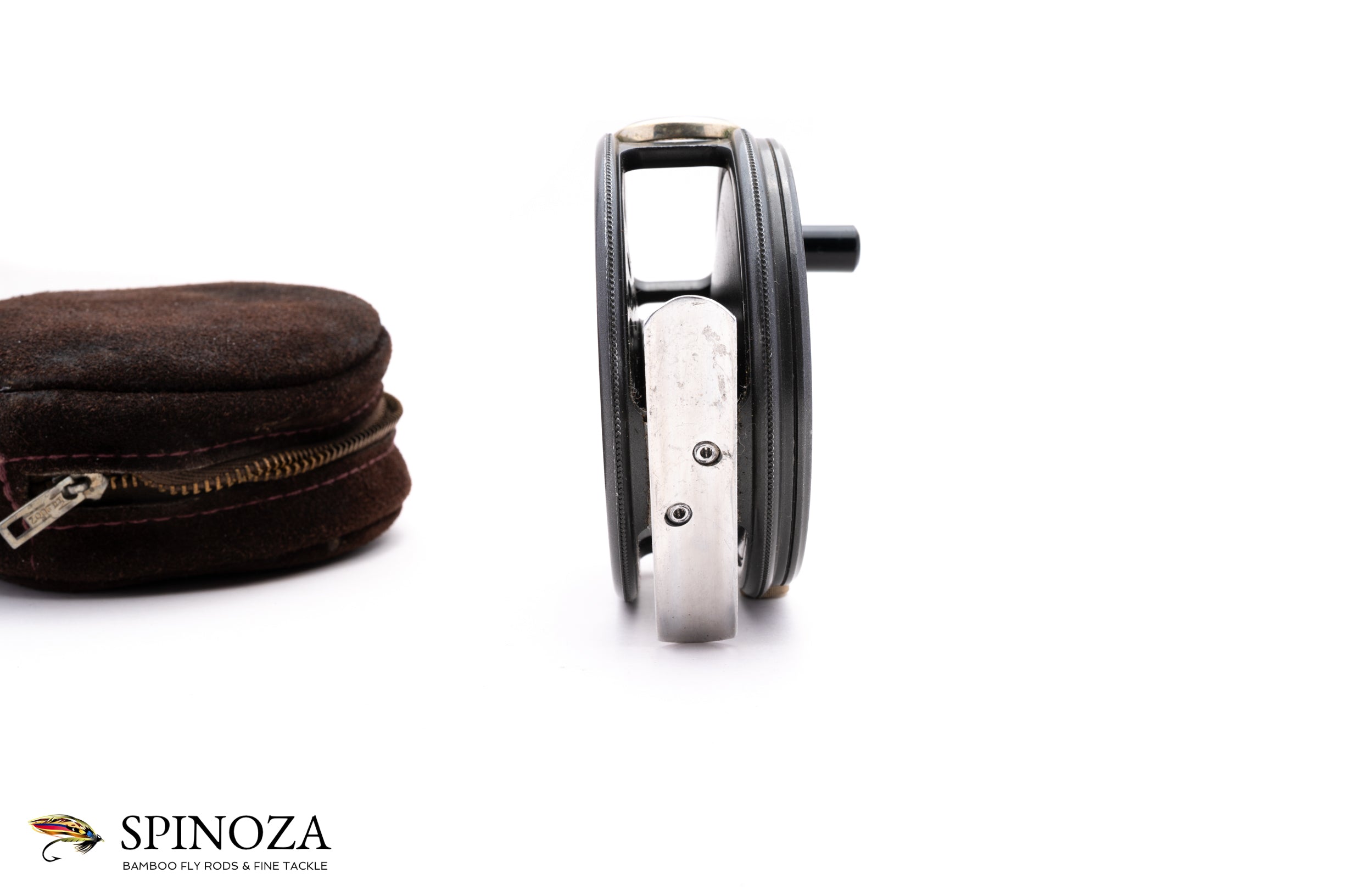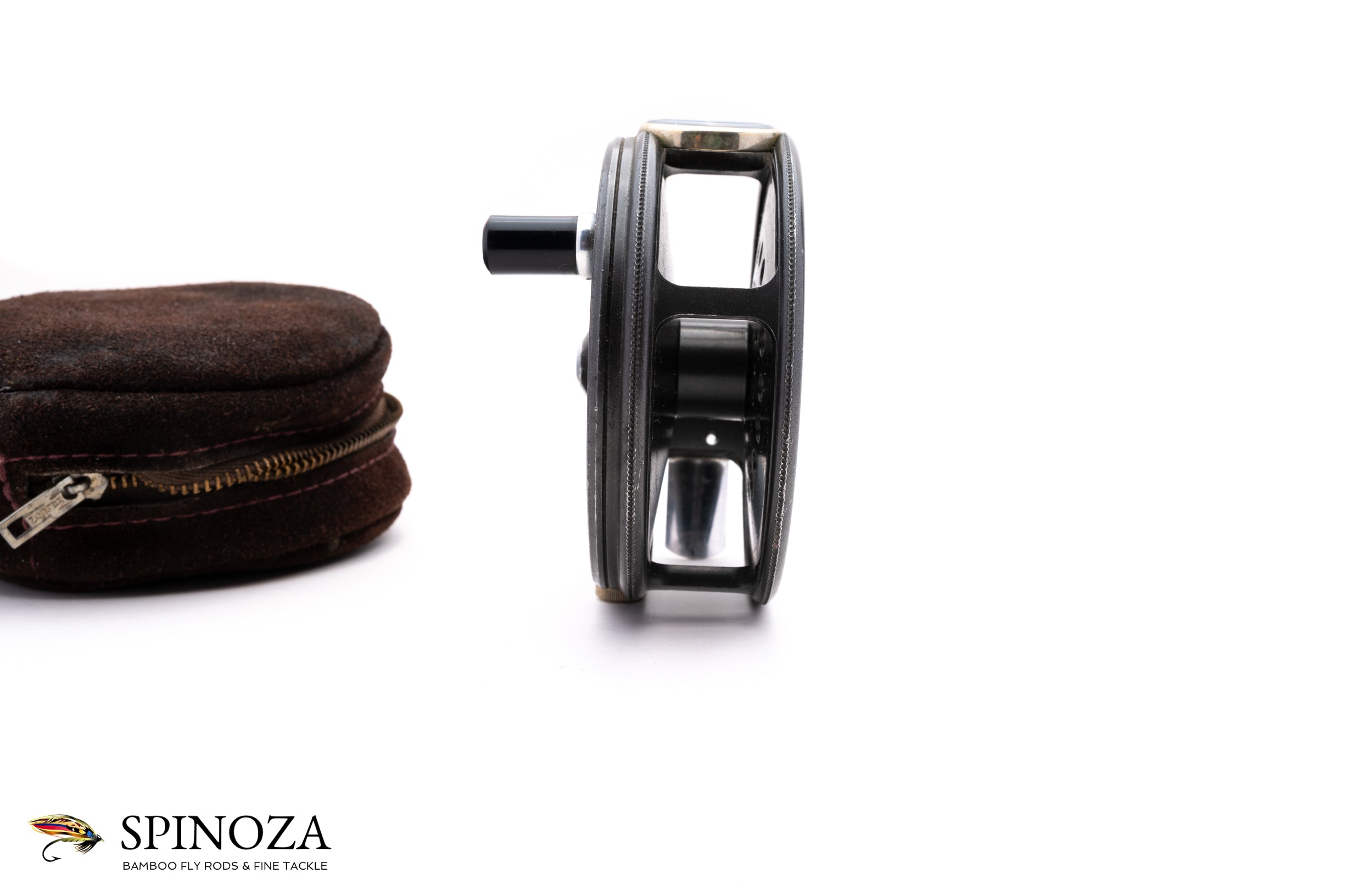 A nice Hardy Perfect fly reel, 3 3/8" diameter and set up for RHW. Enamel finish model. Good used condition with normal cosmetic wear to the finish but no major issues. The blue smokey agate on the lineguard is in great shape. Smooth alloy foot with an ebonite handle. There is a line sticker still affixed to the winding plate. The drag has a smooth pleasing click and the tensioner works as it should. Designed to hold #6/7/8 lines. The reel packs into a brown suede zipper pouch.