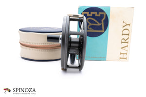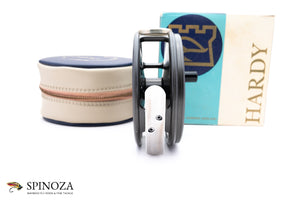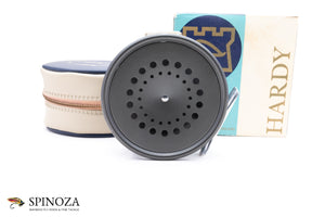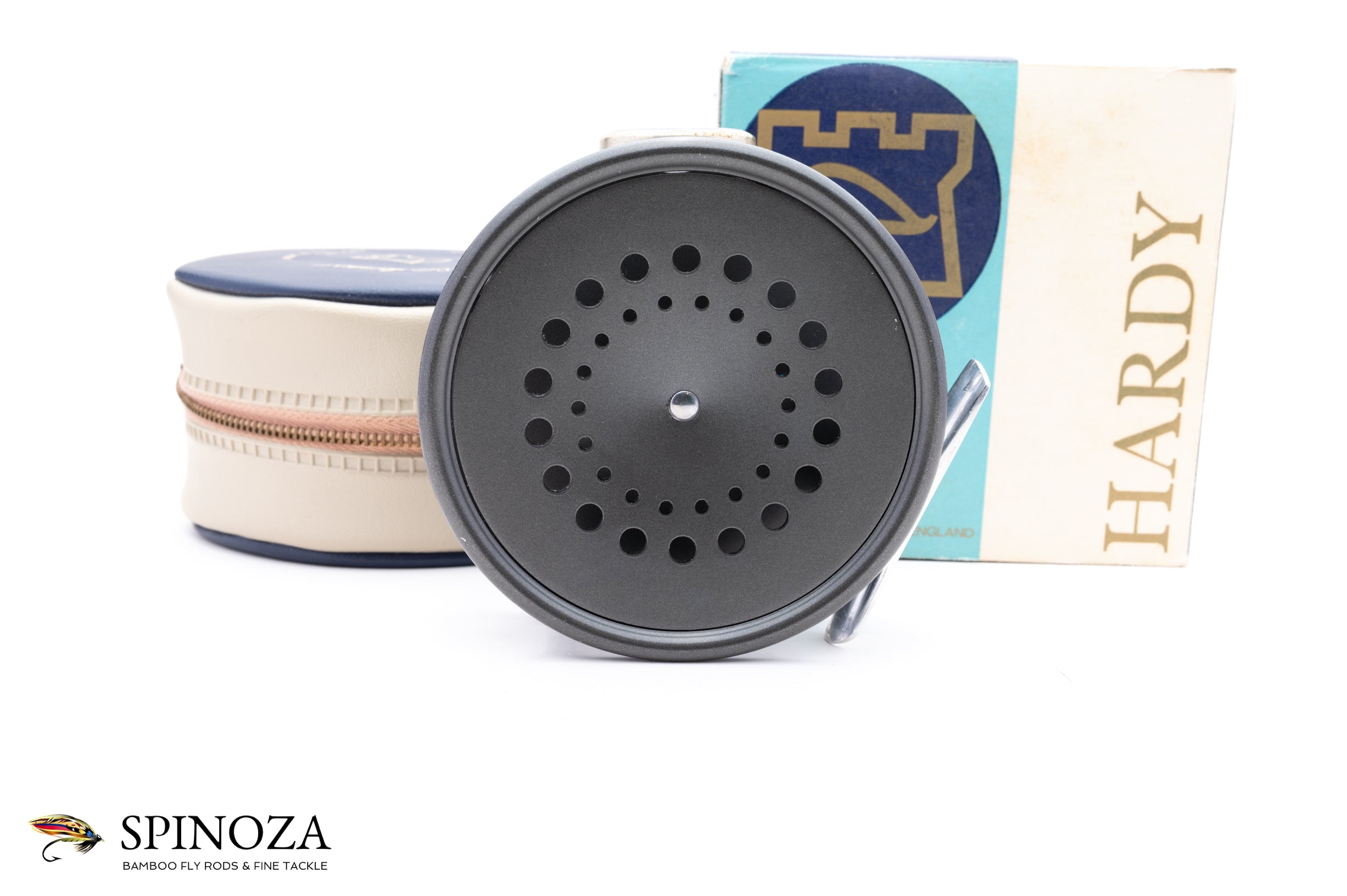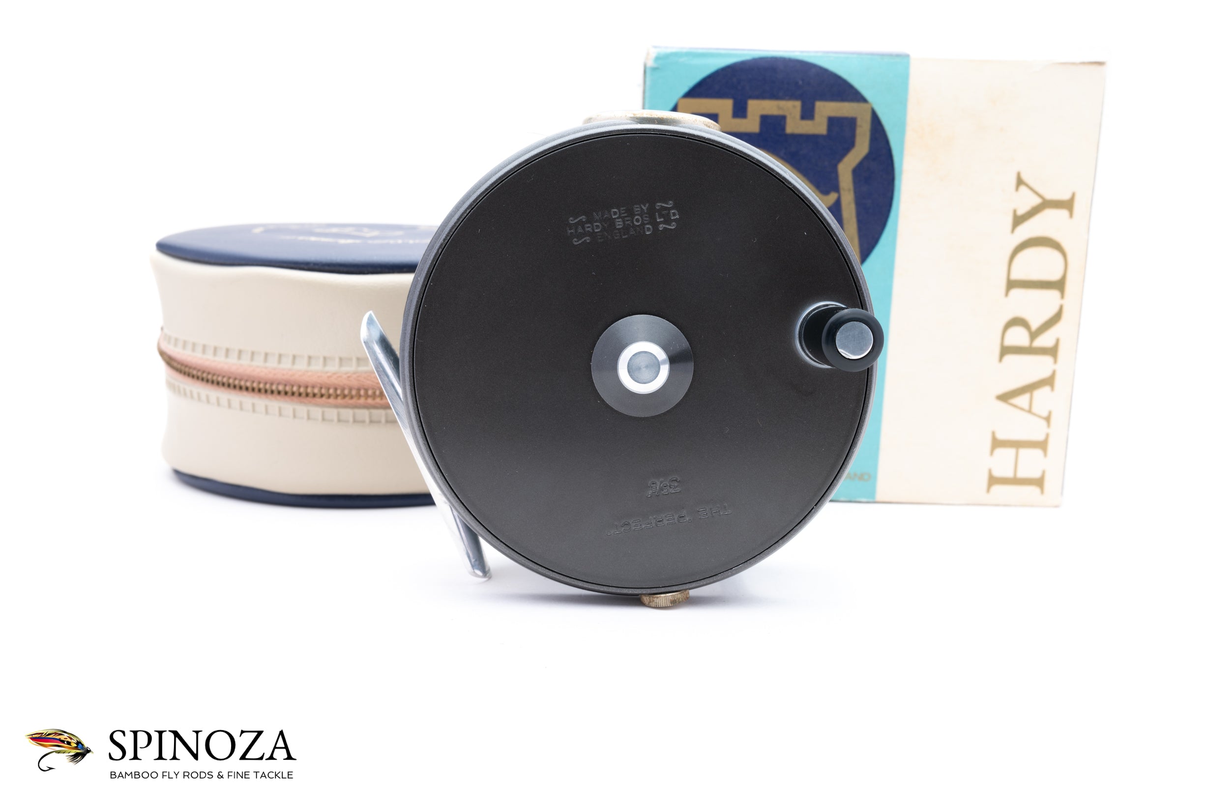A nice Hardy Perfect fly reel, 3 5/8" diameter and set up for RHW. Near mint, with a couple of tiny marks on the frame edge in one spot and some mounting marks on the foot, but the rest of the reel is pristine. This is a later enamel finish model. Smooth alloy foot with an ebonite handle. Agate line guard. The drag has a smooth pleasing click and the tensioner works as it should. Designed to hold #7/8/9 lines. The reel packs into the original navy and cream vinyl case and box. A fine example of this later model perfect.