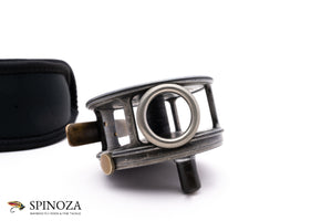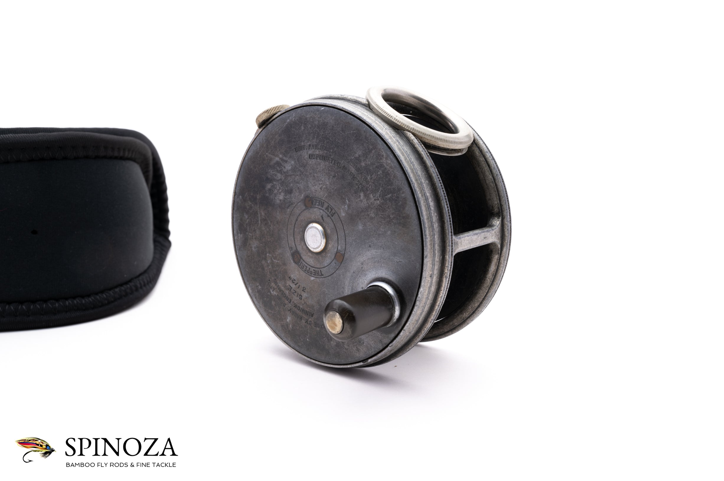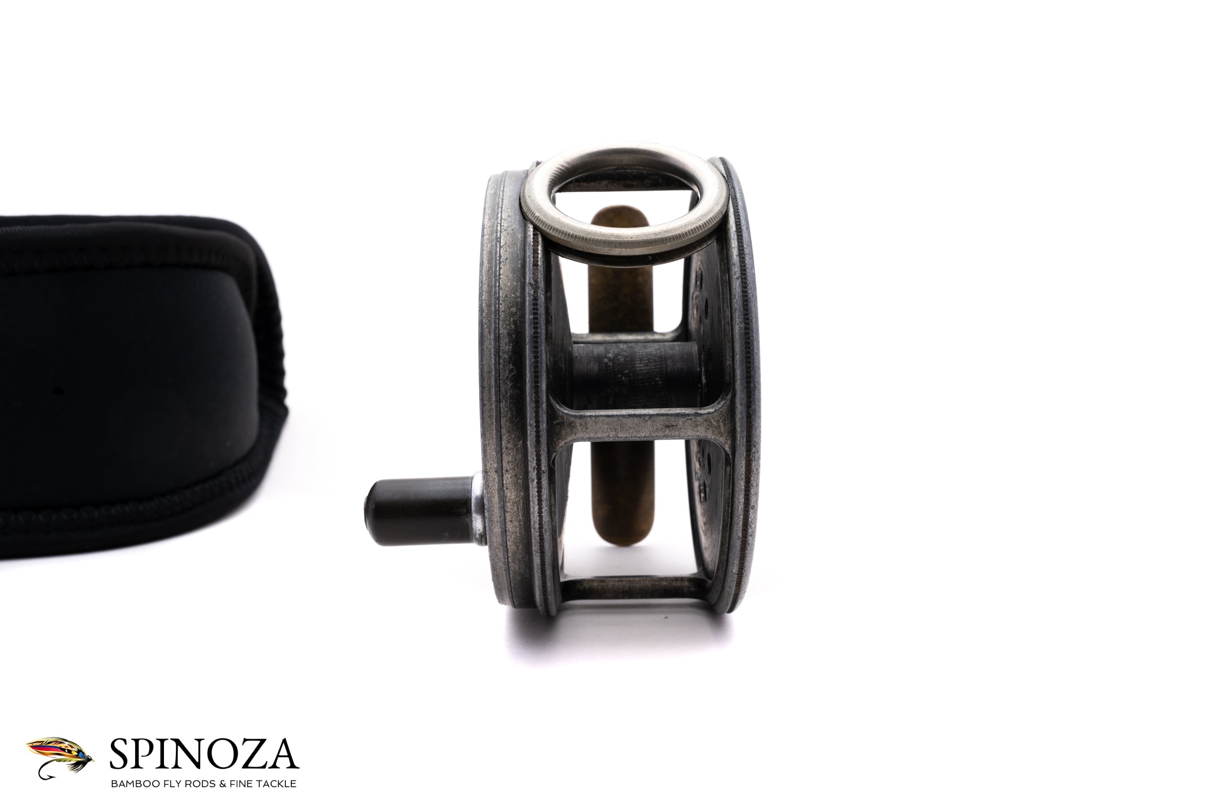 A very nice Hardy Perfect wide drum salmon reel, 3 1/2" and set up for the typical RHW. An early leaded finish reel in fine overall condition. Nickel silver line guard. Normal cosmetic wear throughout, with some loss of the finish in places but no significant issues that I could find. The brass spindle screw that holds the spool on looks to my eye to potentially be a replacement. Duplicated Mark II check with oversize pawls and the click is nice and smooth. Nice and tight with no play or wobble. Full length smooth brass foot. Ebonite handle. The tension adjuster works great. The reel packs into a modern Hardy black neoprene case for safe keeping. A nice example of this model with the coveted lineguard.