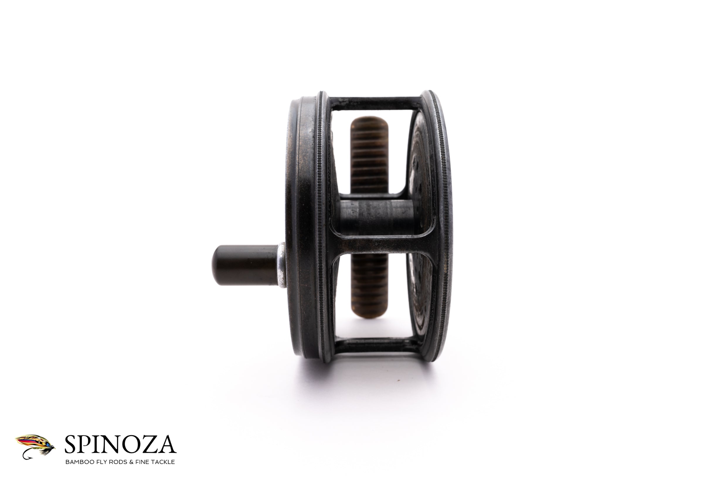 A very nice Hardy Perfect wide drum salmon reel, 3 1/2" and set up for the typical RHW. An early leaded finish reel in excellent overall condition. Normal cosmetic wear for its age but I could find no meaningful defects of any sort. Duplicated Mark II check with oversize pawls and the click is nice and smooth. Nice and tight with no play or wobble whatsoever. Full length ribbed brass foot. Ebonite handle. The tension adjuster works great. The reel packs into a modern Hardy black neoprene case (not pictured) for safe keeping. A nice example of this desirable model.