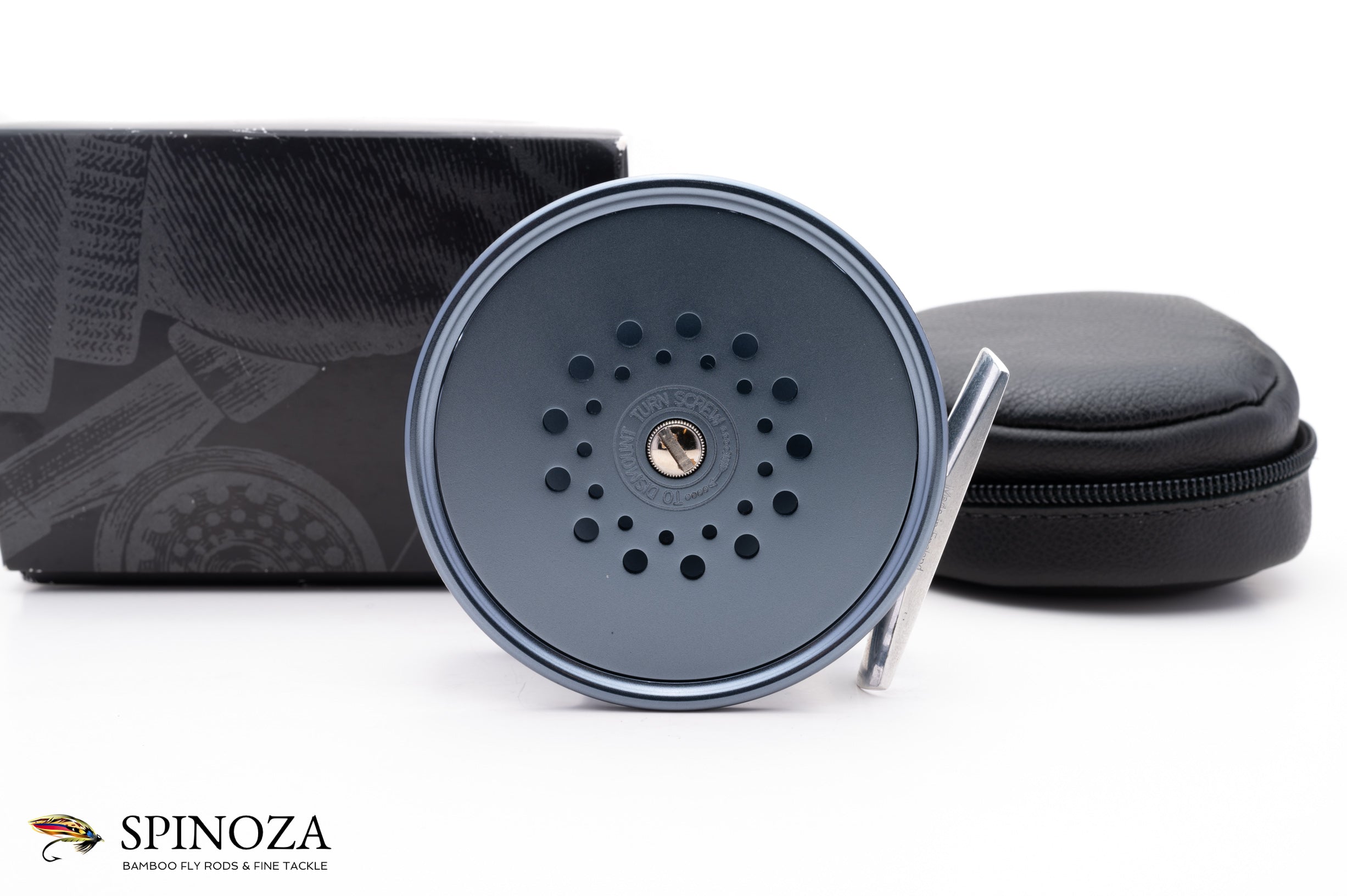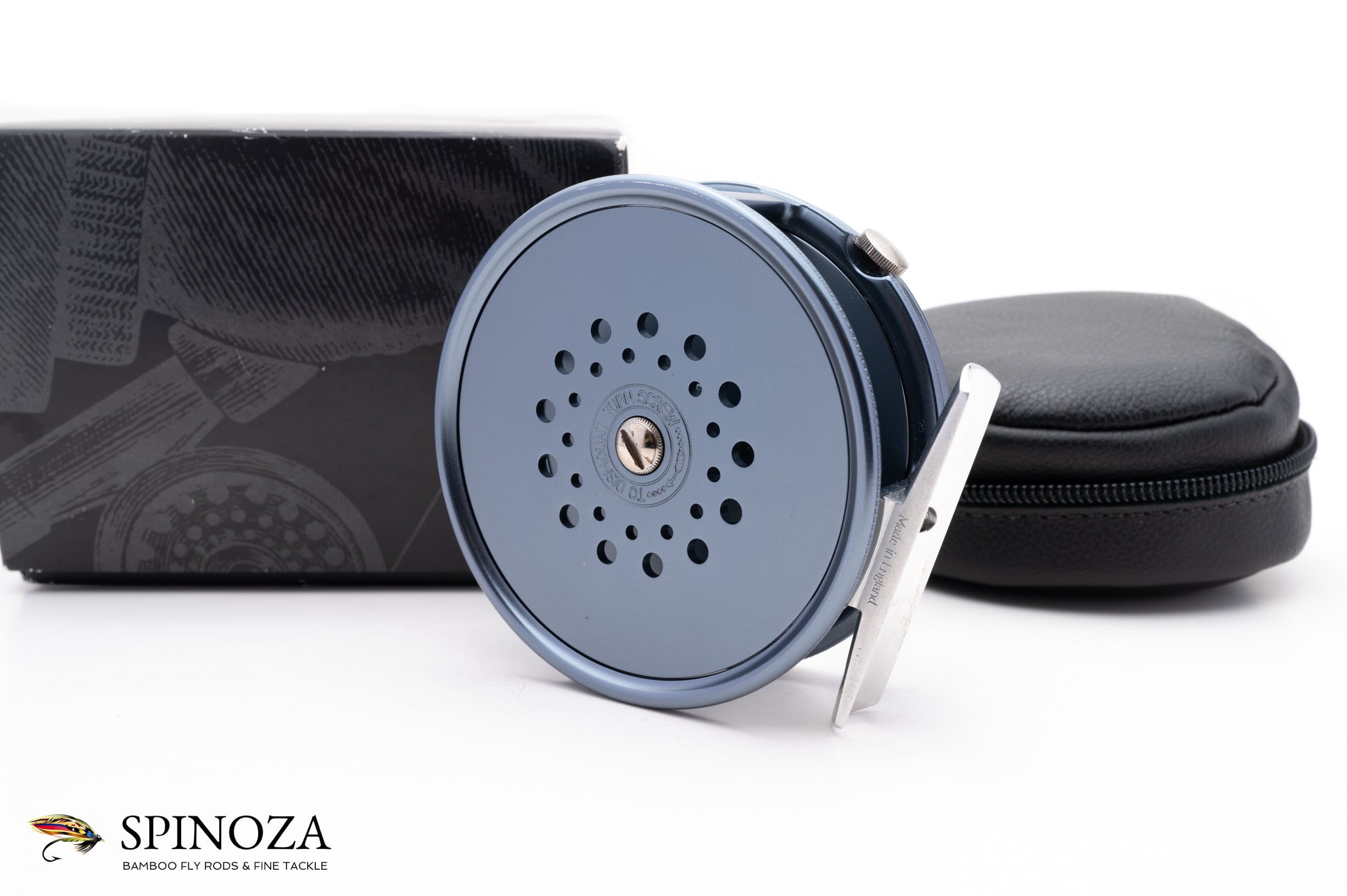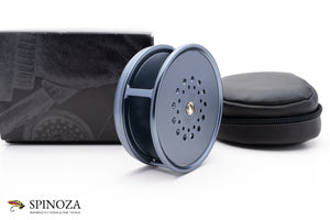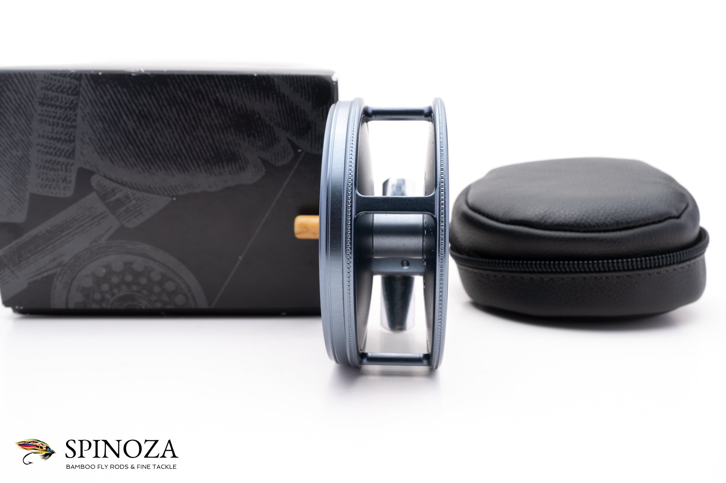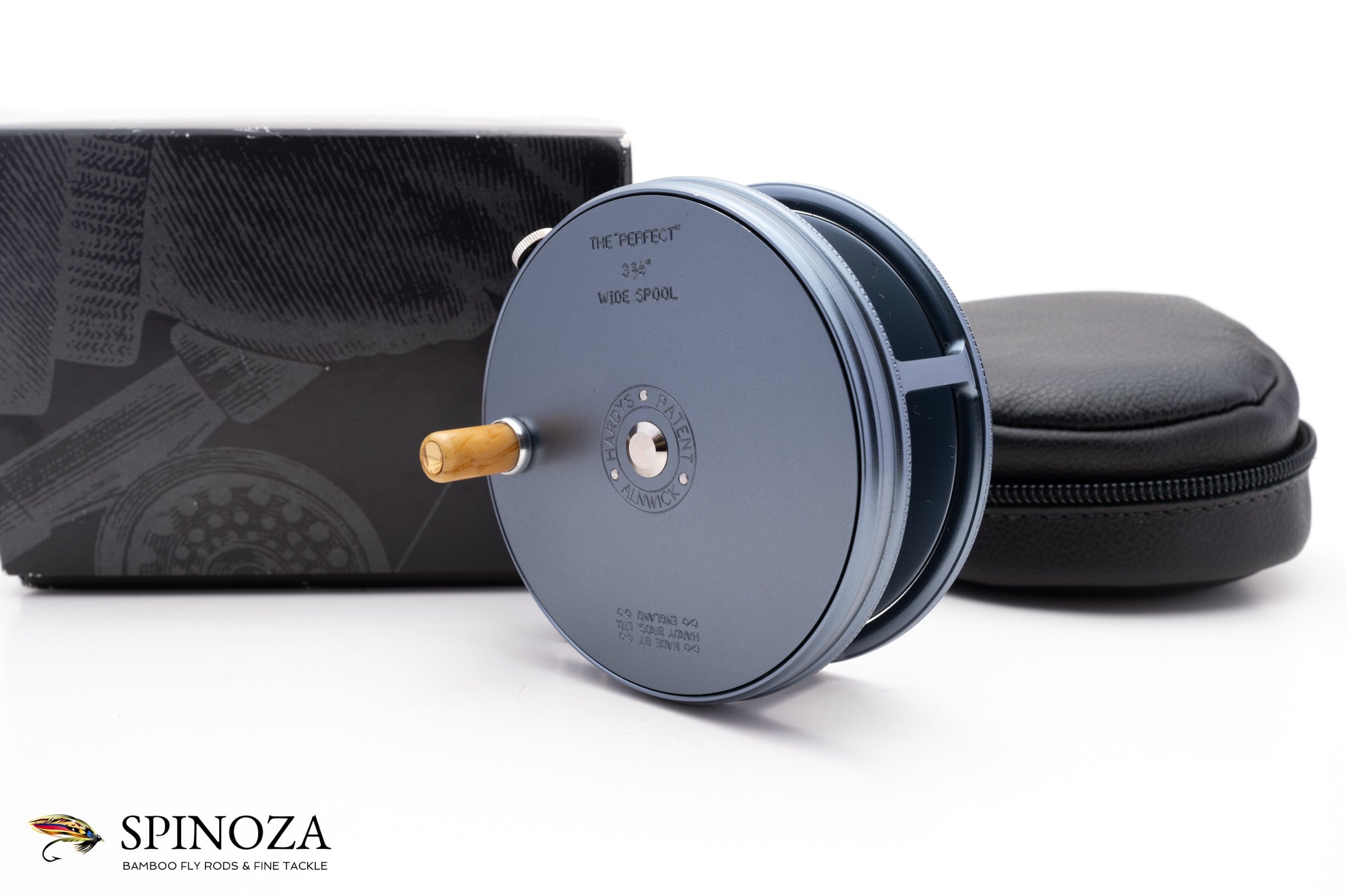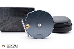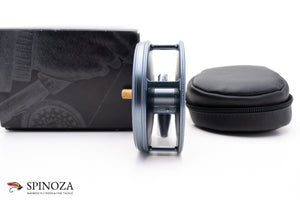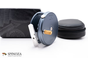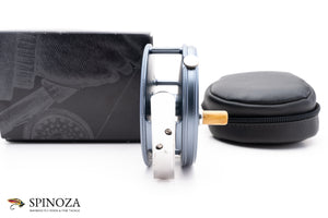 A nice Hardy Perfect Wide Spool fly reel, 3 3/8" diameter and currently set up for RHW (though easily reversible. This is one of Hardy's modern renditions of this classic model. Mint condition. Blue-gray anodized throughout with an alloy foot and ivorine style handle. Please click and pawl drag with a tension adjuster. The rod packs into the original box, zippered reel case, and papers including warranty card.