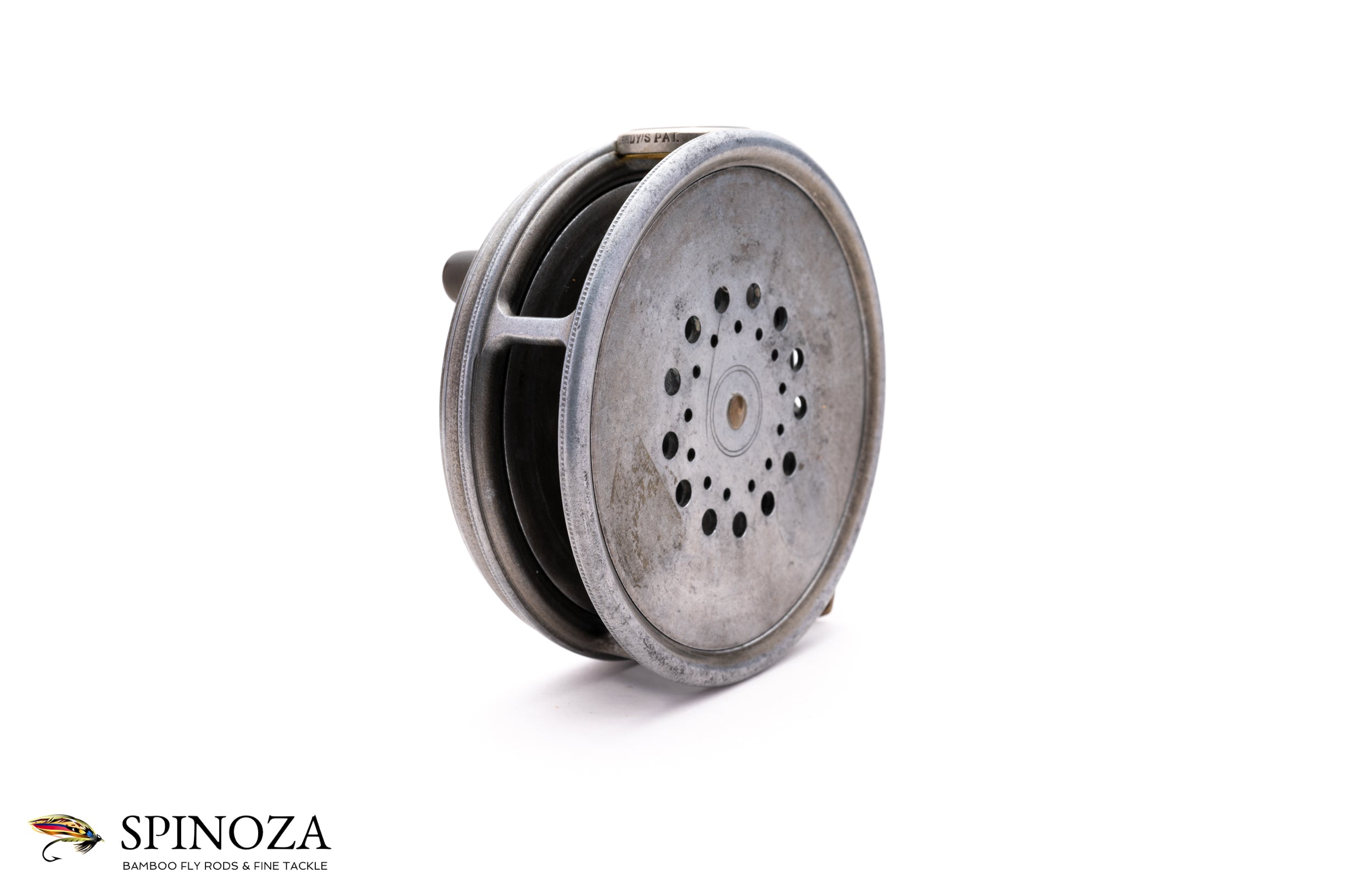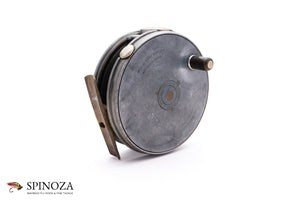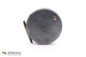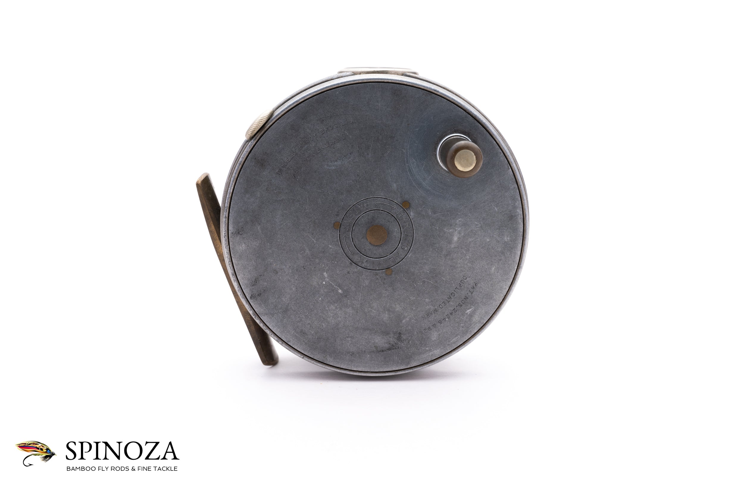 A nice Hardy Perfect fly reel, 3 5/8" and set up for RHW. Earlier leaded finish model. The reel has normal cosmetic wear throughout but no major defects that I could find. The agate lineguard has one hairline crack in it. Smooth brass foot and one end has a very slight upward bend in it, though it should mount just fine and not impact its use (someone has also inked a few numbers with a sharpie on the underside of the foot, though this could be removed if desired). Brown handle. Duplicated Mk II check. Mechanically the reel is sound, with the pleasing characteristic Hardy click. The drag tensioner works well. No pouch.
