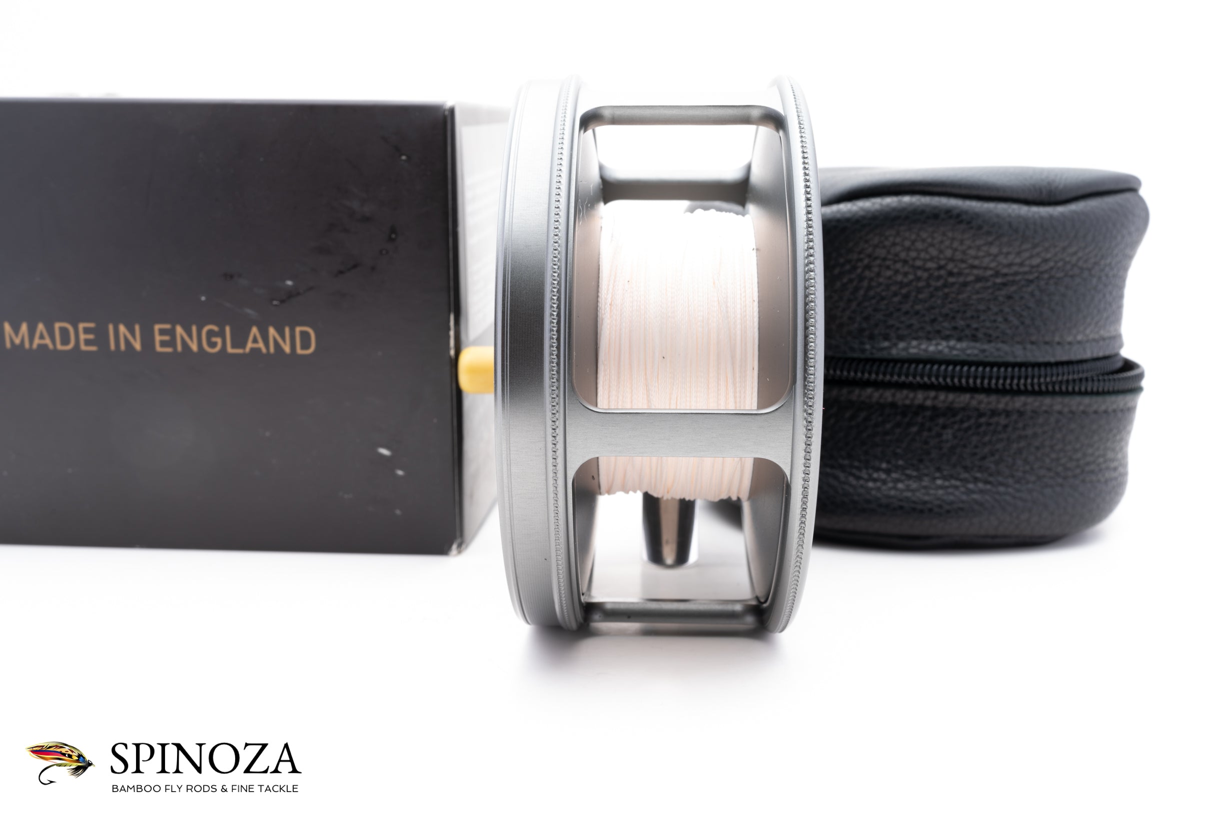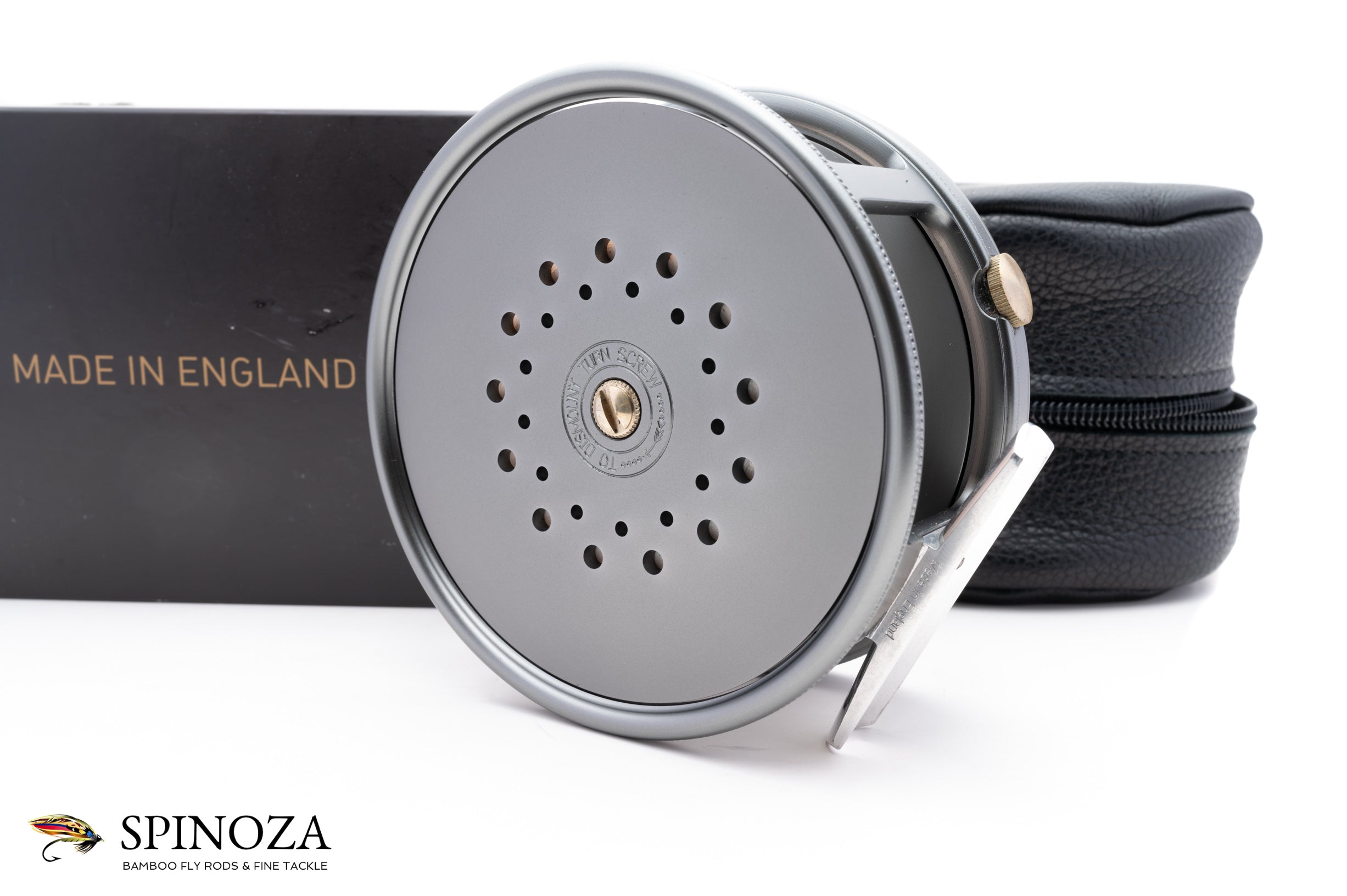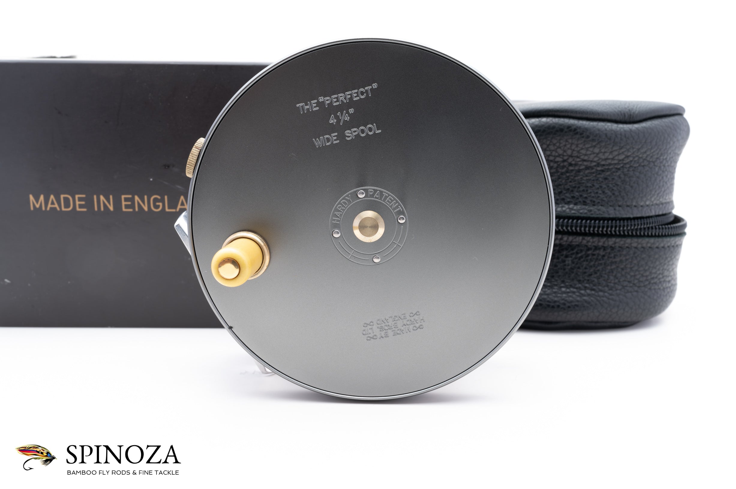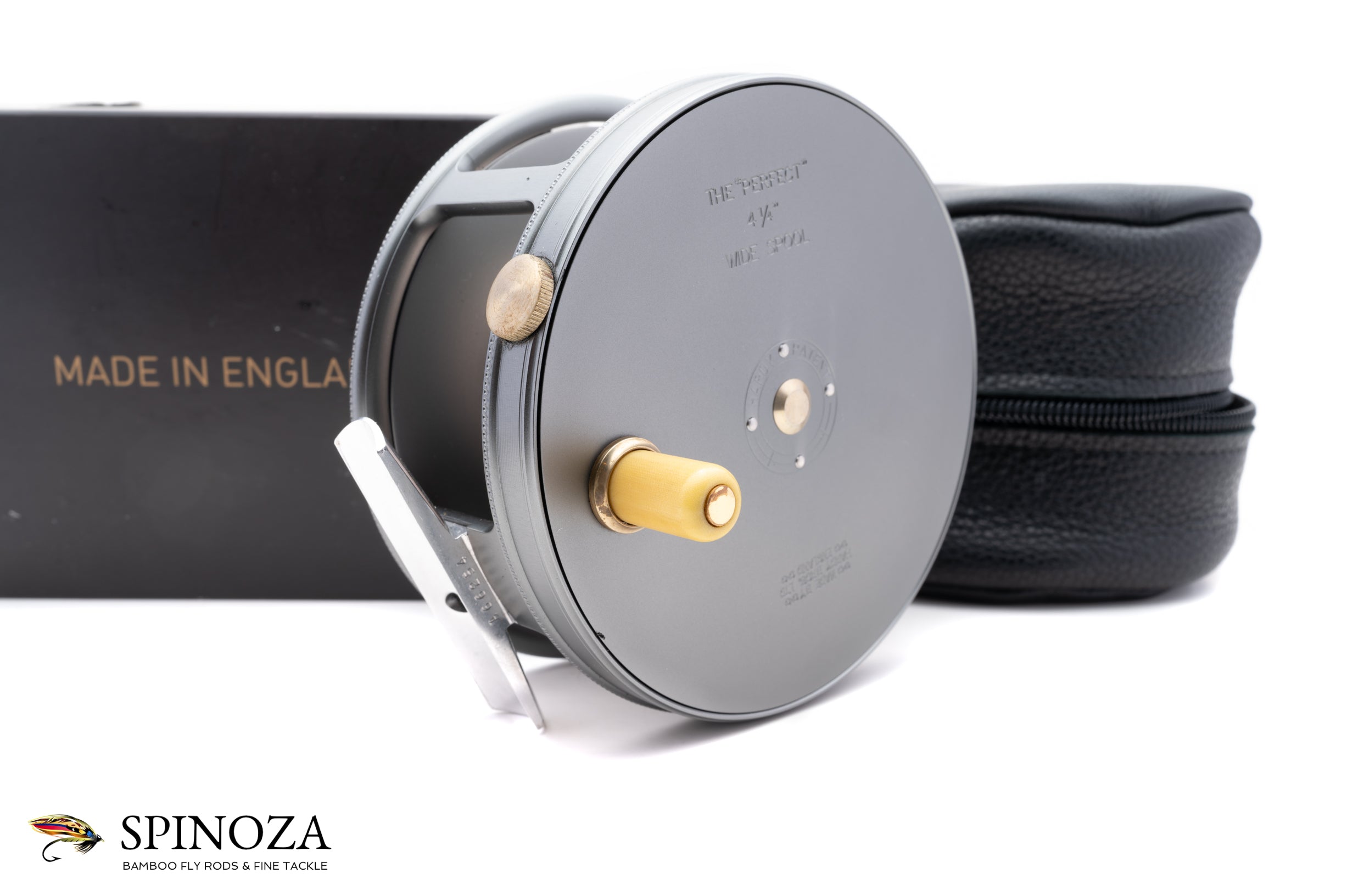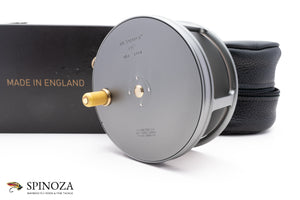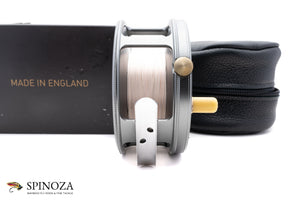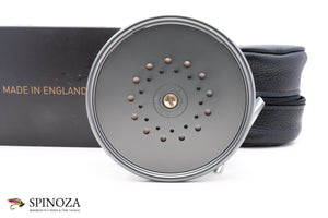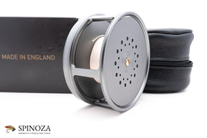 A nice Hardy Perfect salmon reel, 4 1/4" diameter and set up for LHW (though easily reversible). This is a modern reissue of this classic salmon model. There is backing loaded on the reel and some very faint scuffs on the foot edges but I could find no other signs of use on the reel. I suspect it was loaded and fitted to a rod but never fished. Gray anodized throughout with an alloy foot and an ivorine handle. Pleasing fixed check drag. The reel packs into the original black leather pouch and box with paperwork (the box has a tear in one area on the top but is completely functional).