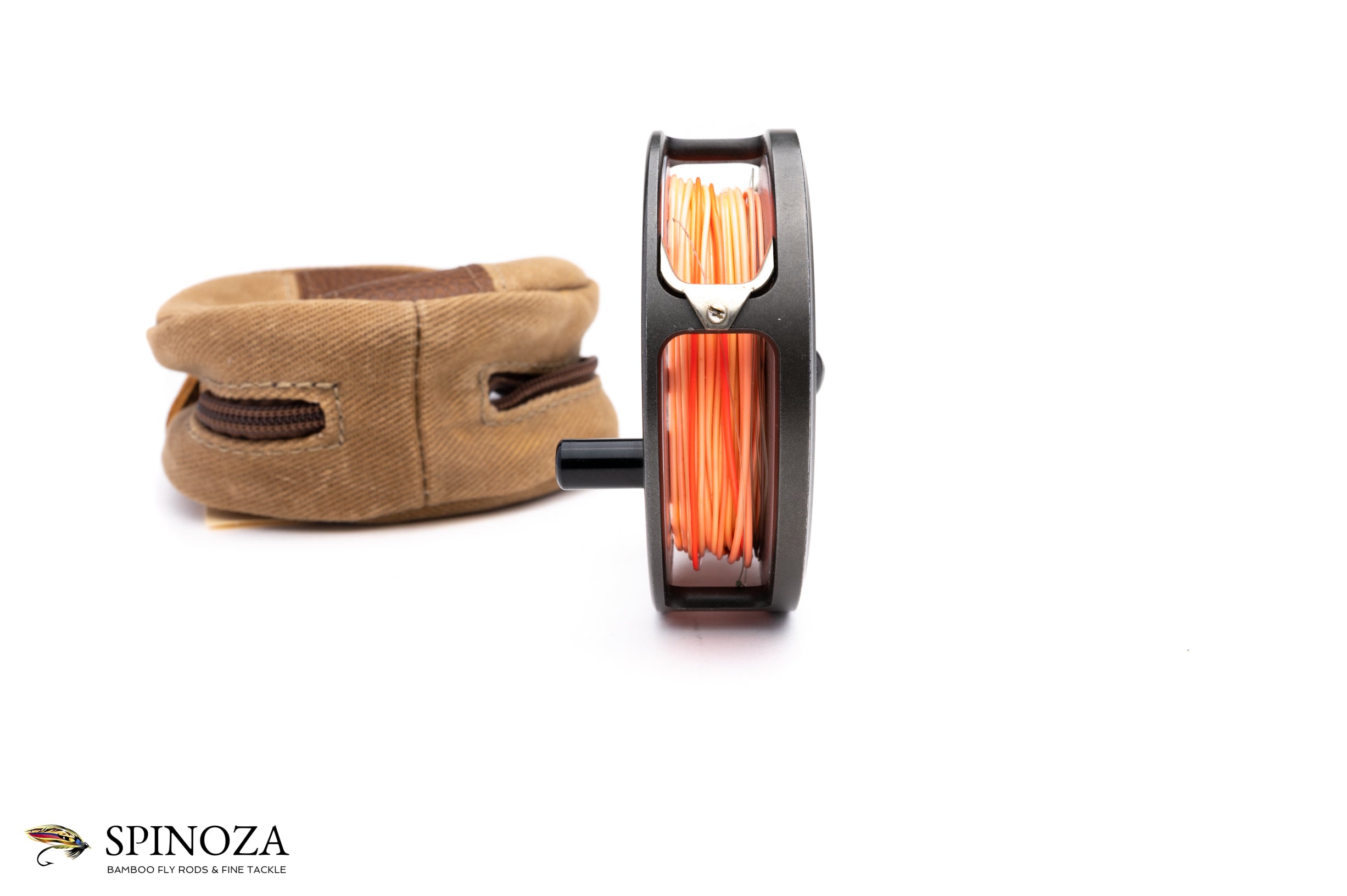 A nice Hardy Princess fly reel set up for LHW (though easily converted by reversing the pawls). 3 1/2" diameter and with a catalog weight of 4.5 ounces (this one has backing and a line on it and weighs 5.8 ounces). Near mint condition bordering on true mint - a few tiny marks on the foot suggest that it may have been mounted on a rod at one point, but I can find no sign on the rest of the reel that it's been used. The frame, spool, etc., are pristine. Mechanically superb with a nice click. Designed to hold up to a DT7+50, or DT6+70. The reel packs into a non-original LL Bean canvas zipper fleece-lined pouch.