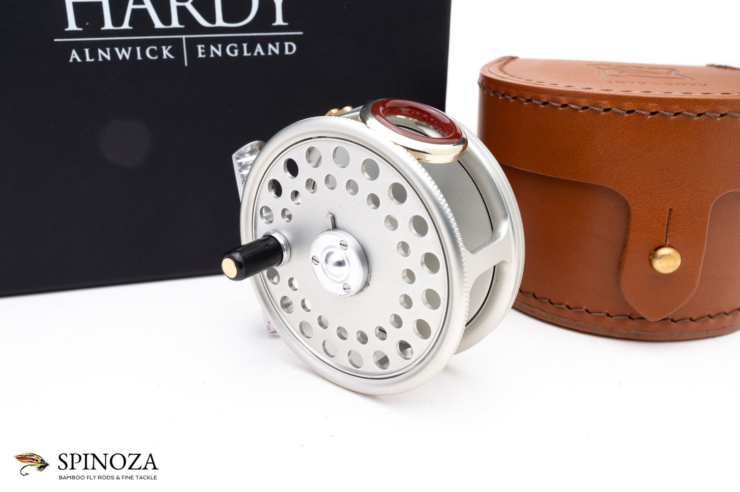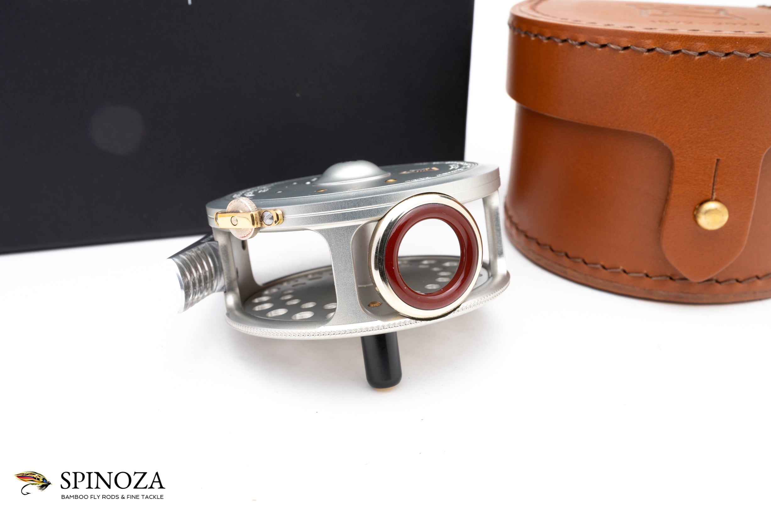 A recently released Hardy St George 150th Anniversary reel in a handsome spitfire finish. Hardy released this limited set of 150 reels as part of the company's 150th's anniversary celebration. 3" diameter and set up for RHW with a handsome red agate lineguard. 1928 foot with the famous 1912 check design. This reel is #032 of the 150 reels released. The reel comes in a handsome leather clamshell case and a nicely designed box with paperwork. Made in England. A nice option here for a Hardy fan to add a very well done limited edition offering to your collection.