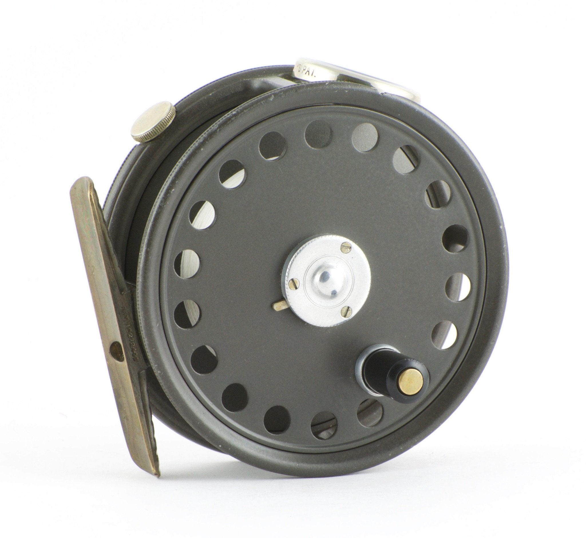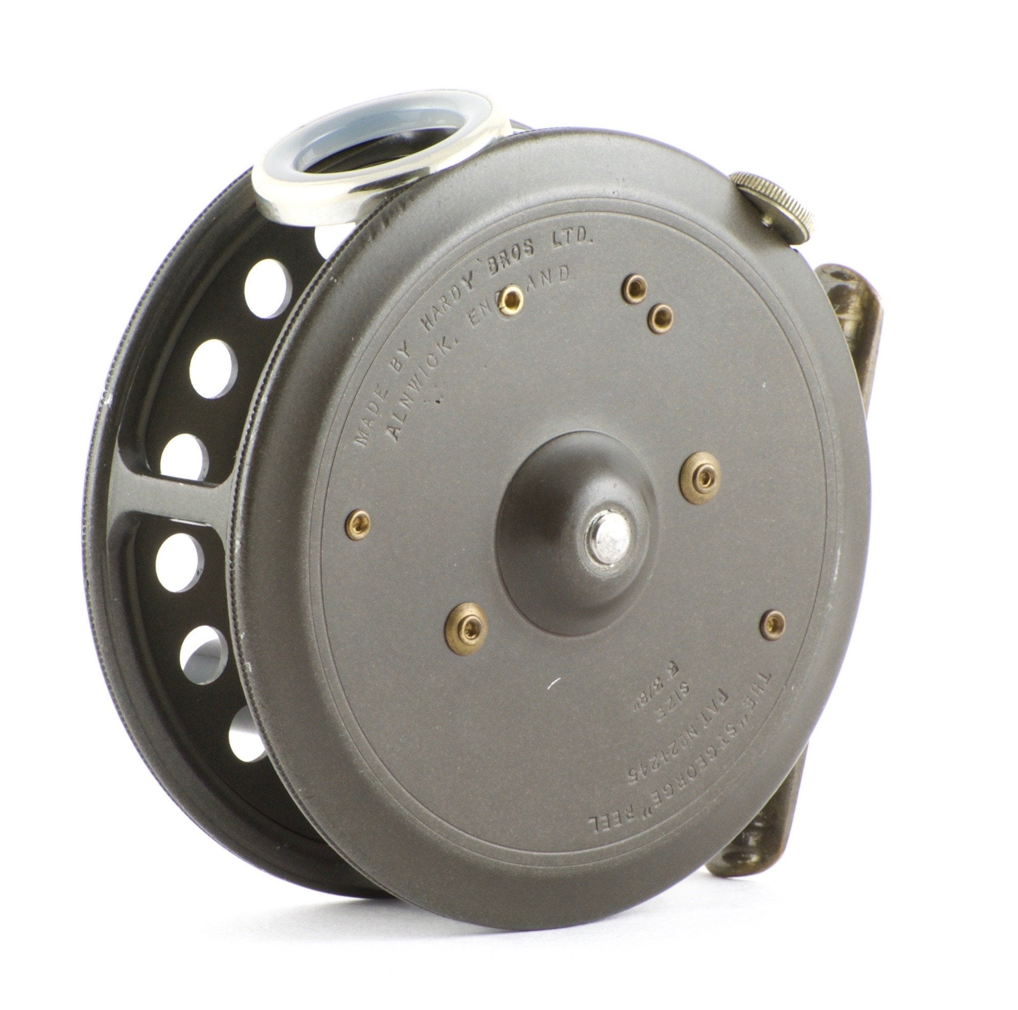 For sale here is a Hardy St. George 3 3/8" fly reel with the Duplicated MKII check and unblemished agate line guide. Large arbor. Enamel finish. Full length and unaltered ribbed brass foot. Ebonite handle spins freely. Tensioner works perfectly. No line burns. No cracks/chips/dings. No problematic wobble or end play. EXCELLENT CONDITION!