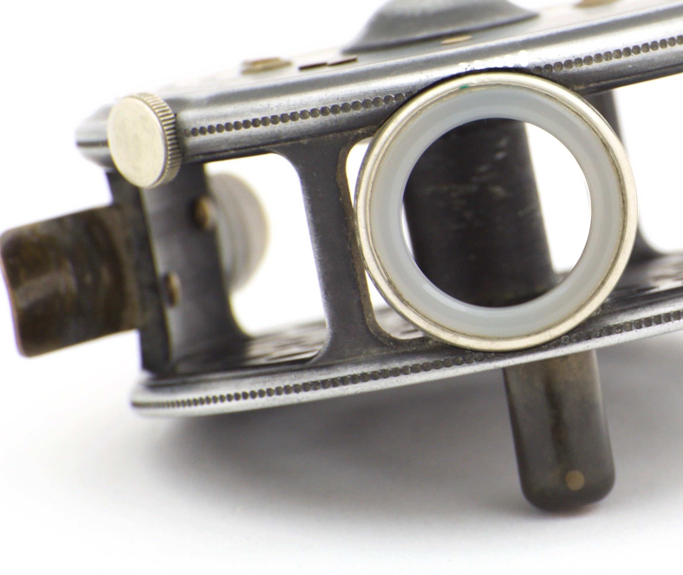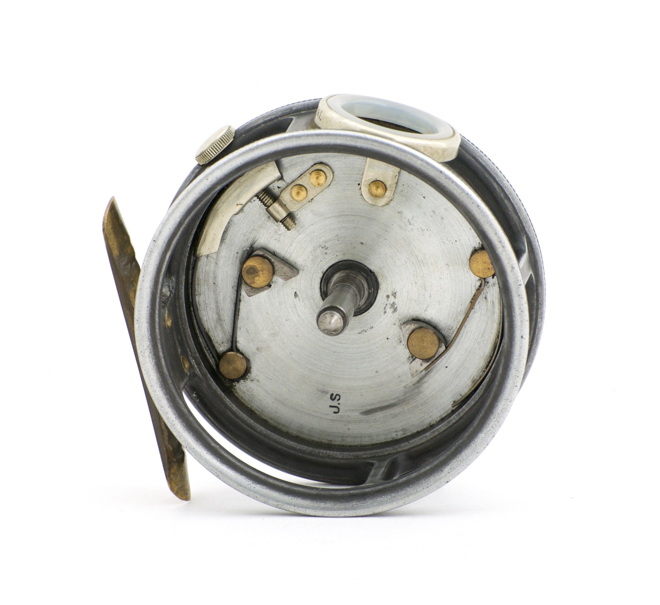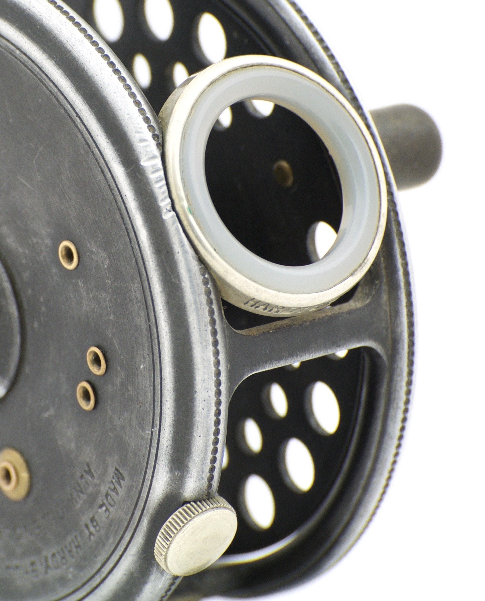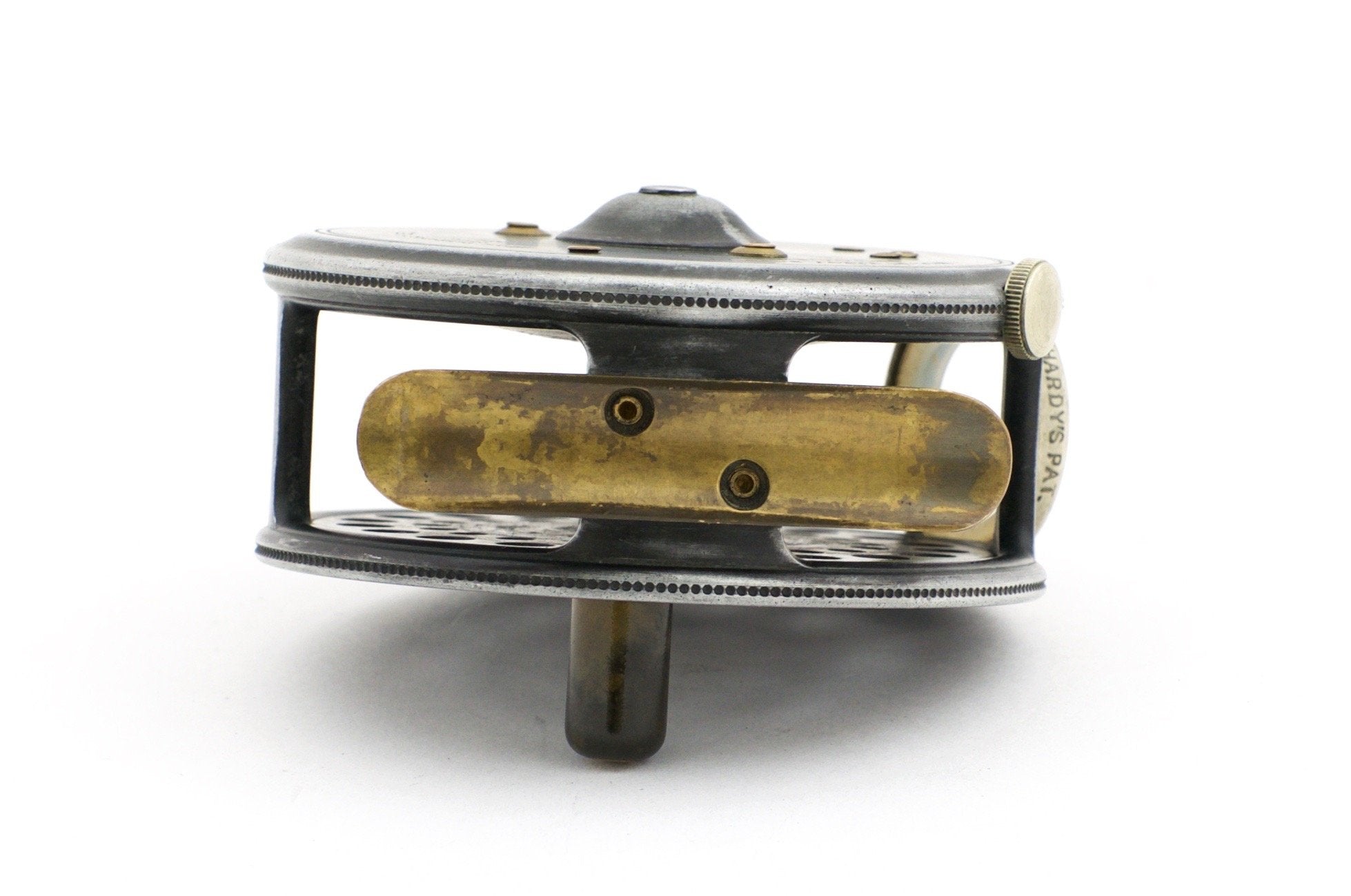 For sale here is a Hardy St. George 3 inch fly reel with three-screw latch. Pre-WWII. Excellent condition throughout. A majority of the leaded finish remains. Ribbed brass foot and MKII check. No cracks, chips, or dings. The agate line guide is free of cracks. The tension regulator works as intended. Nice strong check throughout its range and a nice and tight spool/spindle fit. The brass foot has been slightly shaped on both ends but remains straight and smooth.