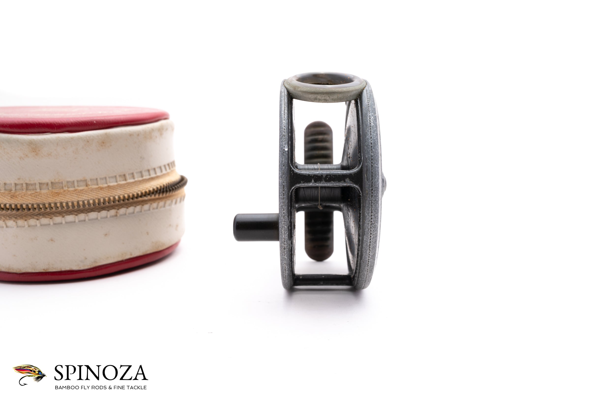 A Hardy St George fly reel, 3" diameter and set up for RHW. Two-screw model. Fair condition with loss of finish in a number of places and the nickel silver portion of the line guard could use some cleaning (the agate looks to be in good shape). Ribbed brass foot. Enamel finish model. Comes in a red and cream Hardy vinyl pouch.